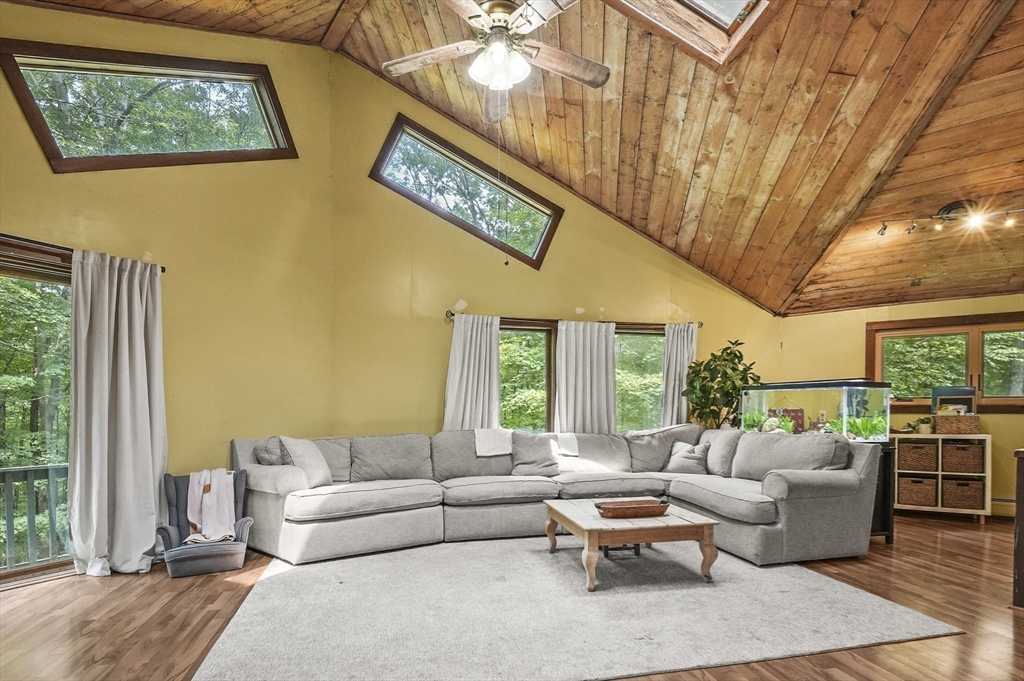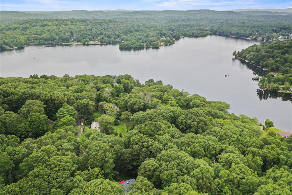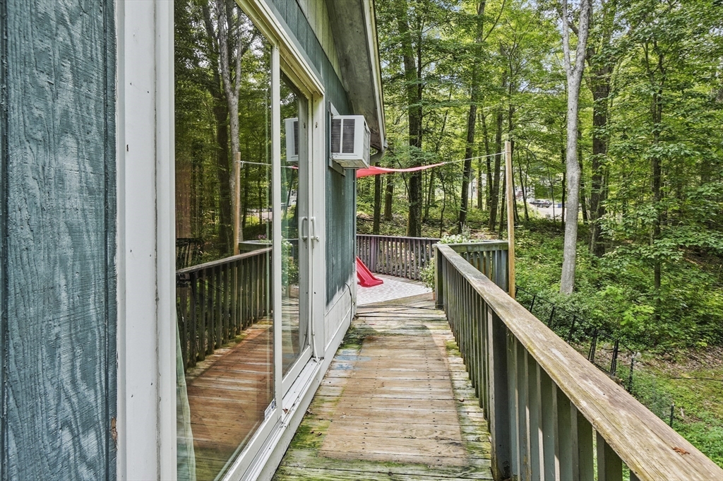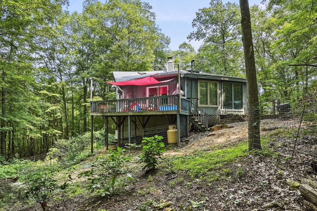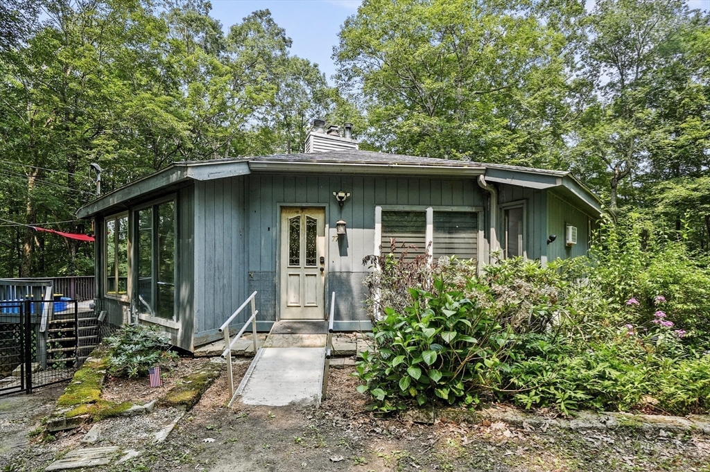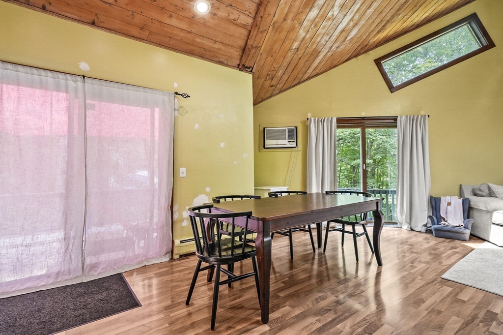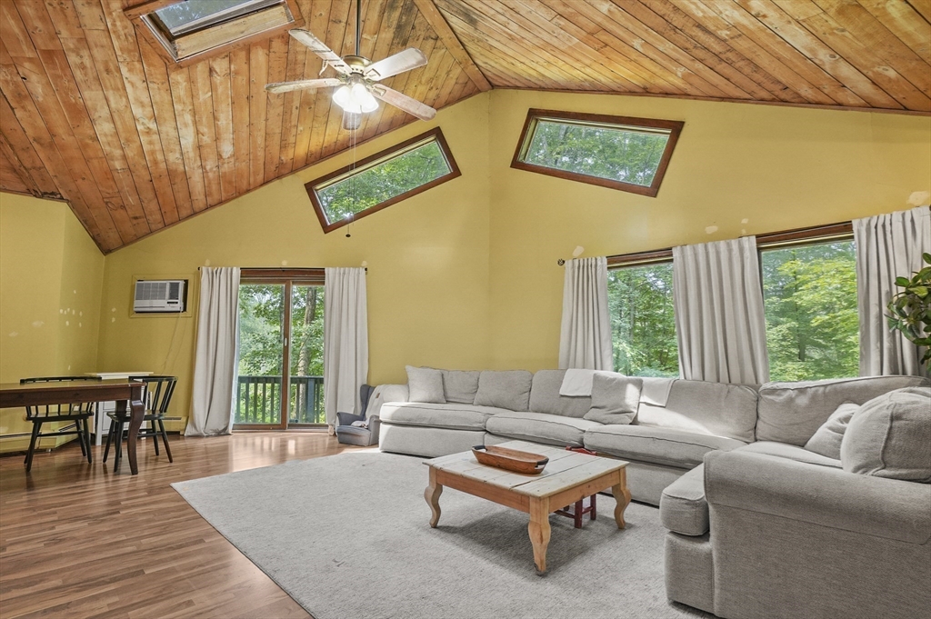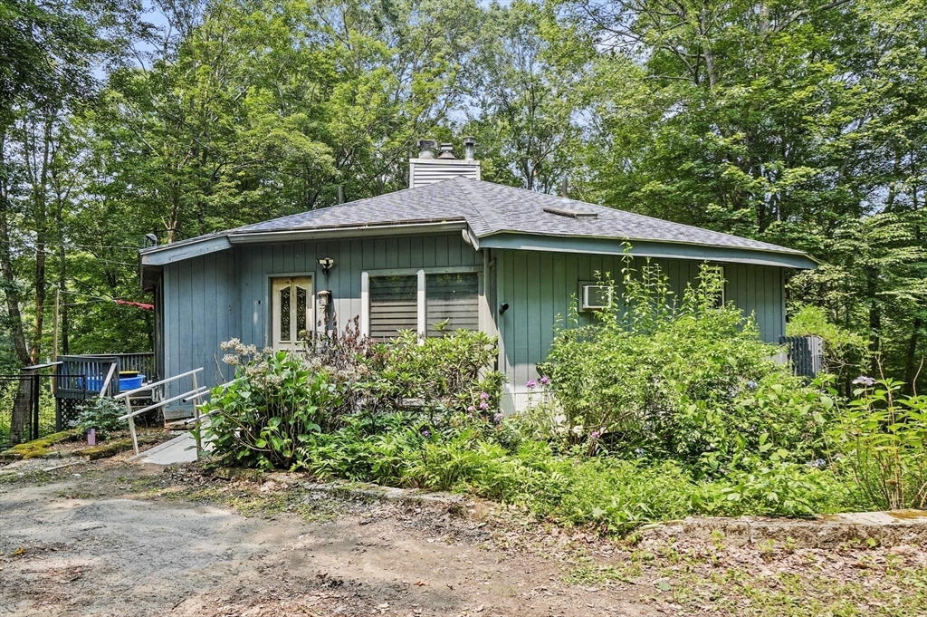Enjoy seasonal water views from this one of a kind contemporary home, nestled on just under an acre near Hamilton Reservoir and scenic nature trails. Located close to the Sturbridge line, with easy access to Rt.84 for commuters. The open living room welcomes you with soaring cathedral ceilings, skylights, a gas fireplace, and sliders leading to the expansive deck. The space flows into the dining area and kitchen with a beamed ceiling, granite countertops, stainless steel appliances including a gas stove, new refrigerator and tile backsplash. The main bedroom features skylights, vaulted ceiling, and a private balcony, while the second bedroom offers its own skylight and custom built-ins. Two full baths for convenience. The finished lower level adds a spacious bonus room with a pellet stove—ideal for a family room, studio, or guest space. With plenty of off-street parking, a screened porch, a large deck, and a chicken coop, and shed, this home is a peaceful and relaxing retreat