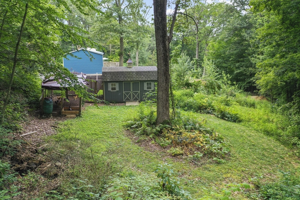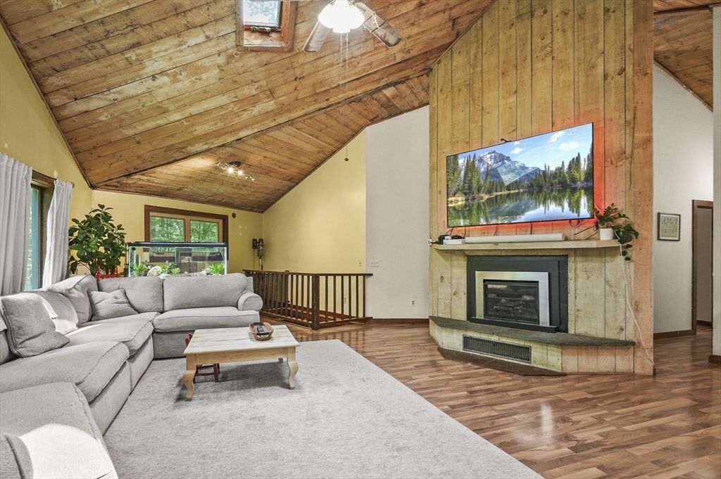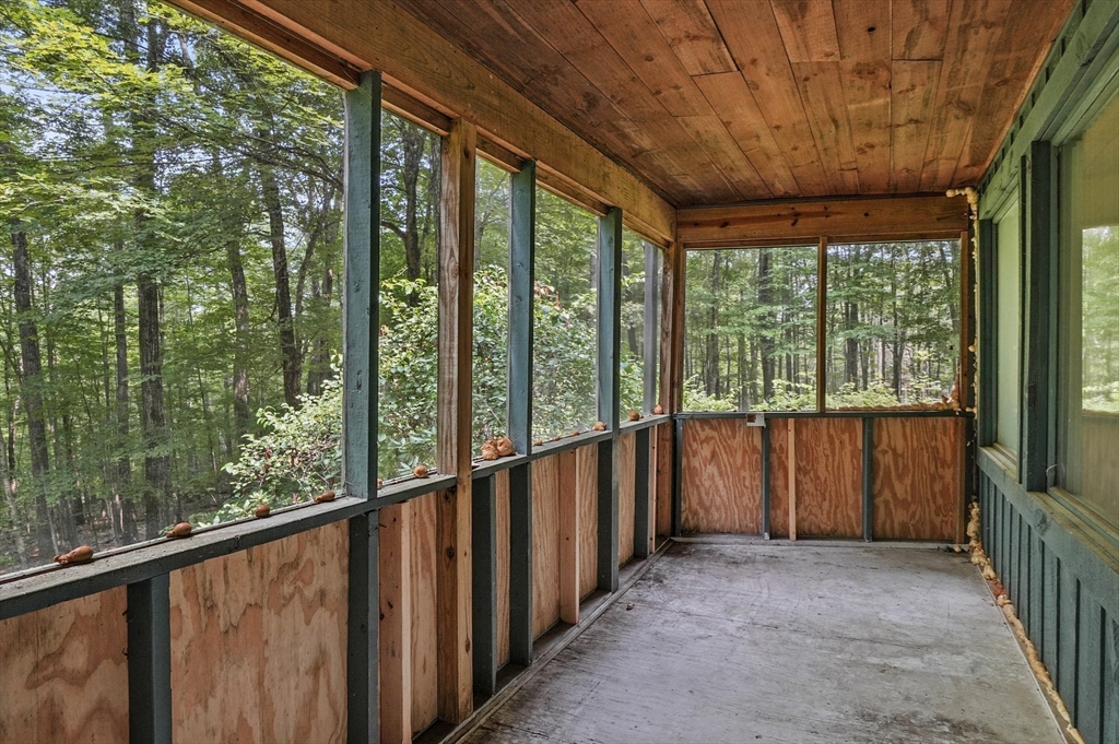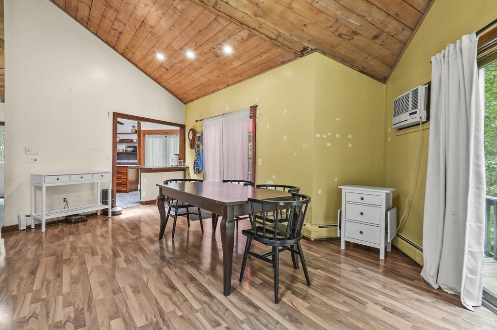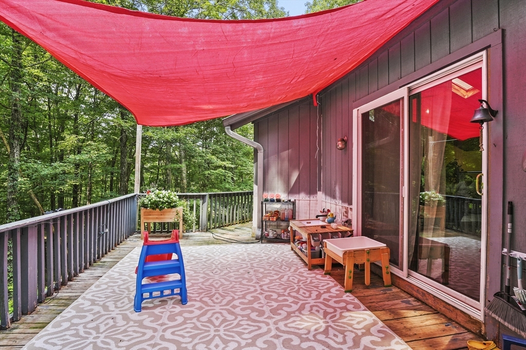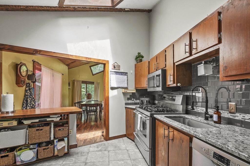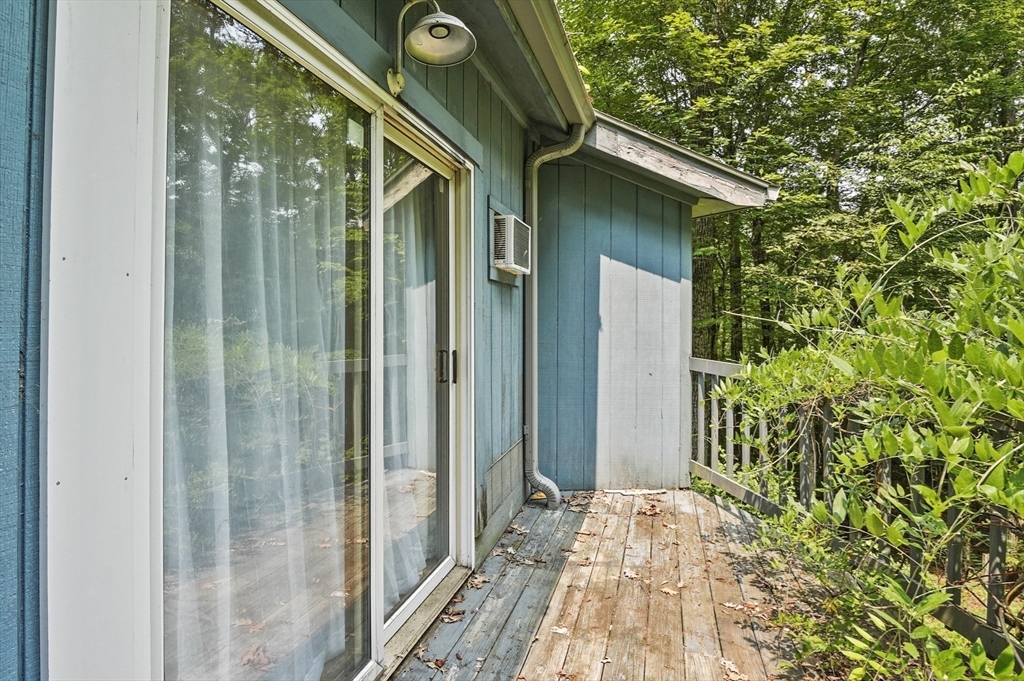 Enjoy seasonal water views from this one of a kind contemporary home, nestled on just under an acre near Hamilton Reservoir and scenic nature trails. Located close to the Sturbridge line, with easy access to Rt.84 for commuters. The open living room welcomes you with soaring cathedral ceilings, skylights, a gas fireplace, and sliders leading to the expansive deck. The space flows into the dining area and kitchen with a beamed ceiling, granite countertops, stainless steel appliances including a gas stove, new refrigerator and tile backsplash. The main bedroom features skylights, vaulted ceiling, and a private balcony, while the second bedroom offers its own skylight and custom built-ins. Two full baths for convenience. The finished lower level adds a spacious bonus room with a pellet stove—ideal for a family room, studio, or guest space. With plenty of off-street parking, a screened porch, a large deck, and a chicken coop, and shed, this home is a peaceful and relaxing retreat