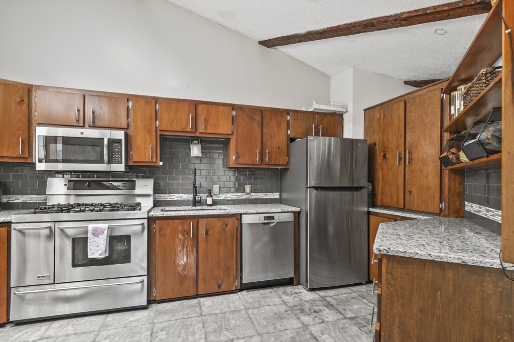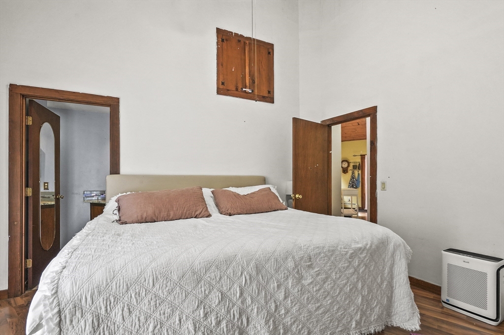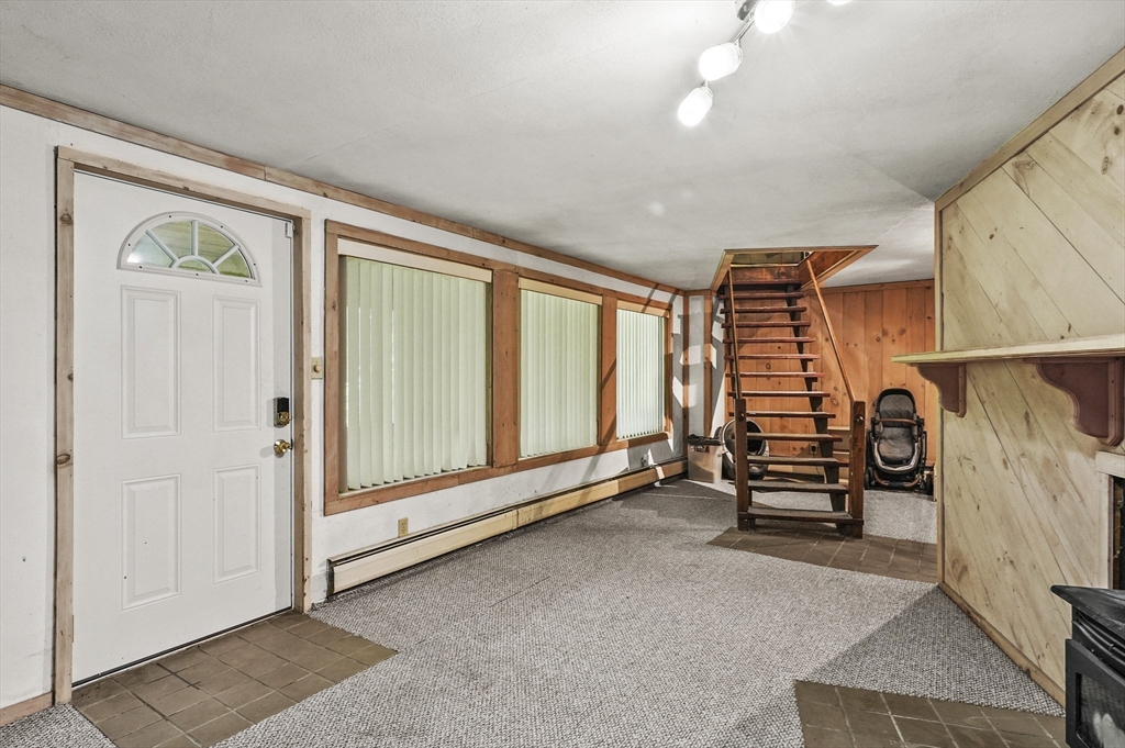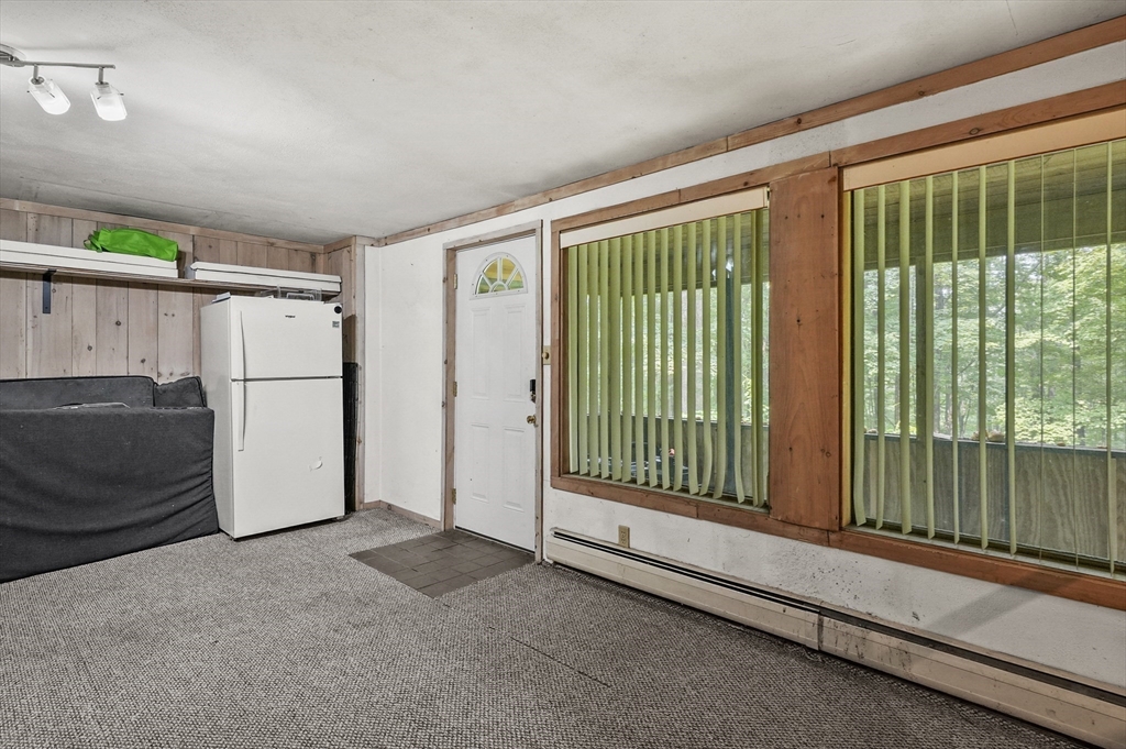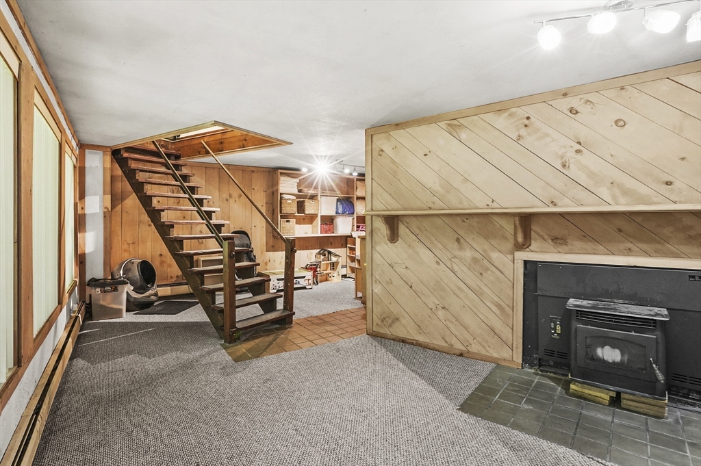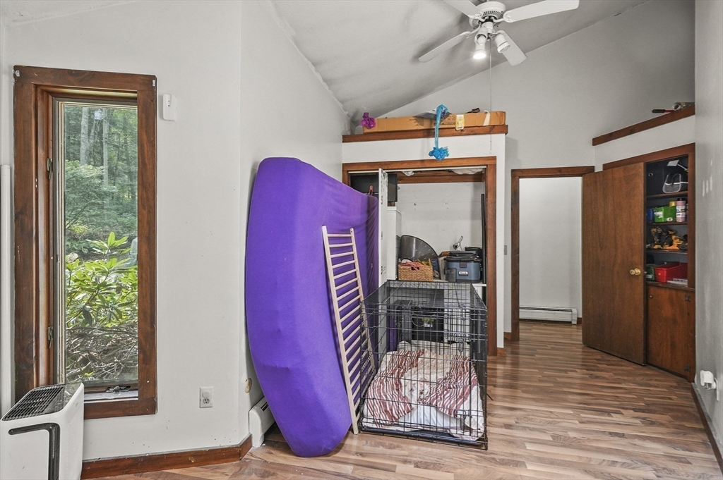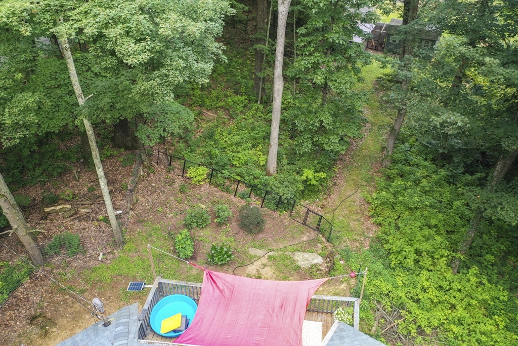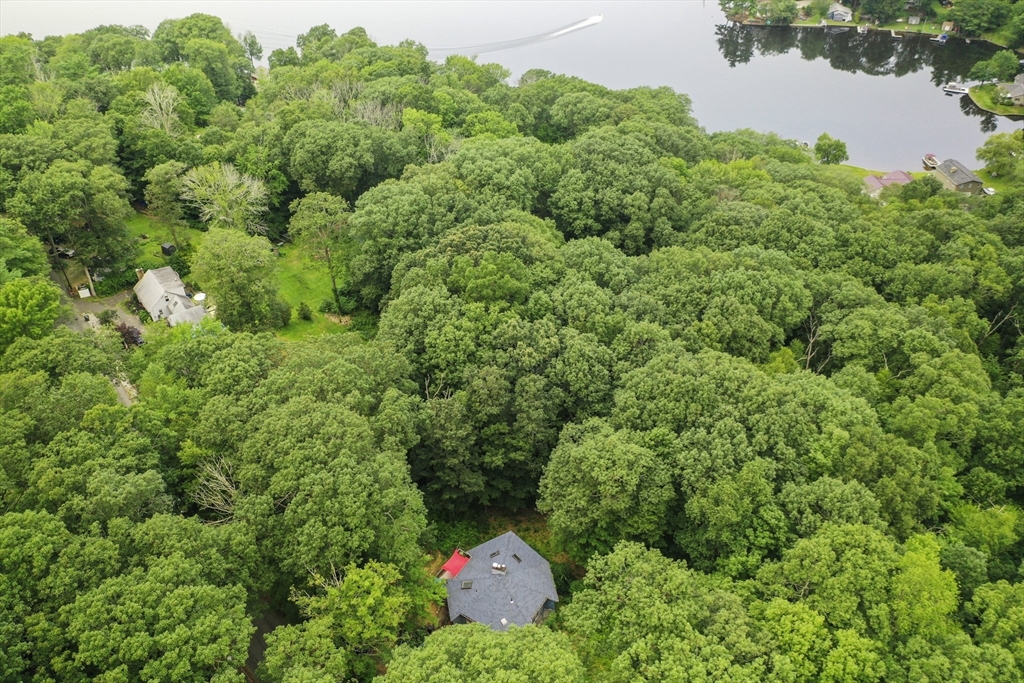 Enjoy seasonal water views from this one of a kind contemporary home, nestled on just under an acre near Hamilton Reservoir and scenic nature trails. Located close to the Sturbridge line, with easy access to Rt.84 for commuters. The open living room welcomes you with soaring cathedral ceilings, skylights, a gas fireplace, and sliders leading to the expansive deck. The space flows into the dining area and kitchen with a beamed ceiling, granite countertops, stainless steel appliances including a gas stove, new refrigerator and tile backsplash. The main bedroom features skylights, vaulted ceiling, and a private balcony, while the second bedroom offers its own skylight and custom built-ins. Two full baths for convenience. The finished lower level adds a spacious bonus room with a pellet stove—ideal for a family room, studio, or guest space. With plenty of off-street parking, a screened porch, a large deck, and a chicken coop, and shed, this home is a peaceful and relaxing retreat
