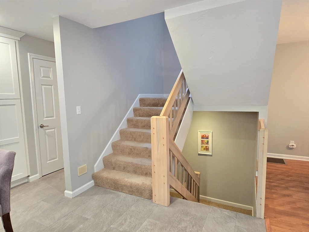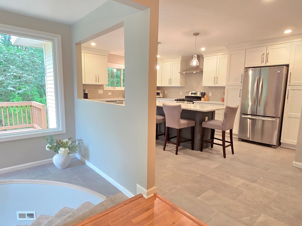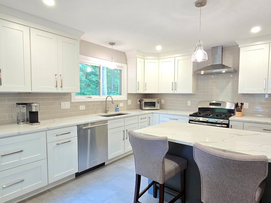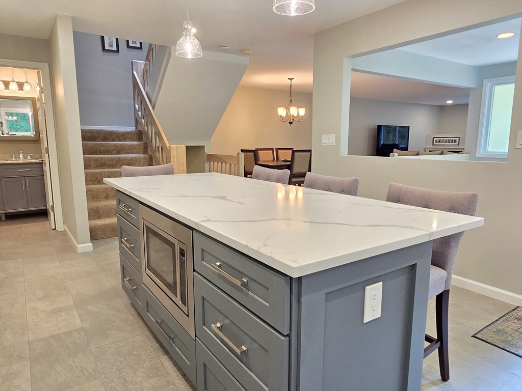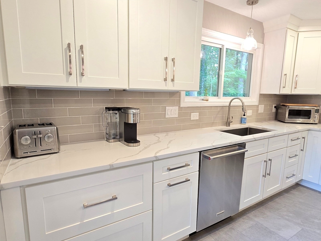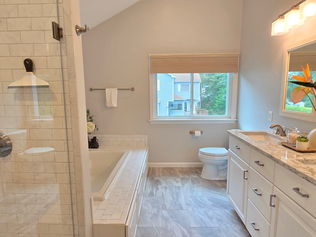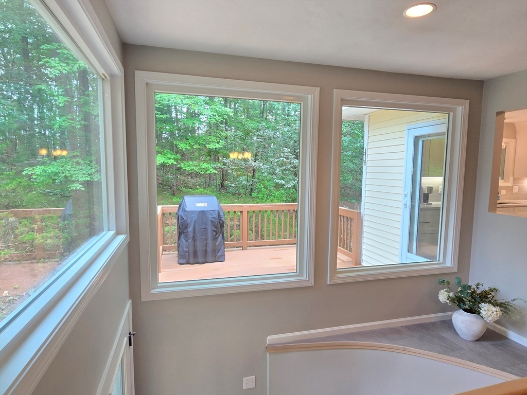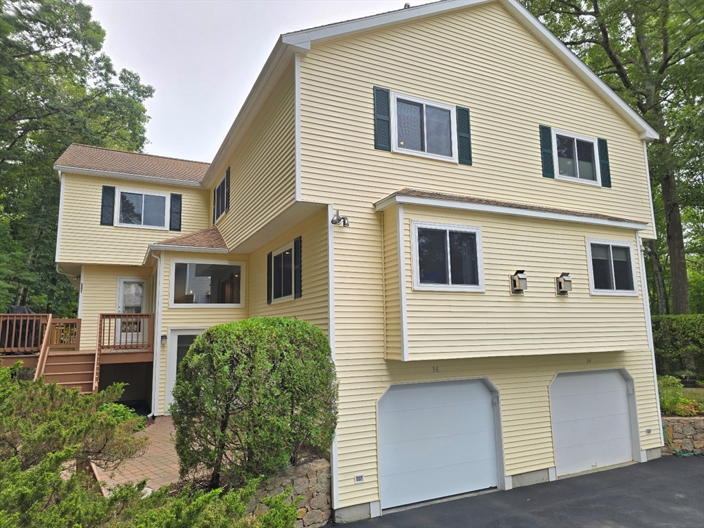 This townhome style condo is an absolute gem! Located in a desirable community within minutes of schools, shopping, restaurants, commuter train station, walking trails, Ashland State Park, and highway access. But wait until you step inside and see the new remodeled kitchen and bathrooms!! Enter into the two story foyer with huge windows that overlook a deck with private wooded views. Large kitchen with quartz counters, big center island, tile backsplash, stainless steel appliances, and vent hood that vents to the outside! Dining and living room open to each other with a gas fireplace. New half bath with marble countertop. Spacious main bedroom with cathedral ceilings, walk-in closet and the bathroom of your dreams recently remodeled with double sinks, quartz counters, and gorgeous soaking tub and large tiled walk-in shower with frameless glass doors. The 2nd bedroom also has cathedral ceilings and private full bath. Walk-up storage closet and skylight round out the 2nd floor.