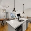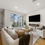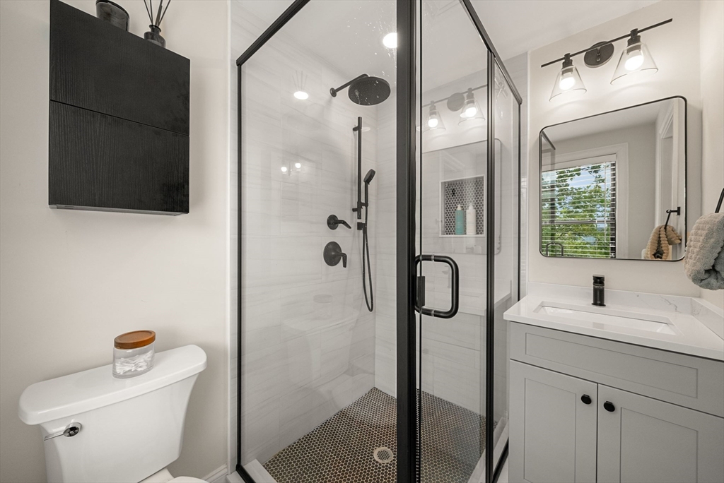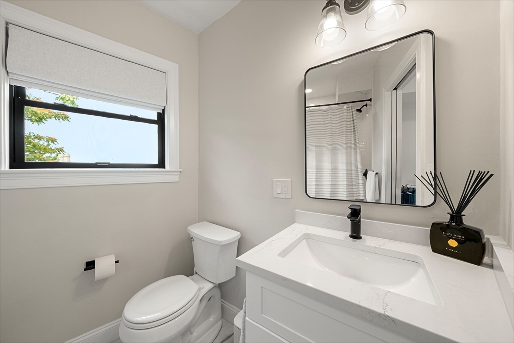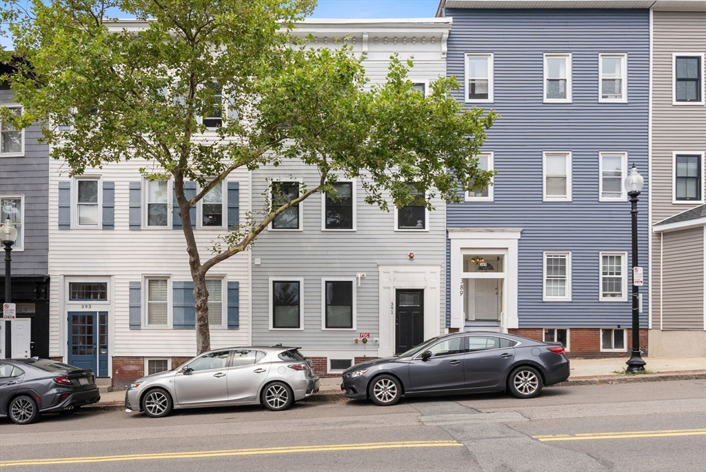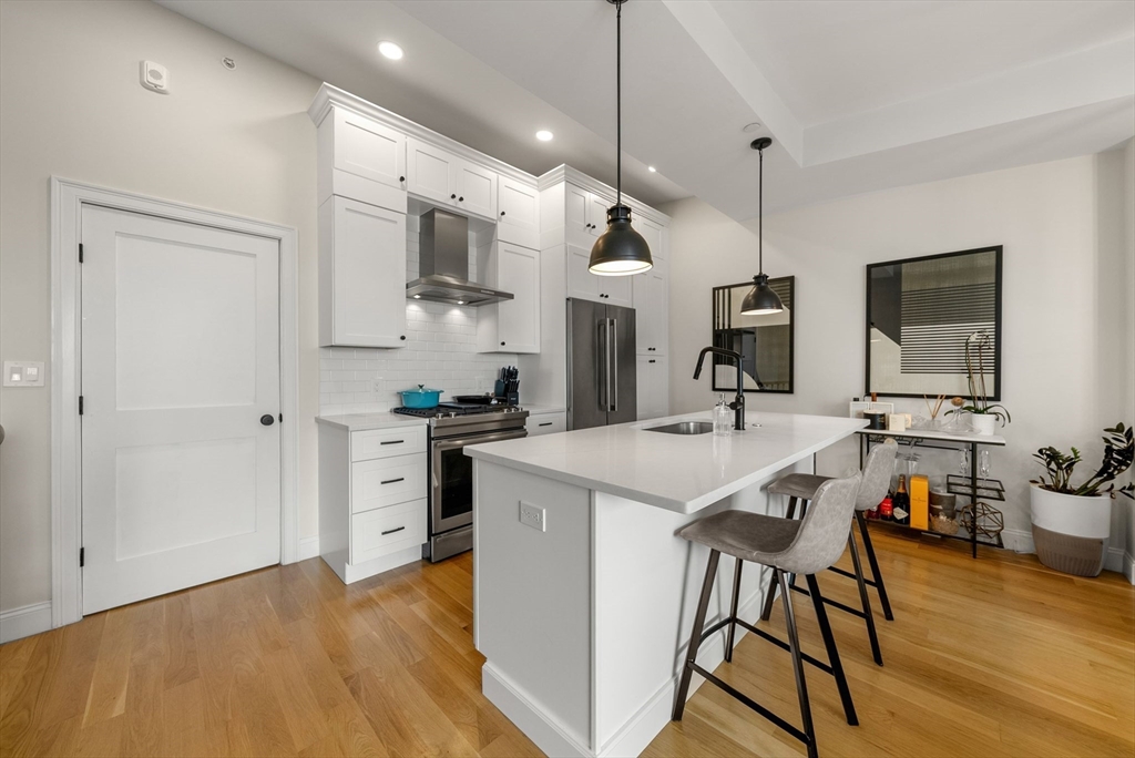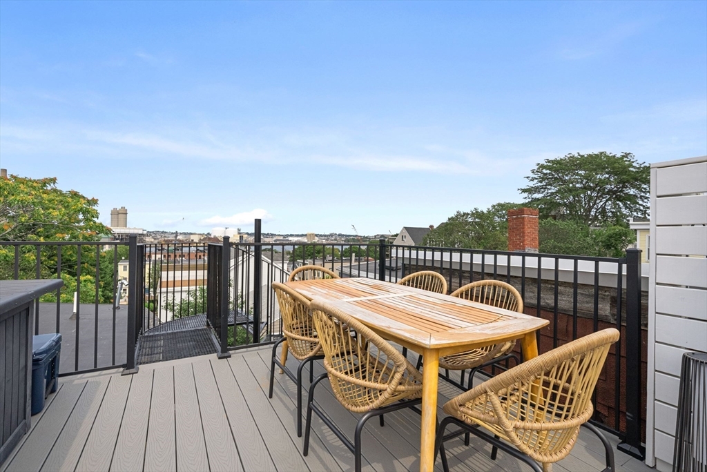 Unicorn! One flight to PENTHOUSE front door, fully renovated 2 BR 2.5 BTH w/ private rear deck and stunning entertainer’s roof deck with privacy fencing & panoramic views! Tastefully finished throughout with gorgeous cook’s kitchen featuring JennAir appliances, custom cabinets, 8 ft breakfast bar & Calacatta quartz countertops. Light, bright and fresh, the open plan living/dining room is spacious and features a gorgeous, over-sized floor to ceiling window overlooking your private rear deck with gas grill hookup; adjacent powder room completes this space. Spacious primary bedroom with custom walk in closet, custom shades and luxurious en suite bath with glass enclosed walk-in shower & vanity. Second en-suite bedroom is perfect for guest/office/nursery with gorgeous second bath with tub/shower and vanity. All this and pet friendly, Central AC, w/d in unit, and ideally located minutes from the best of Charlestown.