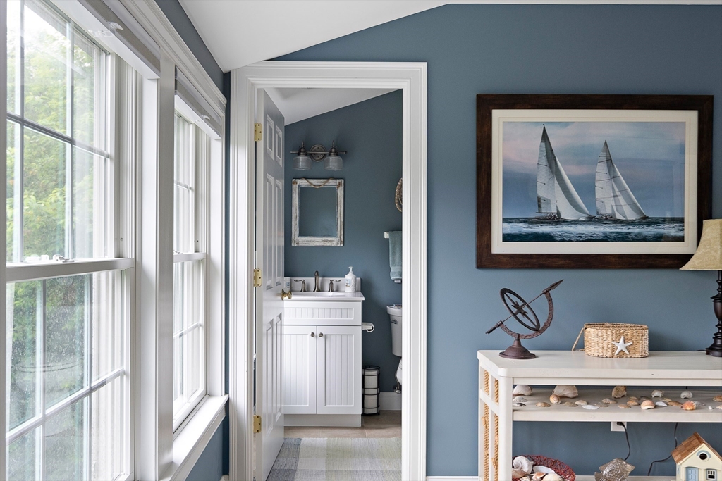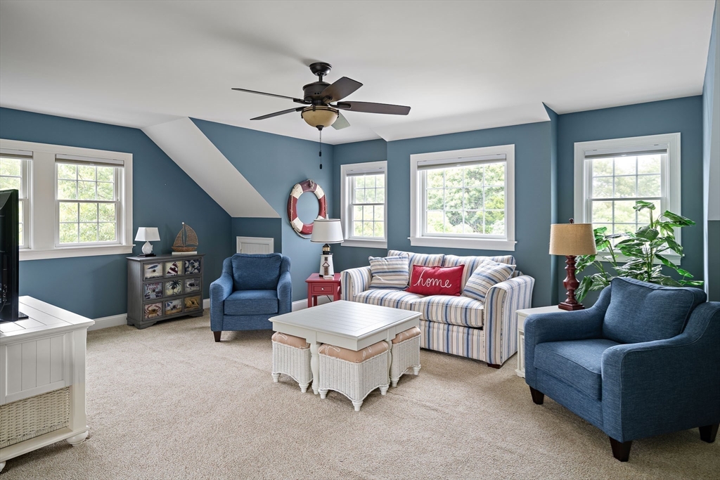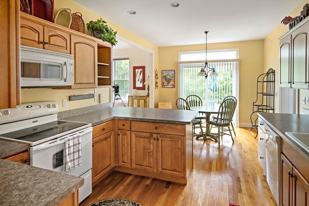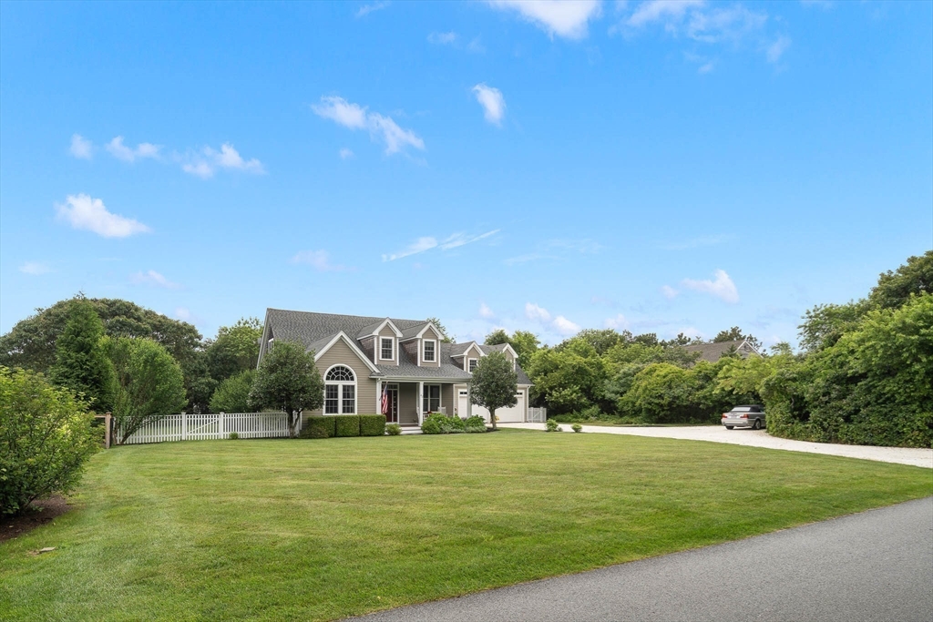 Katama ~ Turnkey Retreat in Edgartown Estates. Located on a quiet, paved road in sought-after Edgartown Estates, this meticulously maintained home offers the perfect blend of privacy, space, and convenience. Ideally positioned equidistant to South Beach and downtown Edgartown, and just moments from the bike path. The home features a bright vaulted-ceiling living room with a gas fireplace and an open eat-in kitchen that leads seamlessly to a spacious back deck. Don’t miss the fabulous outdoor shower, a true Vineyard essential. The first-floor primary suite offers privacy and ease with cathedral ceilings, a walk-in closet, and an en-suite bath. Upstairs, two large bedrooms with generous closets share a full bath, providing ample space. A major highlight is the bonus living space above the two-car garage, complete with a half bath—ideal for a home office, overflow space, or a quiet getaway. Additional features include a mudroom/laundry area with direct garage access.