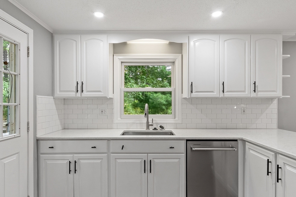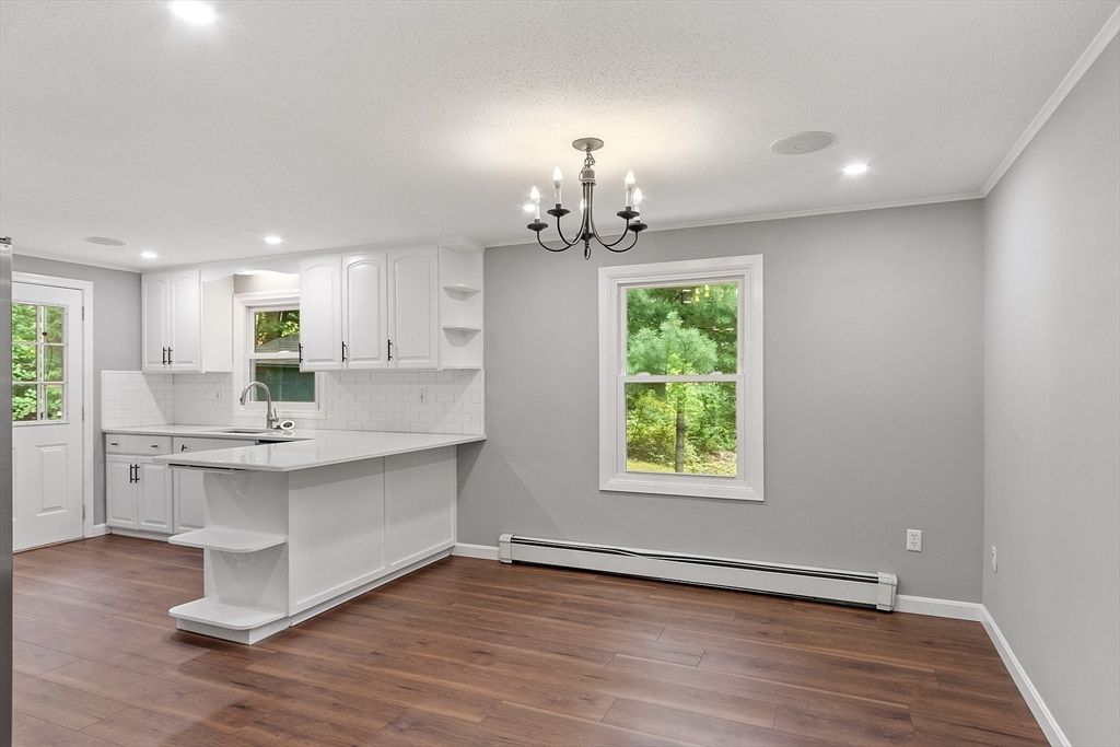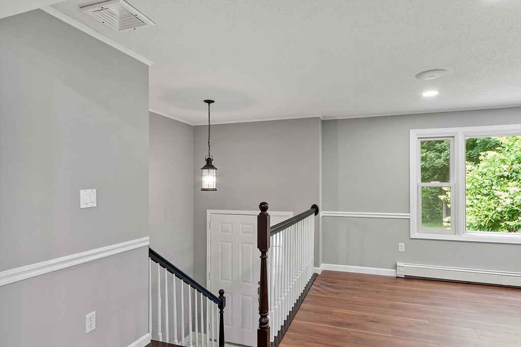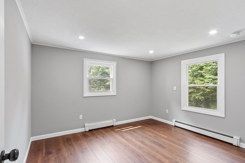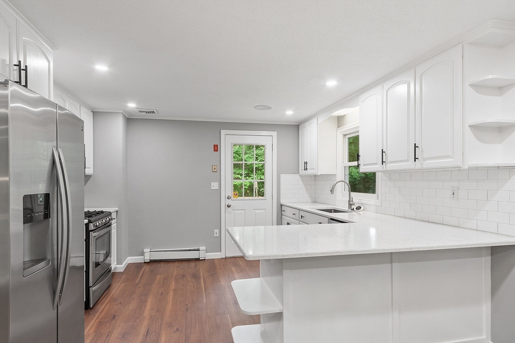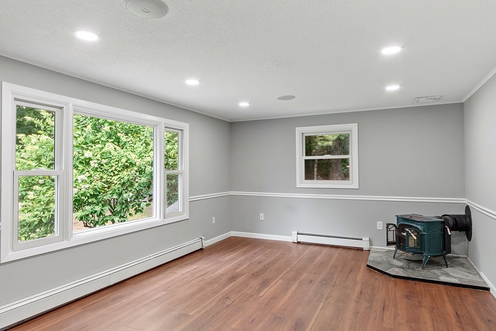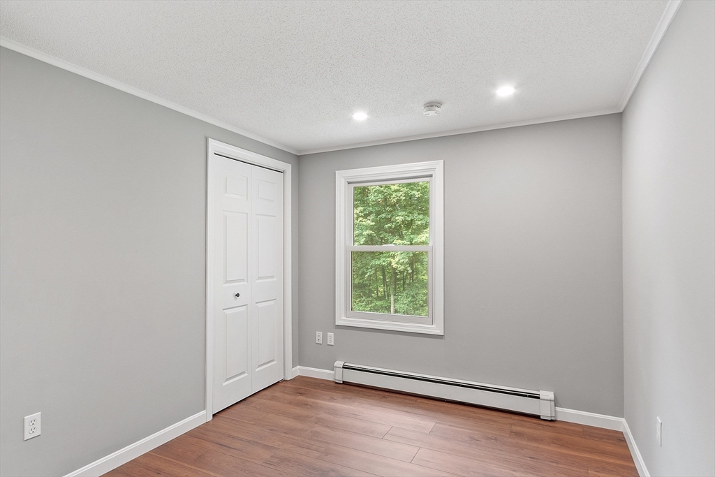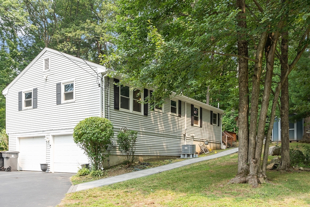 Nestled a 1/4mile off Pleasant Street, this private & stunning seven-room split-level home sits on nearly an acre of land, enveloped by serene woodlands that border Callahan State Park, offering a nature lover’s paradise. This home features a spacious living room with recessed lights, pellet stove, and a picture-perfect window for entertaining. The newly renovated kitchen boasts quartz countertops, stainless steel appliances, and new flooring, while three generously sized bedrooms and two newly updated bathrooms complete the main level. The lower level includes built-ins, recessed lighting, tile floors, and access to a two-car garage. Further upgrades include a NEW ROOF, heat pump, EV charger, brand new landscaped patio, and painted deck. The home is equipped with Bose surround sound in basement, in-ceiling speakers in living room, dining room, kitchen and outside. Conveniently located minutes from the Mass Pike, I-495, Route 9, schools & shopping. This move-in-ready home is a must see