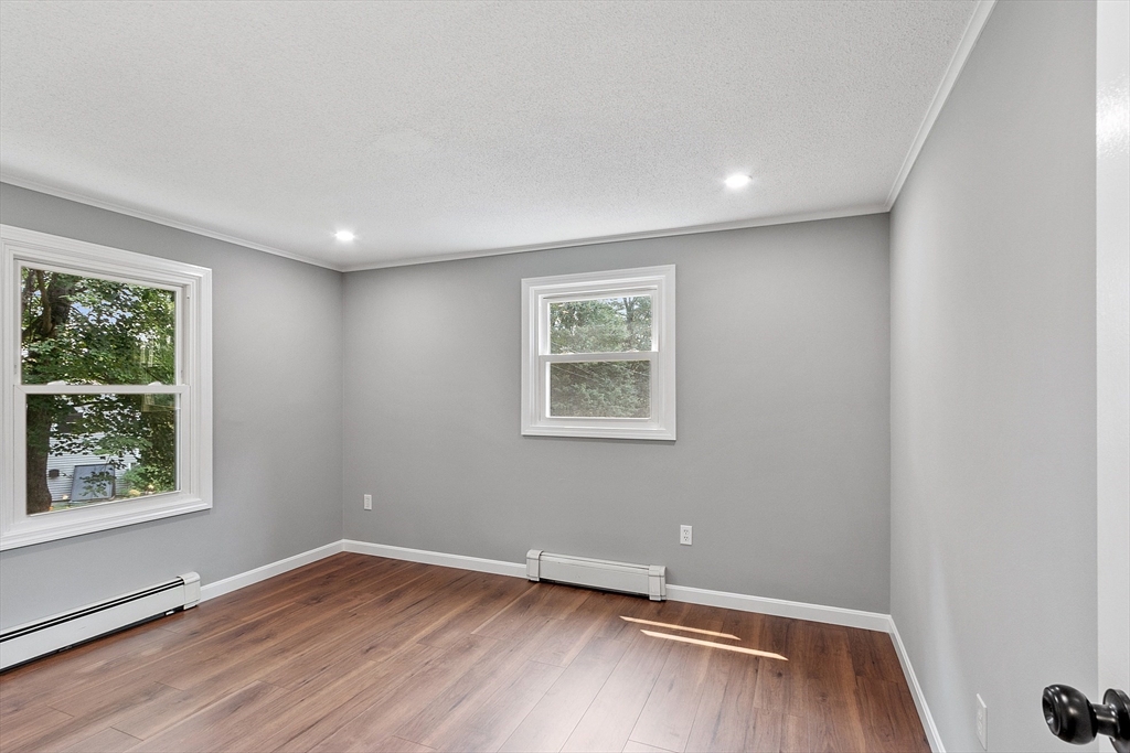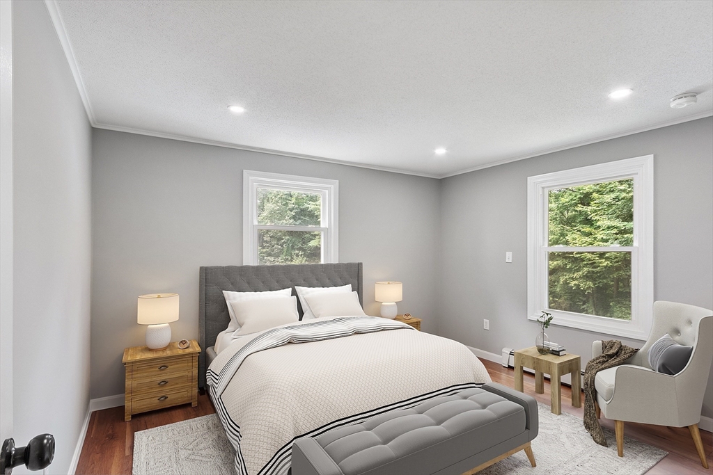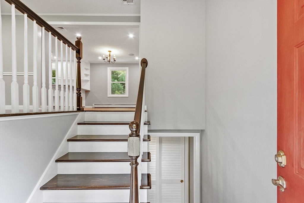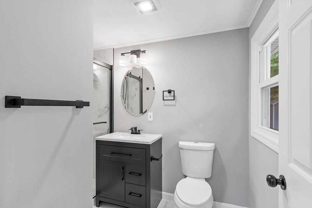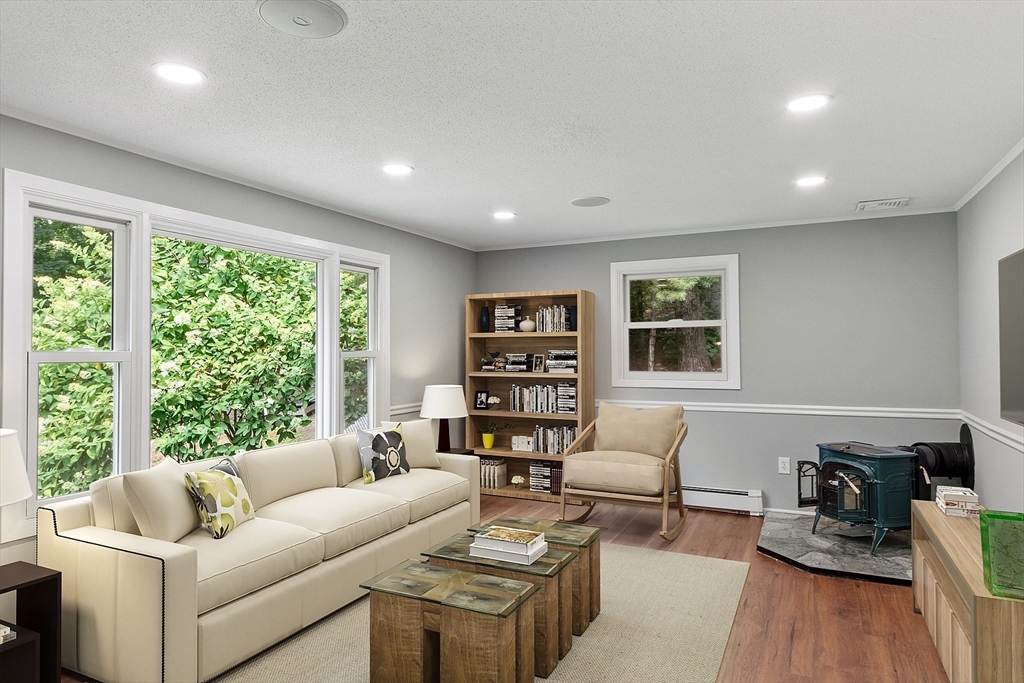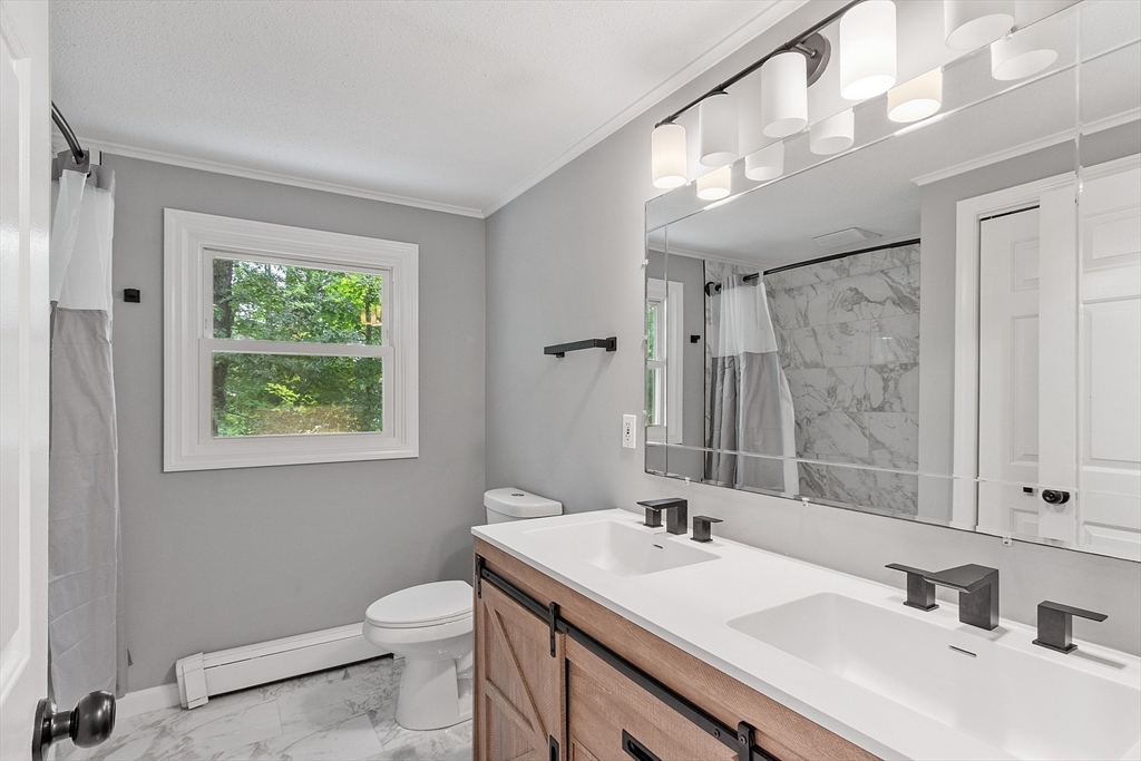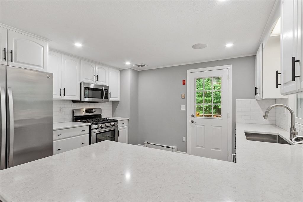 Nestled a 1/4mile off Pleasant Street, this private & stunning seven-room split-level home sits on nearly an acre of land, enveloped by serene woodlands that border Callahan State Park, offering a nature lover’s paradise. This home features a spacious living room with recessed lights, pellet stove, and a picture-perfect window for entertaining. The newly renovated kitchen boasts quartz countertops, stainless steel appliances, and new flooring, while three generously sized bedrooms and two newly updated bathrooms complete the main level. The lower level includes built-ins, recessed lighting, tile floors, and access to a two-car garage. Further upgrades include a NEW ROOF, heat pump, EV charger, brand new landscaped patio, and painted deck. The home is equipped with Bose surround sound in basement, in-ceiling speakers in living room, dining room, kitchen and outside. Conveniently located minutes from the Mass Pike, I-495, Route 9, schools & shopping. This move-in-ready home is a must see
