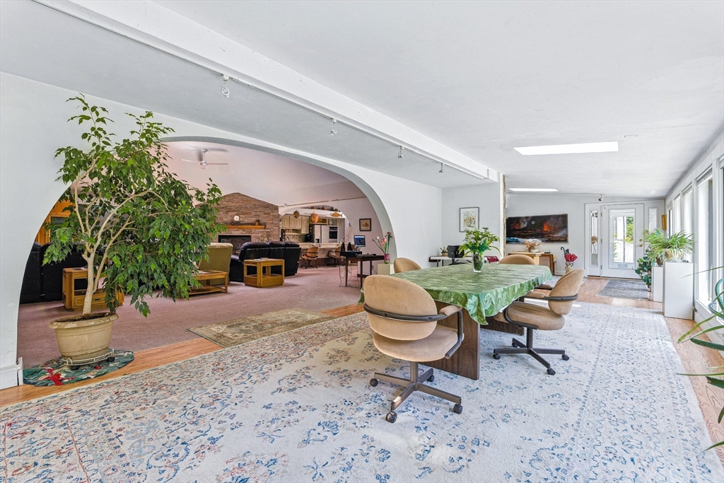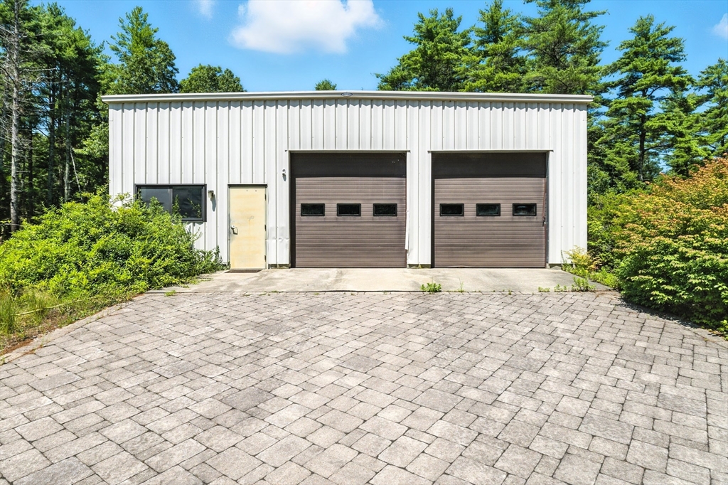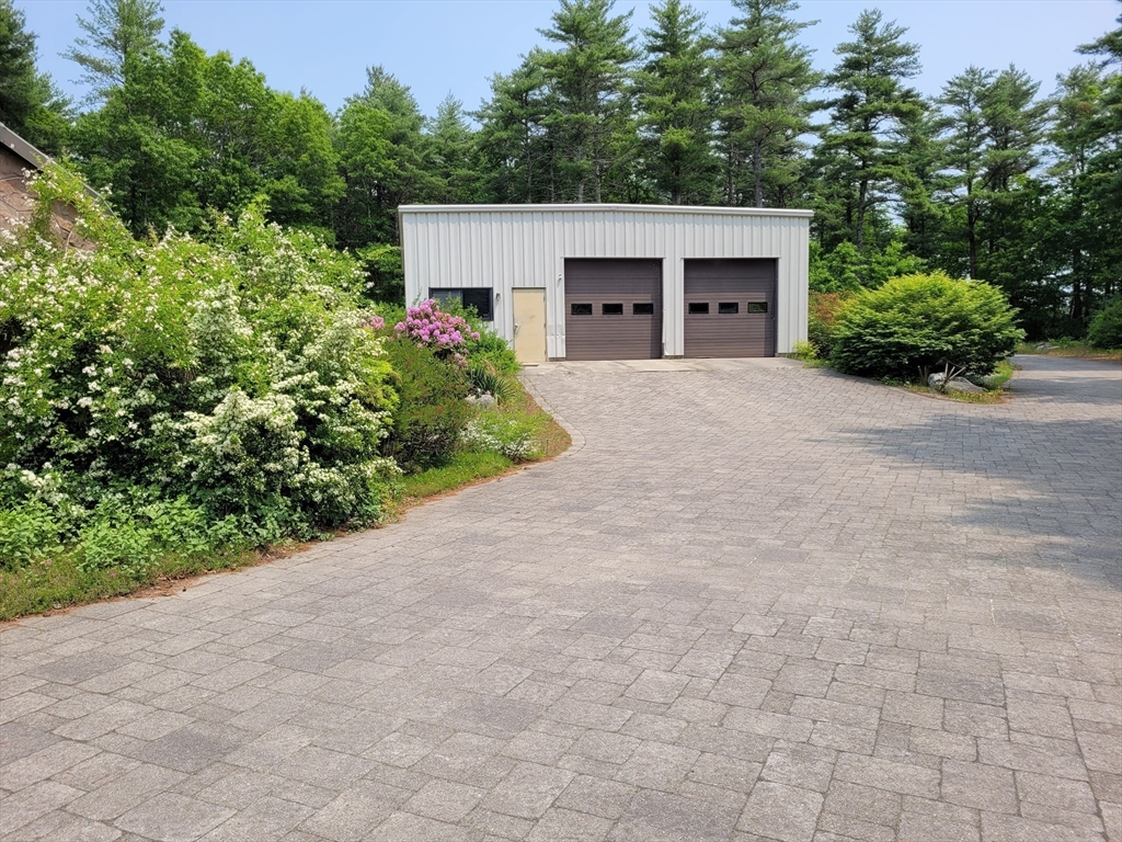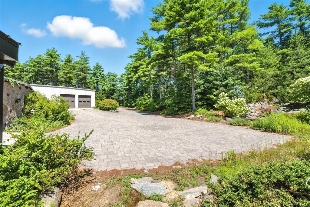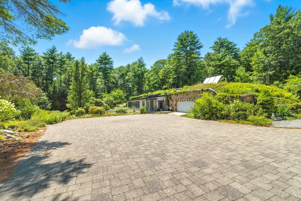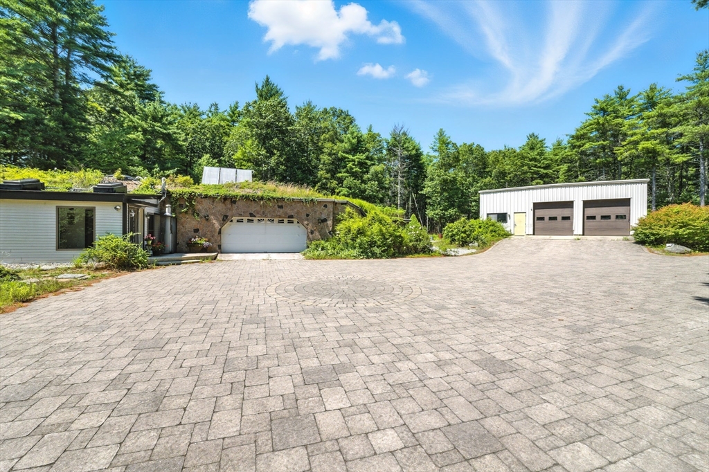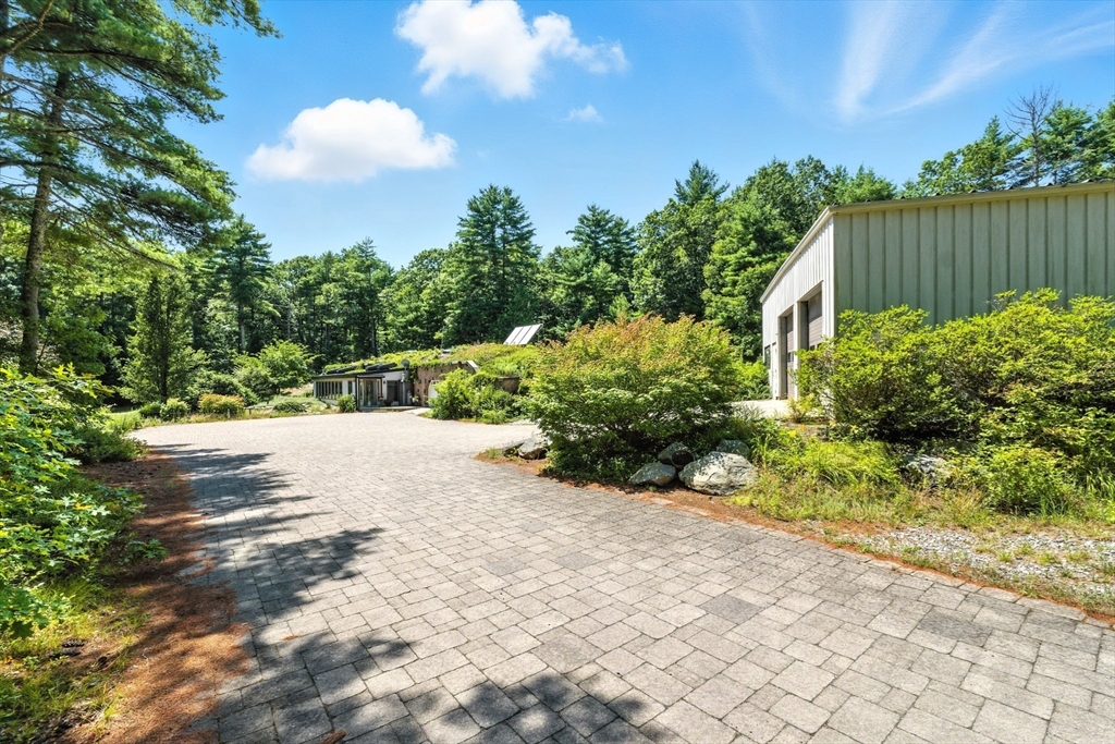 This remarkable Plympton home sits on a 6.63 wooded retreat lot & offers one-level living at its finest. The concrete construction makes this home virtually fireproof, indestructible & low maintenance. The open floor plan is unlike any other boasting a huge great room, kitchen/dining area & sunroom. You’ll also find 2 bedrooms, 2 baths, an office, laundry, craft/bonus room, & walk-in pantry. The main bedroom suite has dual sinks, jacuzzi style tub & walk-in closet. Skylights & 12’ vaulted ceilings add natural lighting & openness throughout. In addition to the 2-car garage, there’s a 2000 sq ft insulated shop with heat, power, water, 2 bays, 2 offices, storage & endless possibilities! The paved private road leads to a striking paver driveway & waterfall. Other features include a generator connection , solar array & more. Ideal for ADUs. Private, yet located 5 minutes from shopping, banking, eateries & more. Close to Rtes. 3, 44 & the "T" provides easy access to Boston & Cape Cod.