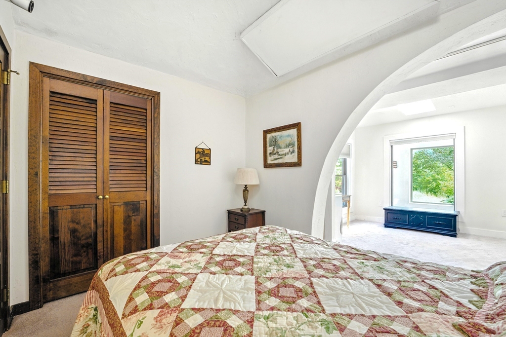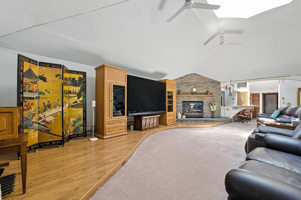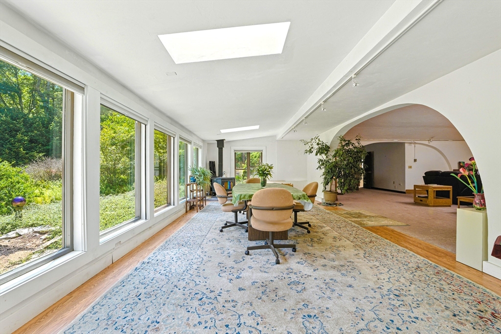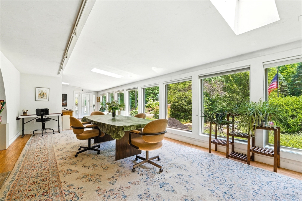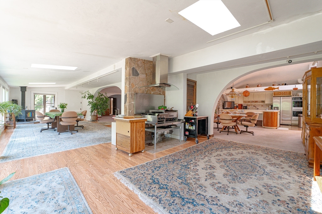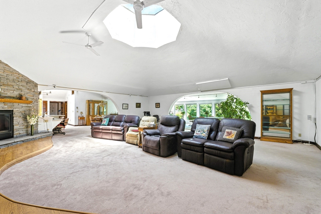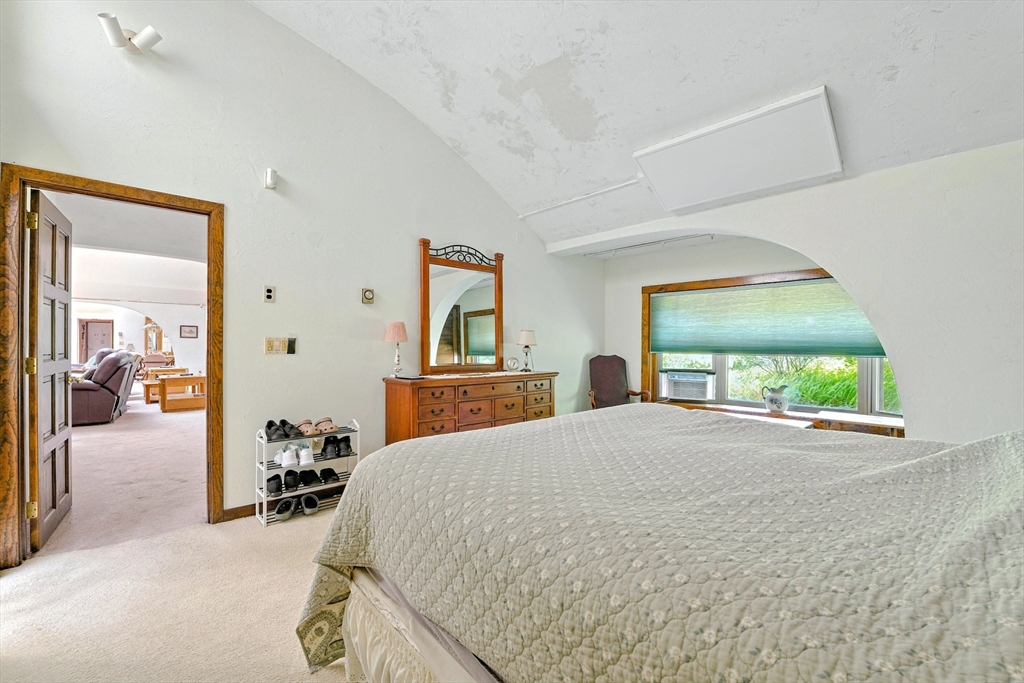 This remarkable Plympton home sits on a 6.63 wooded retreat lot & offers one-level living at its finest. The concrete construction makes this home virtually fireproof, indestructible & low maintenance. The open floor plan is unlike any other boasting a huge great room, kitchen/dining area & sunroom. You’ll also find 2 bedrooms, 2 baths, an office, laundry, craft/bonus room, & walk-in pantry. The main bedroom suite has dual sinks, jacuzzi style tub & walk-in closet. Skylights & 12’ vaulted ceilings add natural lighting & openness throughout. In addition to the 2-car garage, there’s a 2000 sq ft insulated shop with heat, power, water, 2 bays, 2 offices, storage & endless possibilities! The paved private road leads to a striking paver driveway & waterfall. Other features include a generator connection , solar array & more. Ideal for ADUs. Private, yet located 5 minutes from shopping, banking, eateries & more. Close to Rtes. 3, 44 & the "T" provides easy access to Boston & Cape Cod.