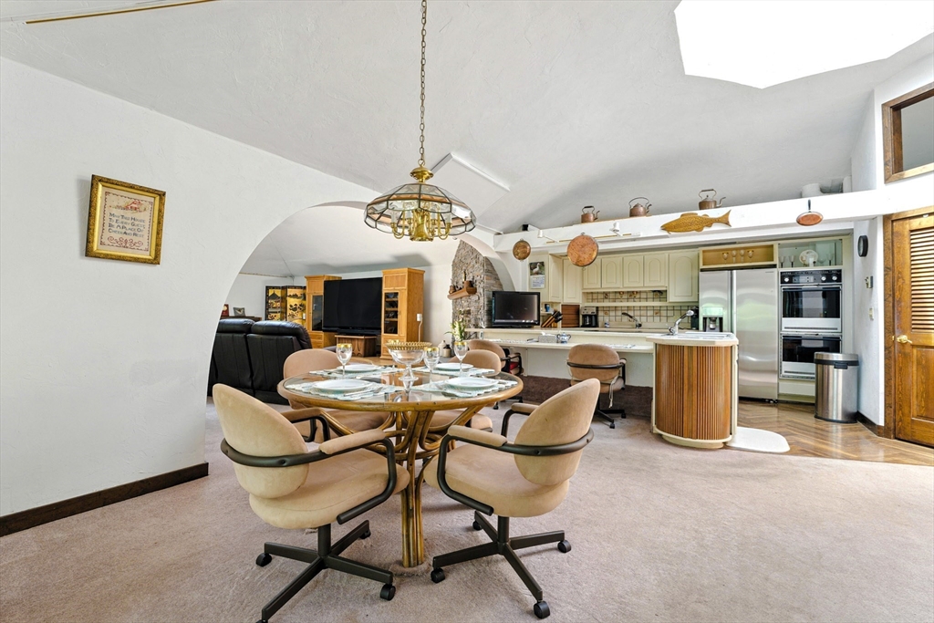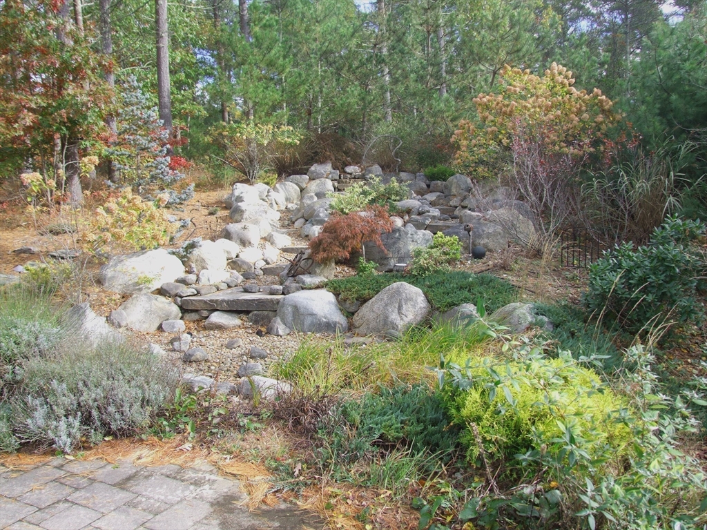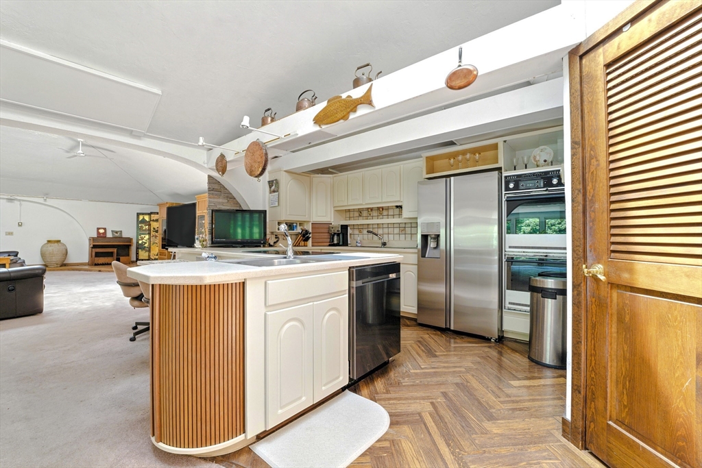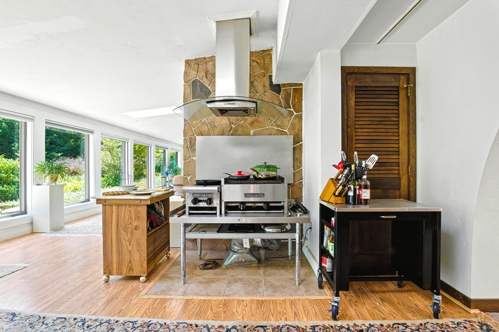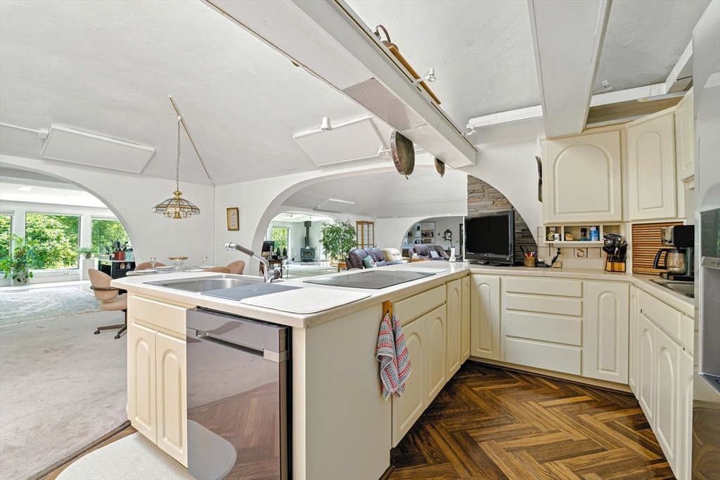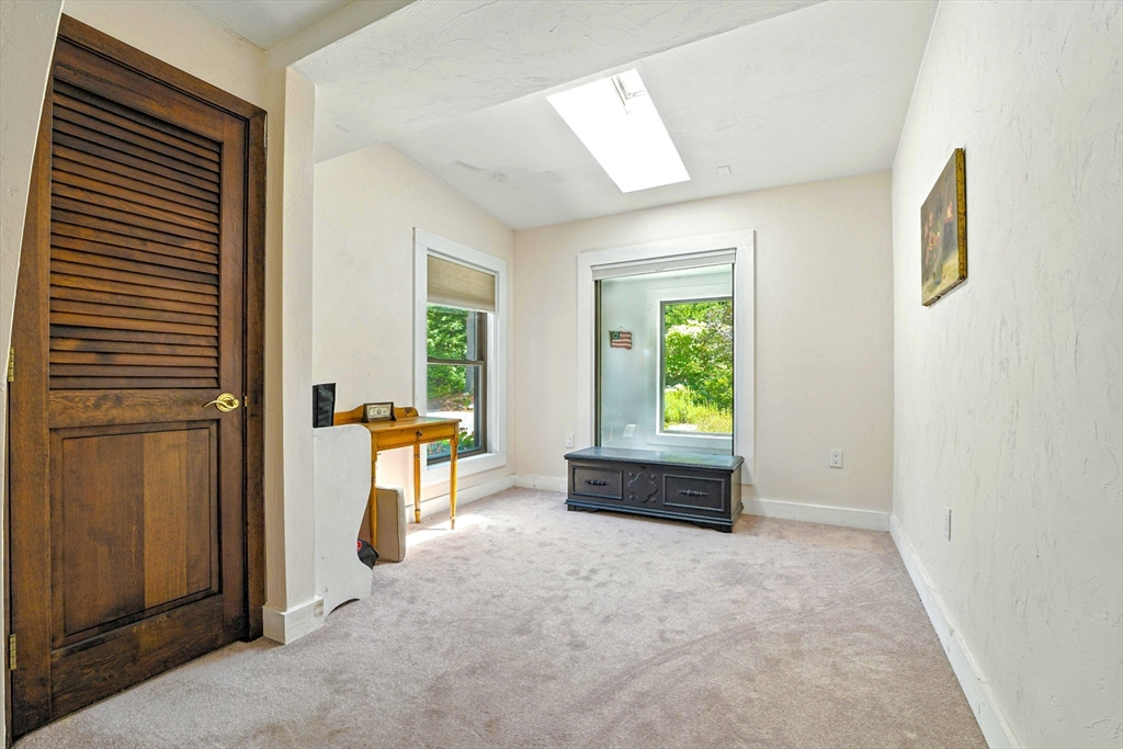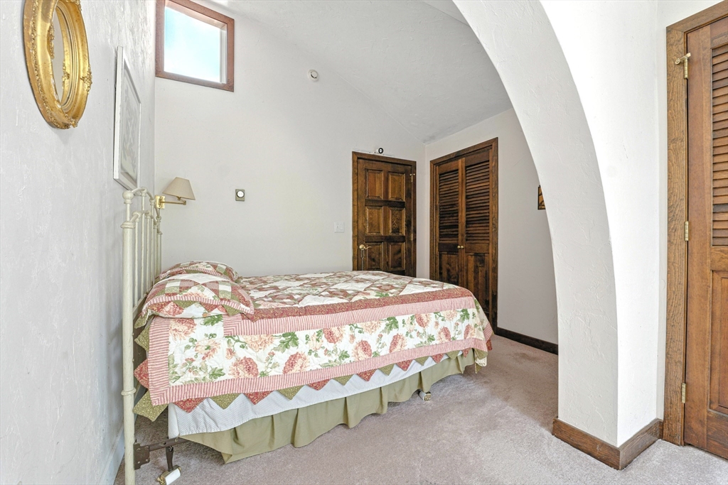 This remarkable Plympton home sits on a 6.63 wooded retreat lot & offers one-level living at its finest. The concrete construction makes this home virtually fireproof, indestructible & low maintenance. The open floor plan is unlike any other boasting a huge great room, kitchen/dining area & sunroom. You’ll also find 2 bedrooms, 2 baths, an office, laundry, craft/bonus room, & walk-in pantry. The main bedroom suite has dual sinks, jacuzzi style tub & walk-in closet. Skylights & 12’ vaulted ceilings add natural lighting & openness throughout. In addition to the 2-car garage, there’s a 2000 sq ft insulated shop with heat, power, water, 2 bays, 2 offices, storage & endless possibilities! The paved private road leads to a striking paver driveway & waterfall. Other features include a generator connection , solar array & more. Ideal for ADUs. Private, yet located 5 minutes from shopping, banking, eateries & more. Close to Rtes. 3, 44 & the "T" provides easy access to Boston & Cape Cod.