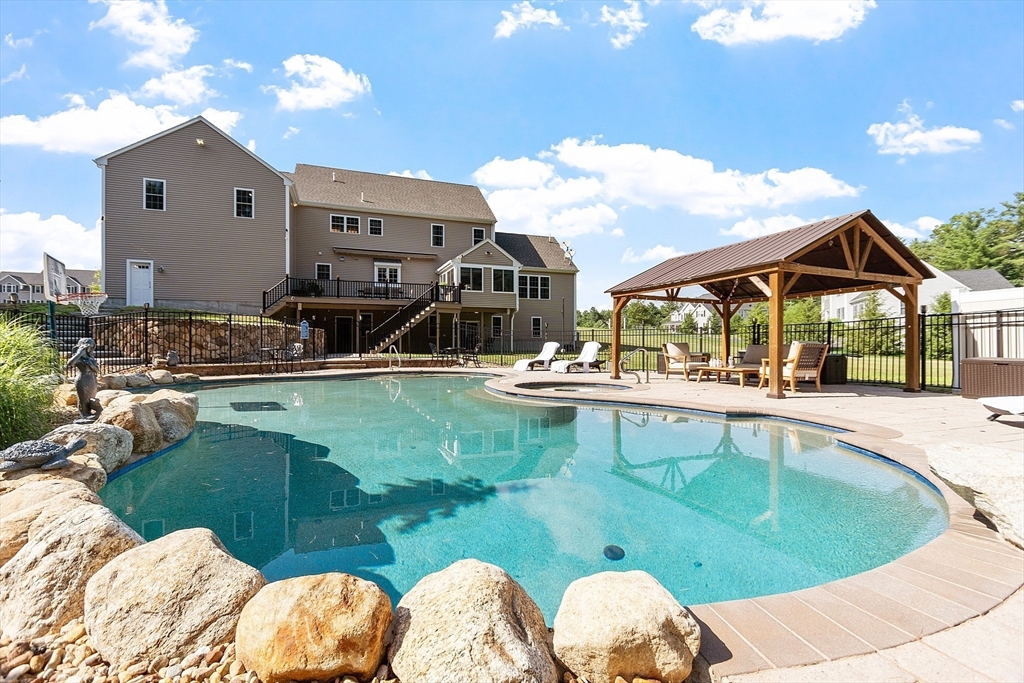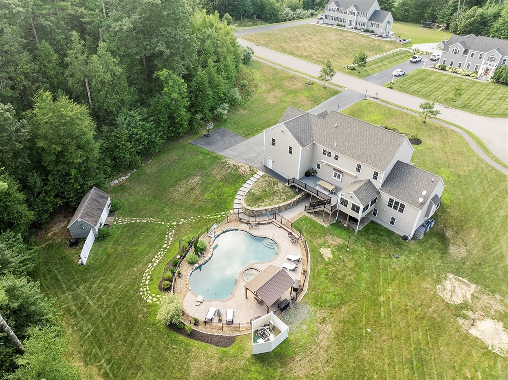 Sitting in a quiet cul de sac on over 7 private acres, this custom built masterpiece combines elegance, comfort & functionality. The main level features sun-filled living spaces, including a radiant-heated sunroom, spacious living room with cathedral ceiling & gas fireplace, a chef’s kitchen appointed with granite counters, high-end stainless appliances, a breakfast bar & an adjacent formal dining room, 1st floor office, 1/2 bath & attached 3 car garage. Upstairs you will find 4 bedrooms including a luxurious primary suite with 3 walk-in closets & a spa-like bath with jetted soaking tub & steam shower. The finished walk-out lower level is ideal for entertaining or excercising and offers an in-law suite, perfect for guests or extended family and could even double as a cooking and entertaining area for pool parties as you step outside to your own resort-style oasis with heated saltwater pool, relaxing hot tub & expansive grounds, designed for both everyday living & grand entertaining!