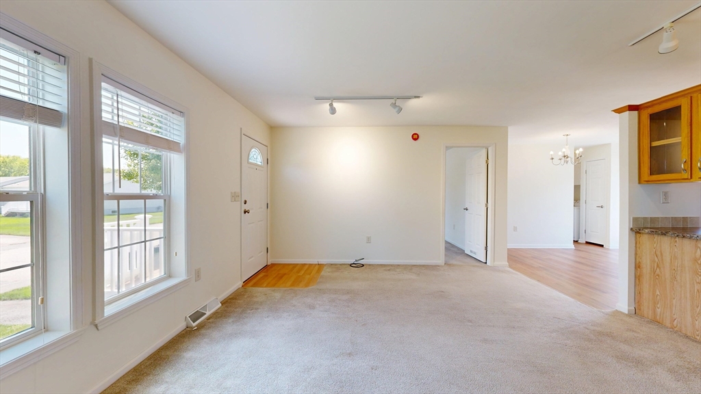 This is an Age Restricted Over 55 years of age Community. The H O A fee includes Property taxes, trash removal, landscaping, and snow removal. Beautiful double-wide ranch in the private Skyview Village is move-in ready! A charming front porch welcomes you into a bright, open-concept living room. The eat-in kitchen offers gas cooking, a stainless steel double sink, oak cabinetry, abundant storage, and a slider leading to the back deck—perfect for morning coffee or evening relaxation. The main bedroom is your own retreat, featuring two walk-in closets and a private bath with a 5-ft walk-in shower. An attached garage keeps your vehicle protected from the elements, while the desirable corner lot adds extra privacy and convenience. Ideally located just minutes from Route 28, Brockton Country Club, and more! Call today for a private showing!