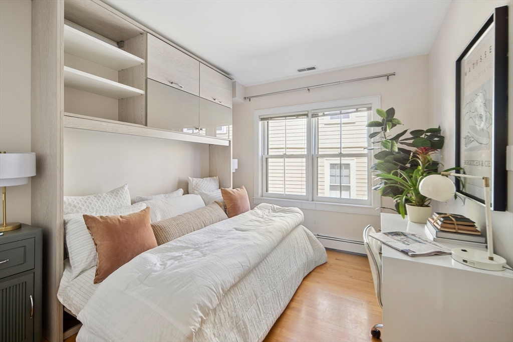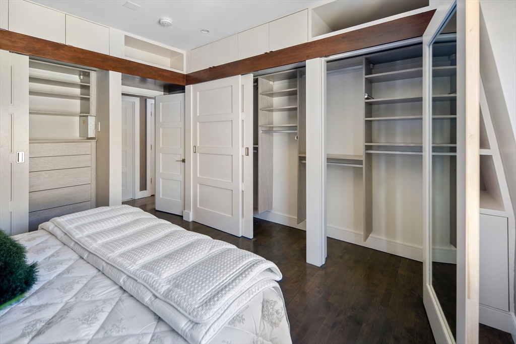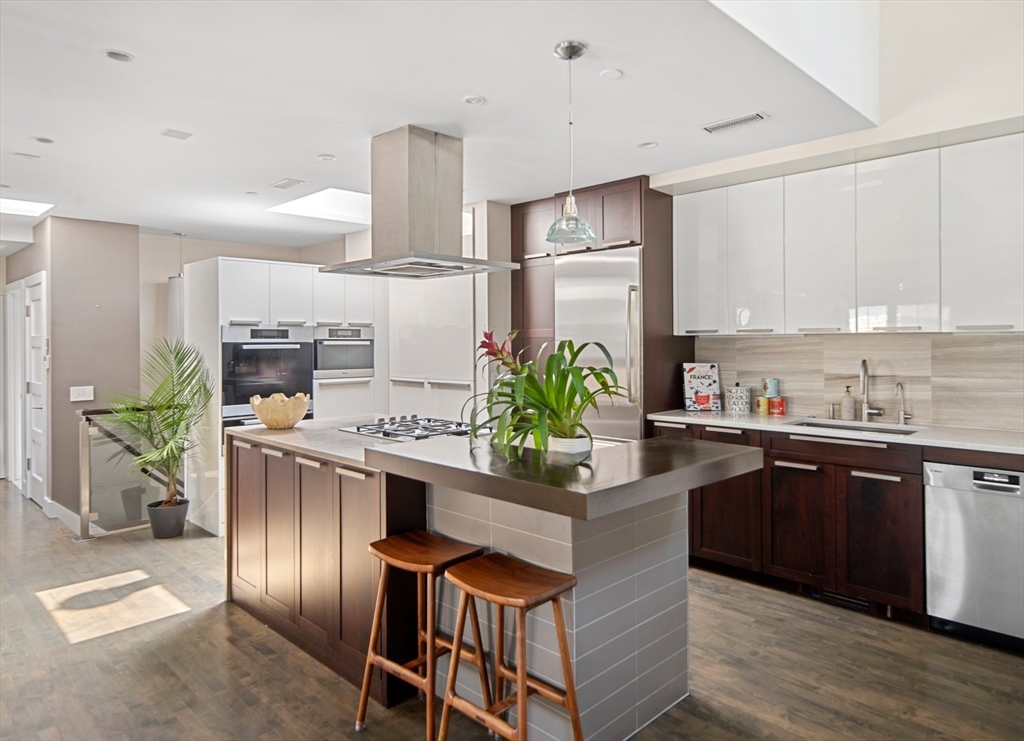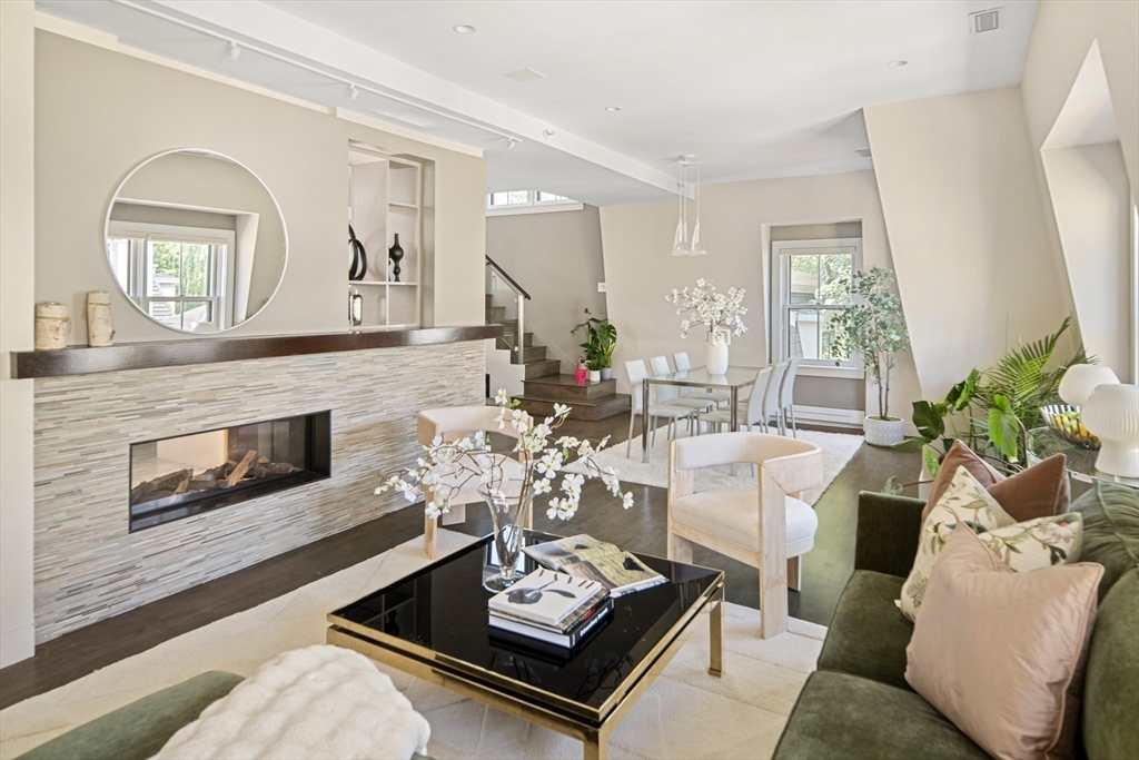 Stunning 2 bed, 2 bath, 2 level condo with garage parking and a fabulous 370 sf private roofdeck in well-cared for 13-unit Robert Frost Condominium complex. The first level features a bedroom and full bath. There is a glass paneled staircase leading to the main living level with an open concept chef's kitchen with island, dining room and living room. The kitchen features Caesarstone countertops, top of the line stainless steel appliances, and ample cabinet space. The dining/living room has beautiful sight lines from every angle with a modern gas fireplace on both the living room wall and kitchen wall. The primary bedroom has 2 large custom built-in closets with lots of shelves. The bathrooms are in excellent condition, and there is an in-unit laundry closet with stackable Bosch washer and dryer. There is underground garage parking for 1 car plus additional storage. Exercise Room on premises. Fantastic location with great access to walking, biking, playgrounds, parks and shopping.