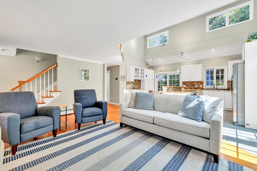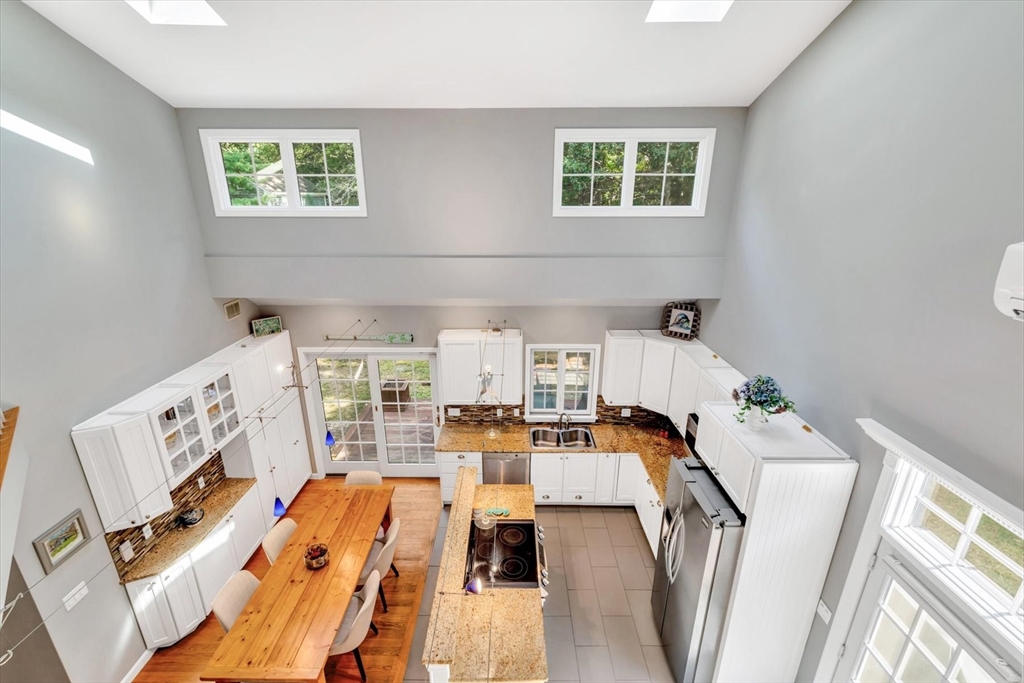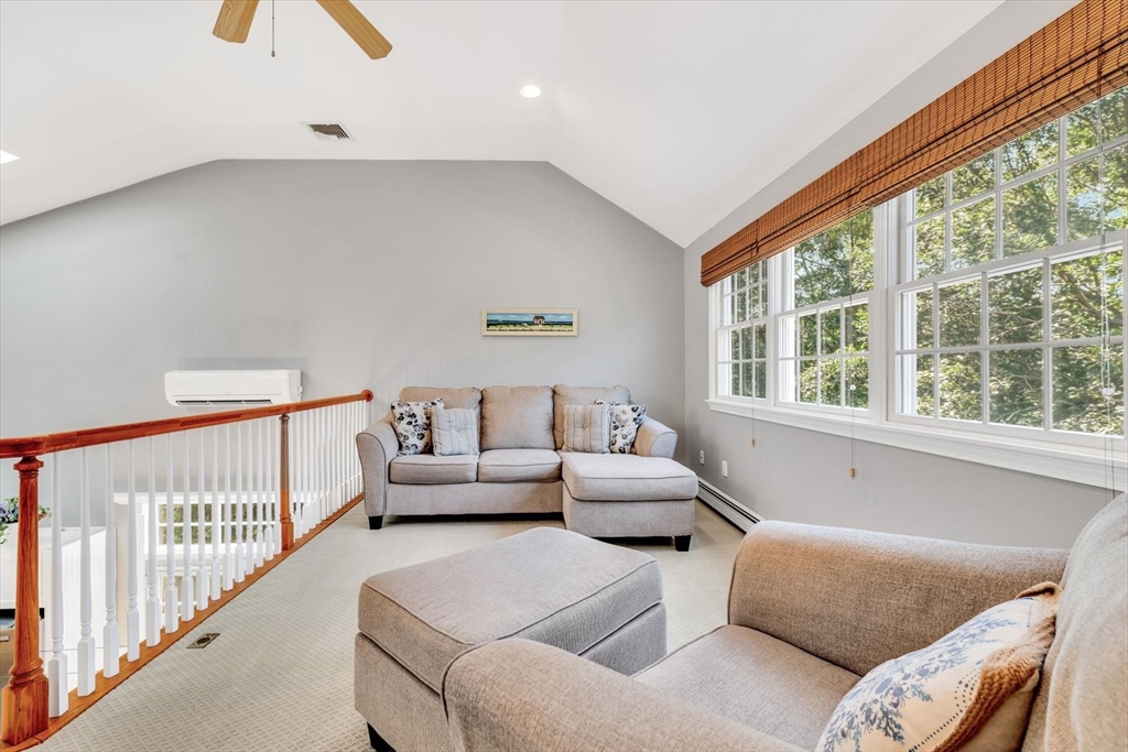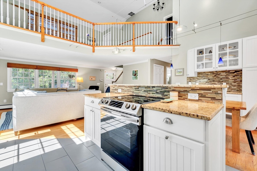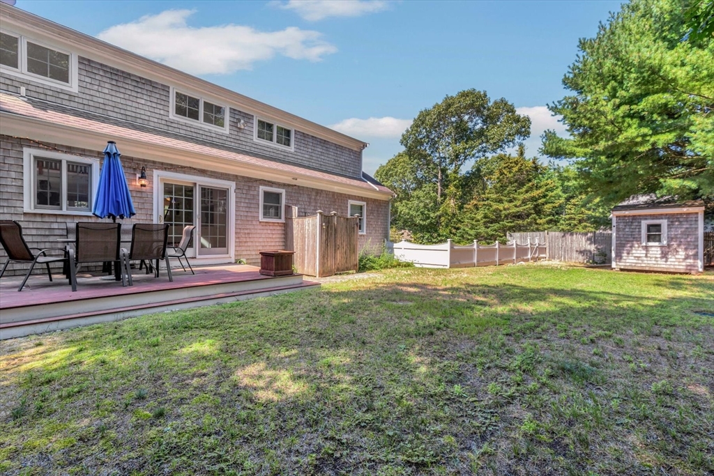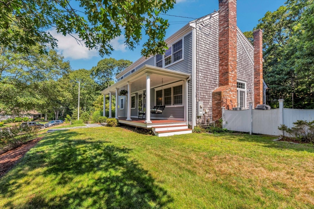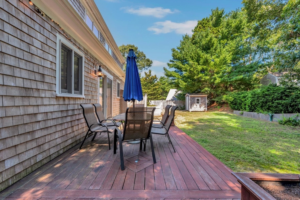 Situated on an oversized lot just north of 6A in Yarmouth Port, step inside to an open-concept living space featuring vaulted ceilings & hardwood floors. The bright kitchen & dining area are a delight, with a granite island and 2 sliders that open to a wrap-around deck, perfect for indoor-outdoor living. This leads to a fully fenced, private backyard, complete with an outdoor shower and a large shed. The second floor has a private primary bedroom suite with its own sitting area and interior balcony. This spacious area features vaulted ceilings, recessed lighting, a large walk-in closet, and a full bathroom with a jacuzzi tub and a walk-in shower. On the first floor, you'll find 2 more bedrooms, a full bathroom, and a bonus room ideal for an office or playroom. The finished walk-out basement provides additional additional living space with new flooring, another full bathroom, and a cedar closet.