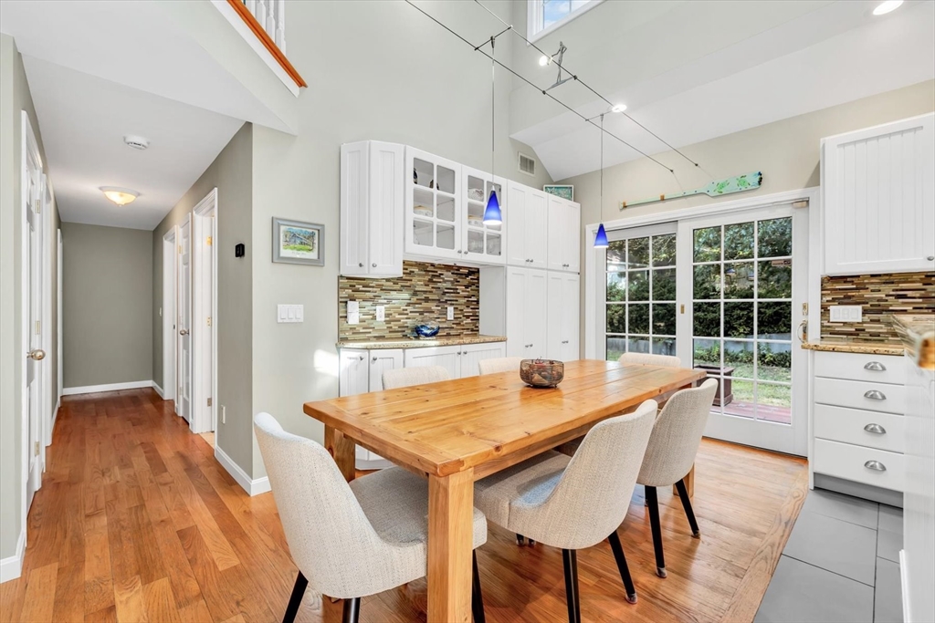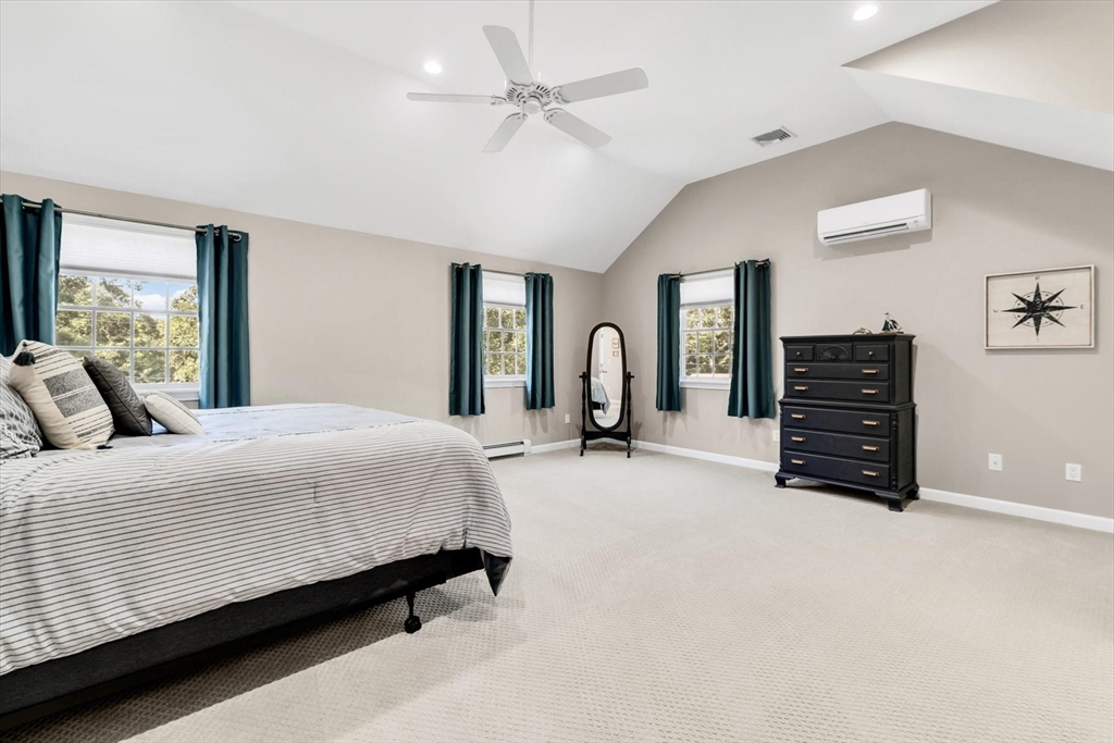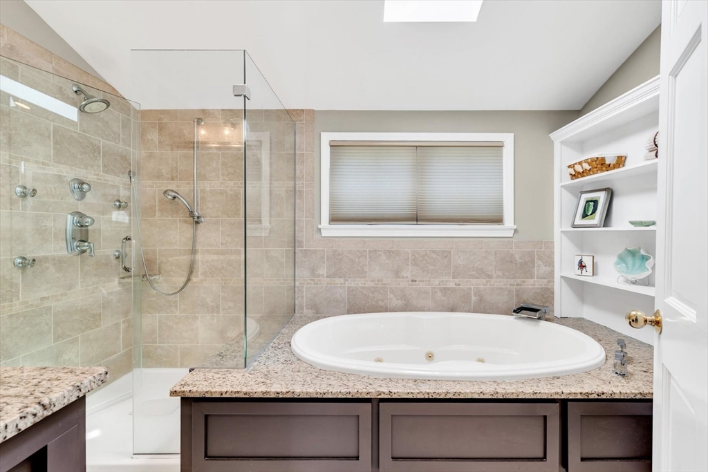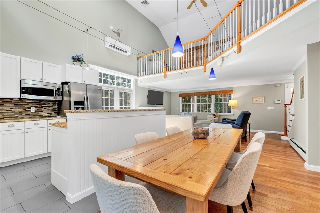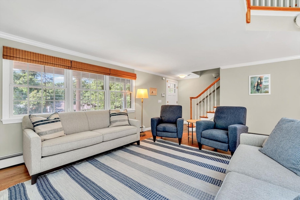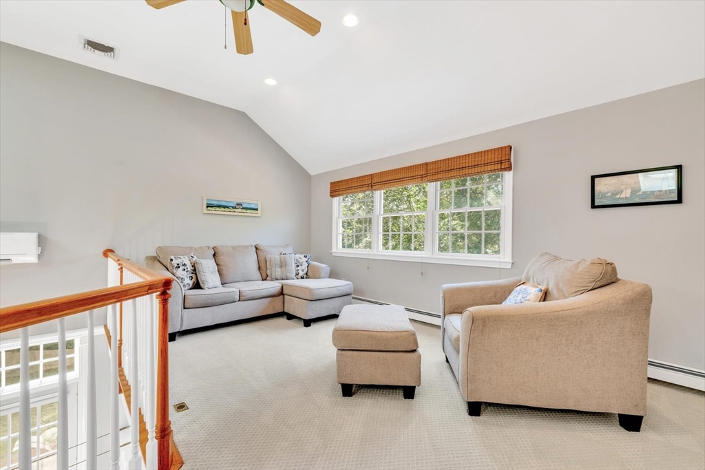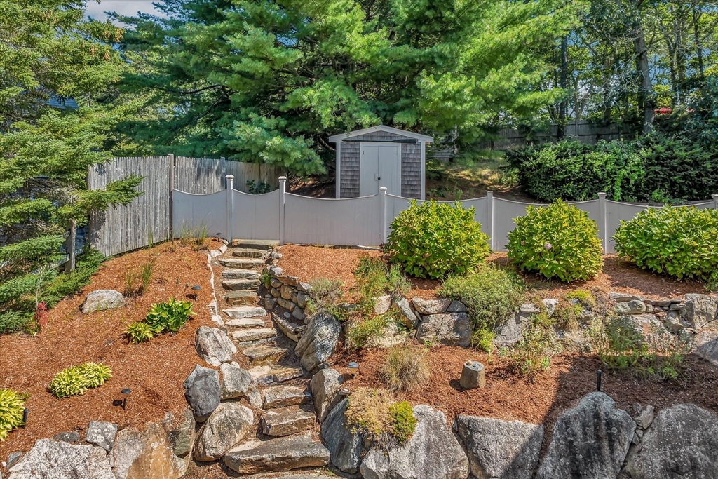 Situated on an oversized lot just north of 6A in Yarmouth Port, step inside to an open-concept living space featuring vaulted ceilings & hardwood floors. The bright kitchen & dining area are a delight, with a granite island and 2 sliders that open to a wrap-around deck, perfect for indoor-outdoor living. This leads to a fully fenced, private backyard, complete with an outdoor shower and a large shed. The second floor has a private primary bedroom suite with its own sitting area and interior balcony. This spacious area features vaulted ceilings, recessed lighting, a large walk-in closet, and a full bathroom with a jacuzzi tub and a walk-in shower. On the first floor, you'll find 2 more bedrooms, a full bathroom, and a bonus room ideal for an office or playroom. The finished walk-out basement provides additional additional living space with new flooring, another full bathroom, and a cedar closet.