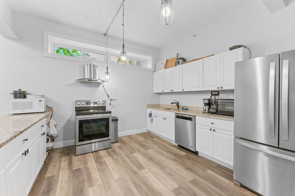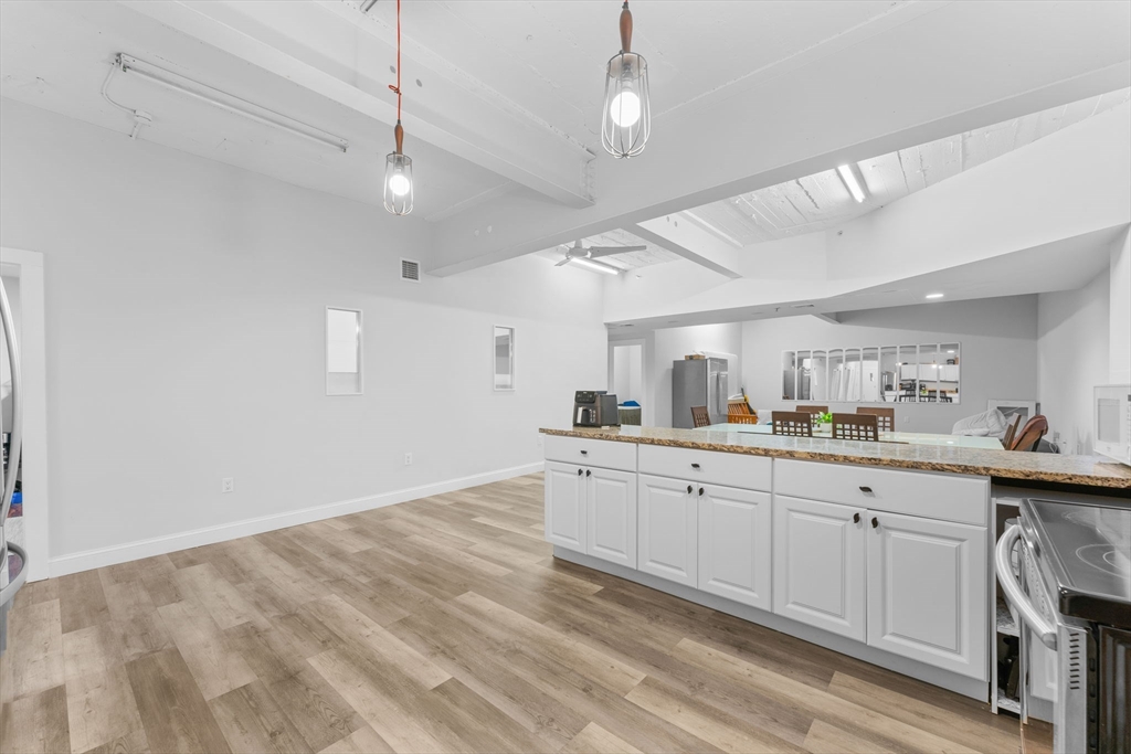 Welcome to this charming condo in Everett! Take a look of the open-concept design seamlessly connects the living, dining, and kitchen areas, providing an ideal setting for both relaxation and entertainment! Enjoy the soaring 9'+ foot vaulted ceilings with exposed beams, custom track and pendant lighting, and recessed lighting! The heart of the home is the spacious kitchen with stainless steel appliances, a granite island bar, birch countertops, and ample cabinet space. This 4-bedroom, 2-bath home includes a fully tiled Japanese-style slate soaking tub and shower, plus 1 garage parking spot. Conveniently located just 5 mins away from Whidden Hospital, close to Everett High School and Glendale Park, easy access to public transportation Rt 1 and Rt 16, and just a few minutes to Boston and Encore Casino! Don't wait! Come see us at the open house!