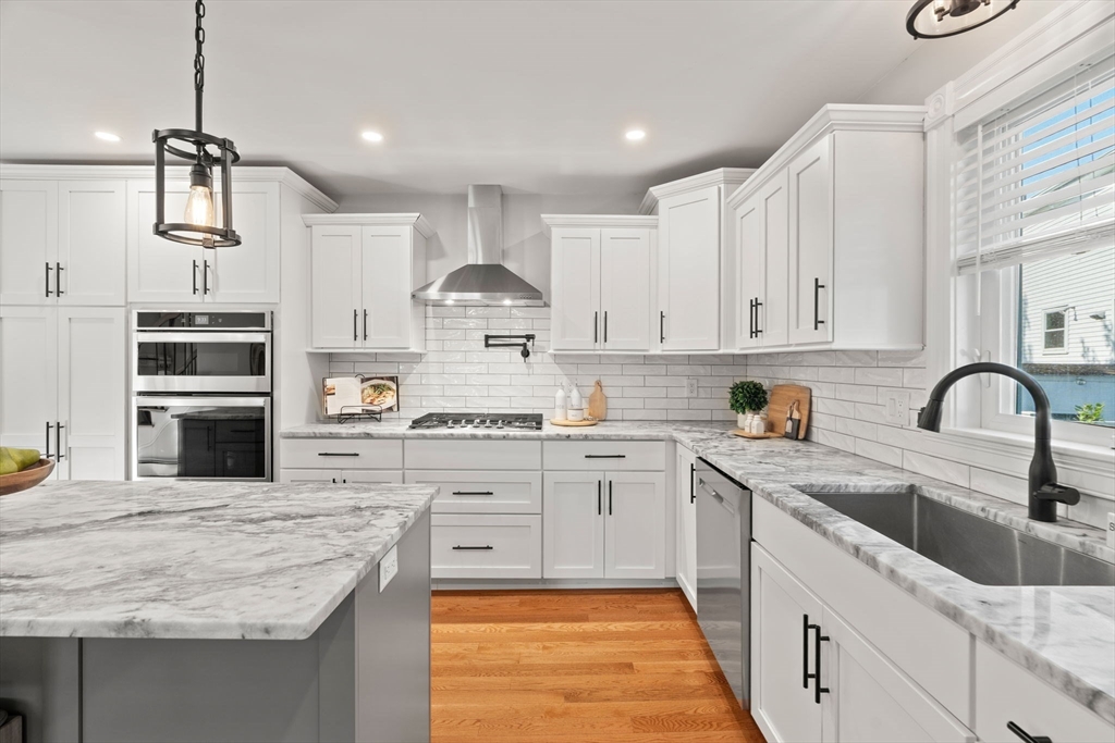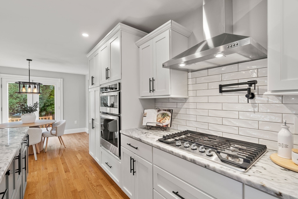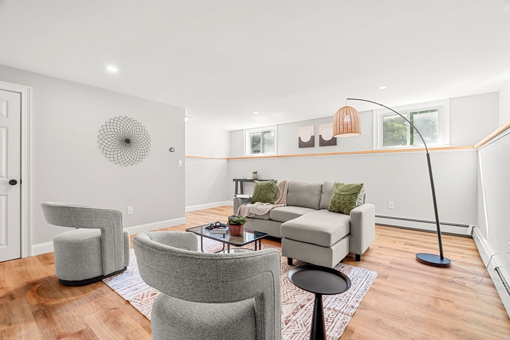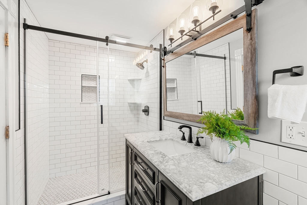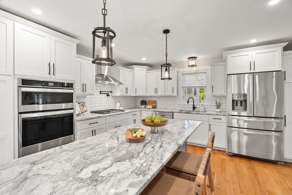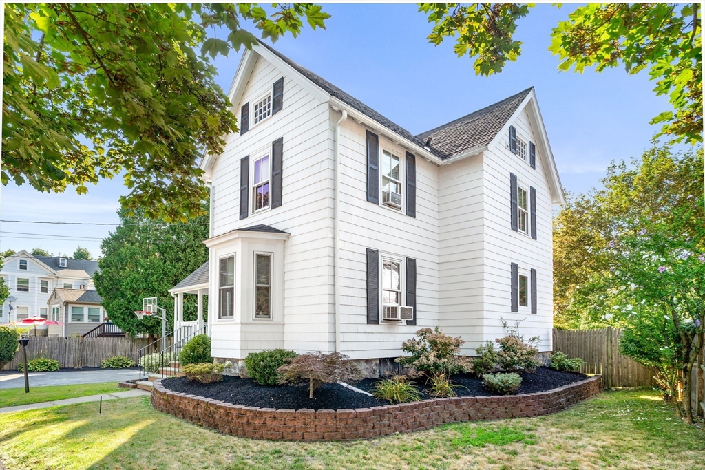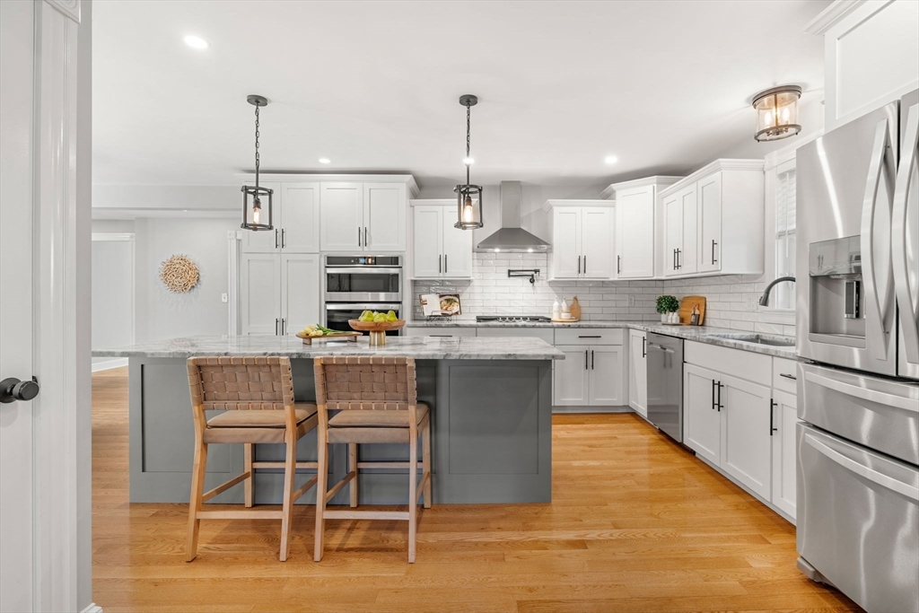 From the designer kitchen to the updated systems, 18 Byron St will make you say WOW! The front porch welcomes you into the foyer which flows beautifully into the living room with built-ins. The expertly designed kitchen features an island with seating, stainless appliances, and stone countertops perfect for the home chef. The first floor primary bedroom has vaulted ceilings and tons of closet space. A full bathroom with tiled walk in shower complete this floor. Three well-proportioned bedrooms with custom closets and another full bath complete the upstairs. The finished basement is the ideal family room, home gym, or teen hangout. The fenced back yard with custom patio and fire pit is perfect for entertaining and has hosted many movie nights and play dates. Enjoy the ideal West Side location close to the commuter rail, farmer's market, Lake Quannapowitt, Beebe Library, and Wakefield center stores and restaurants. OHS Sat 11:30-1 and Sun 1:30-3:00. Offers due 8/19@12N.