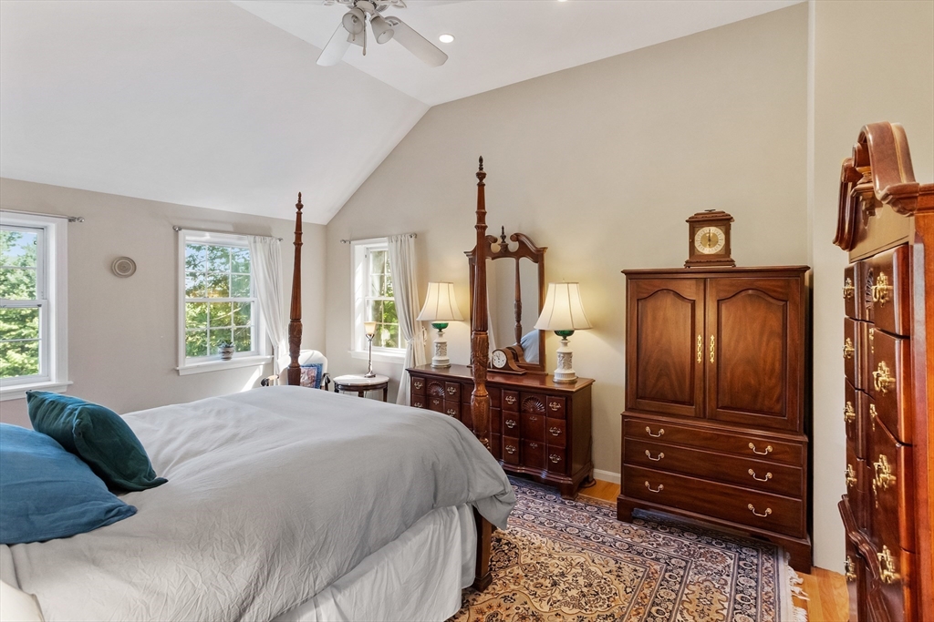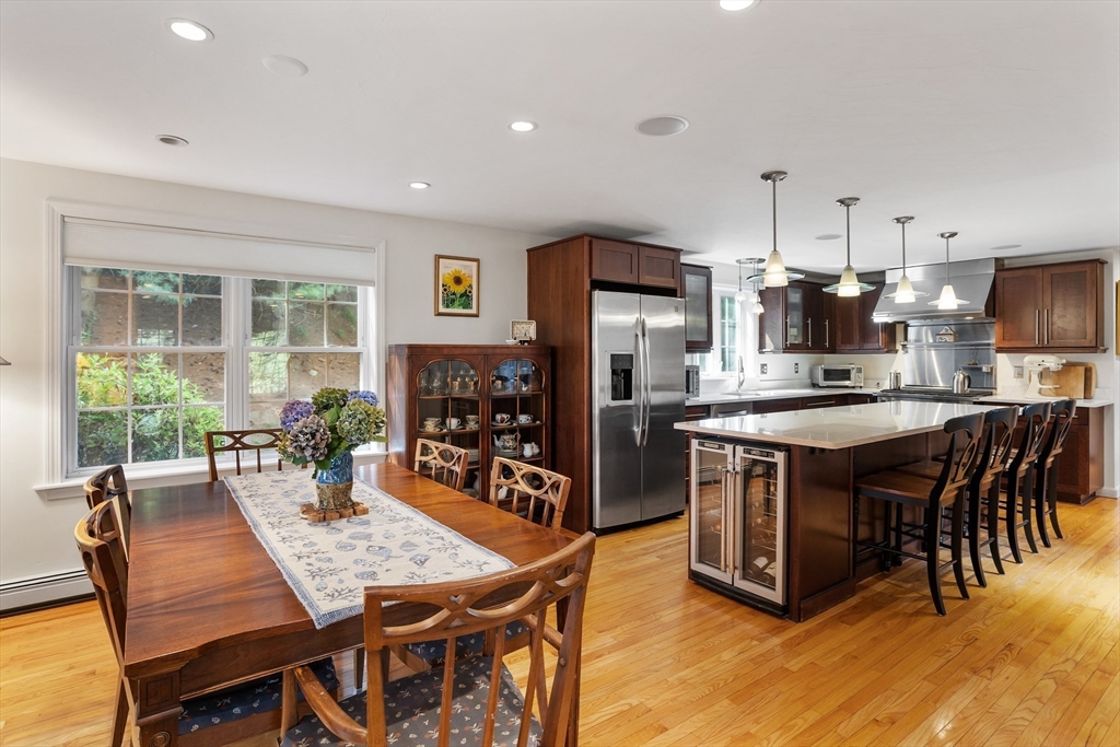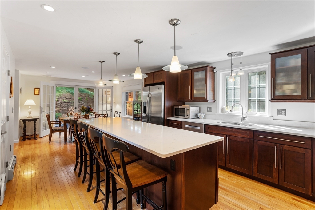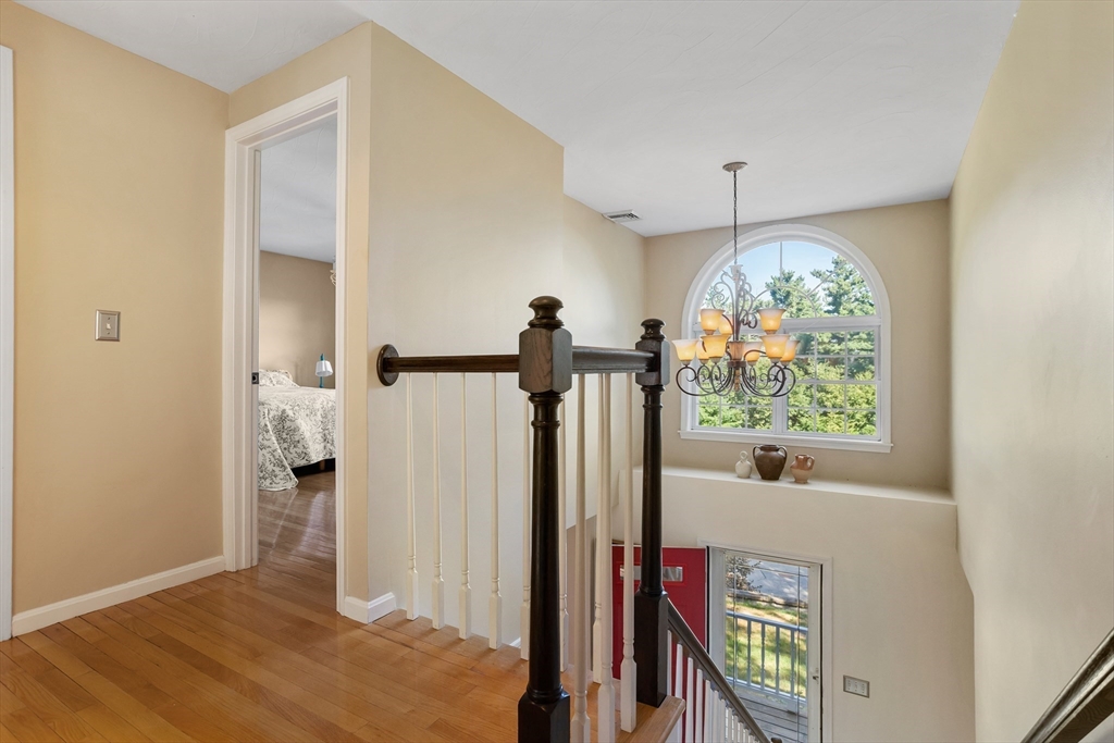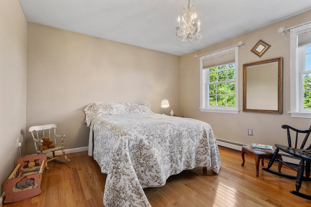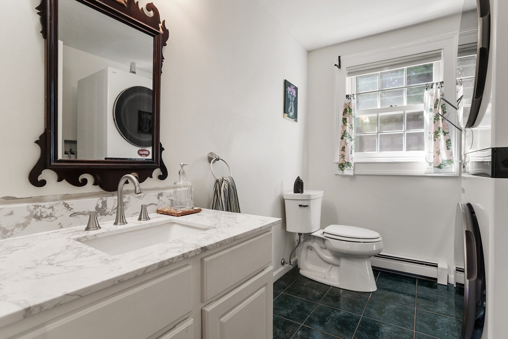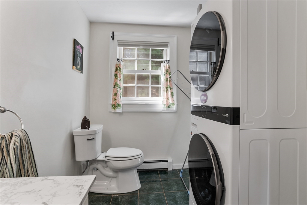 Nestled in the highly sought-after Revolution Drive neighborhood, this stunning 2,300 sq. ft. colonial offers comfort, space, and style. Featuring 3 generously sized bedrooms and 2.5 baths. The heart of the home is a modern kitchen complete with a sprawling center island—ideal for casual meals or hosting friends and family. Just off the kitchen, a warm and inviting fireplaced living room provides the perfect spot to relax. A versatile formal dining room (or potential home office/den) adds flexibility to the main level, along with a convenient half bath and first-floor laundry. Upstairs, the spacious en suite primary bedroom offers a private retreat, while two additional bedrooms share a full bath. The finished basement provides the perfect bonus area for a craft room, home office, or recreation space. Step outside through sliding doors to an expansive custom patio—beautifully bordered by mature trees for privacy.
