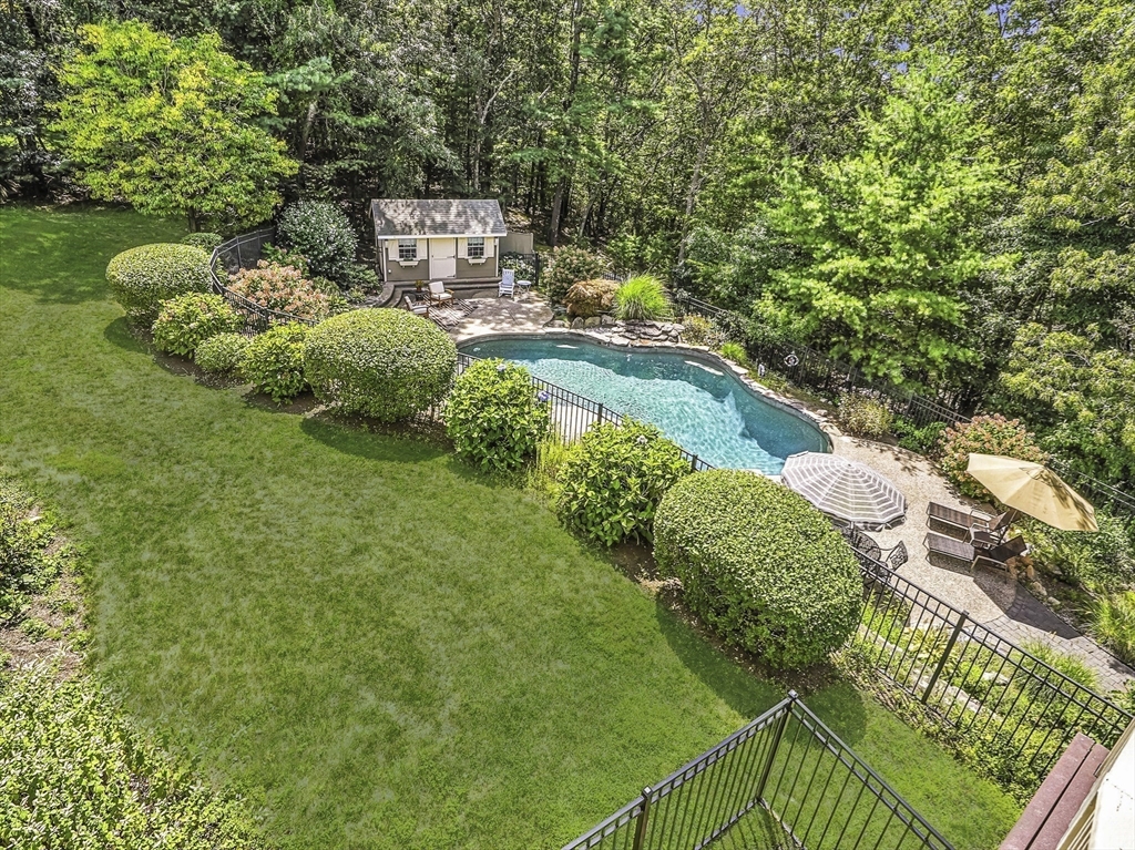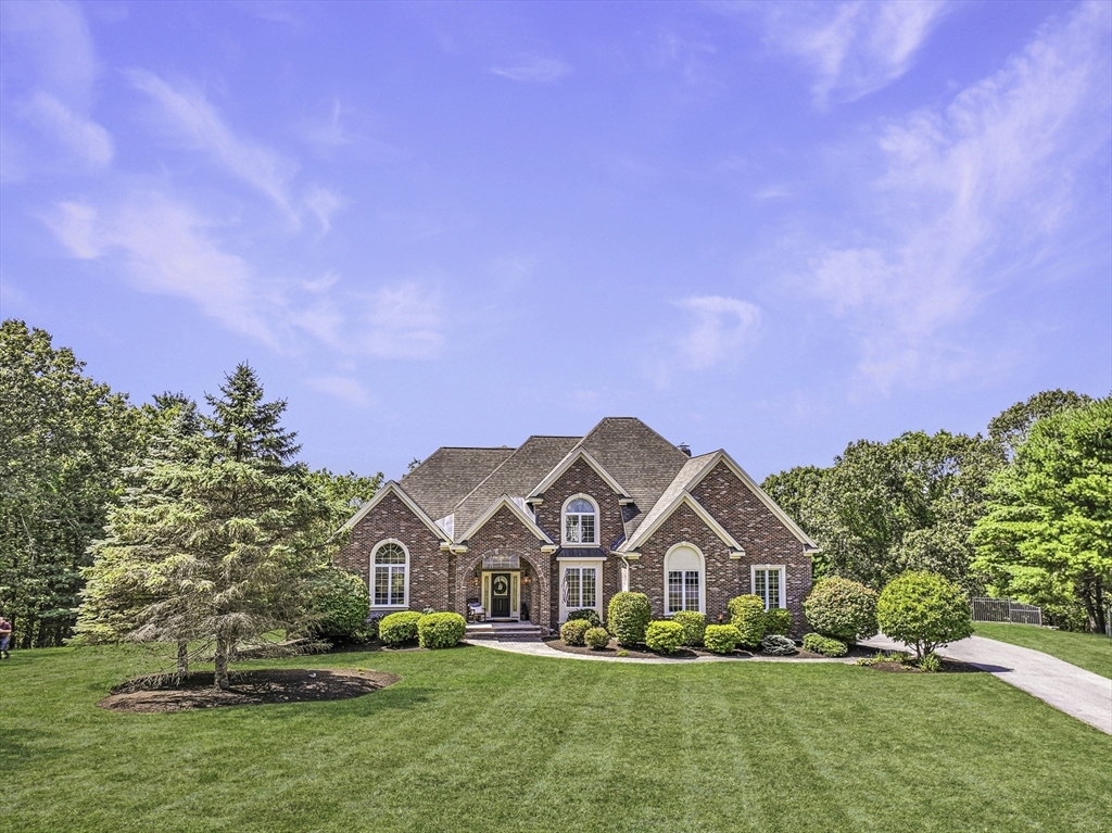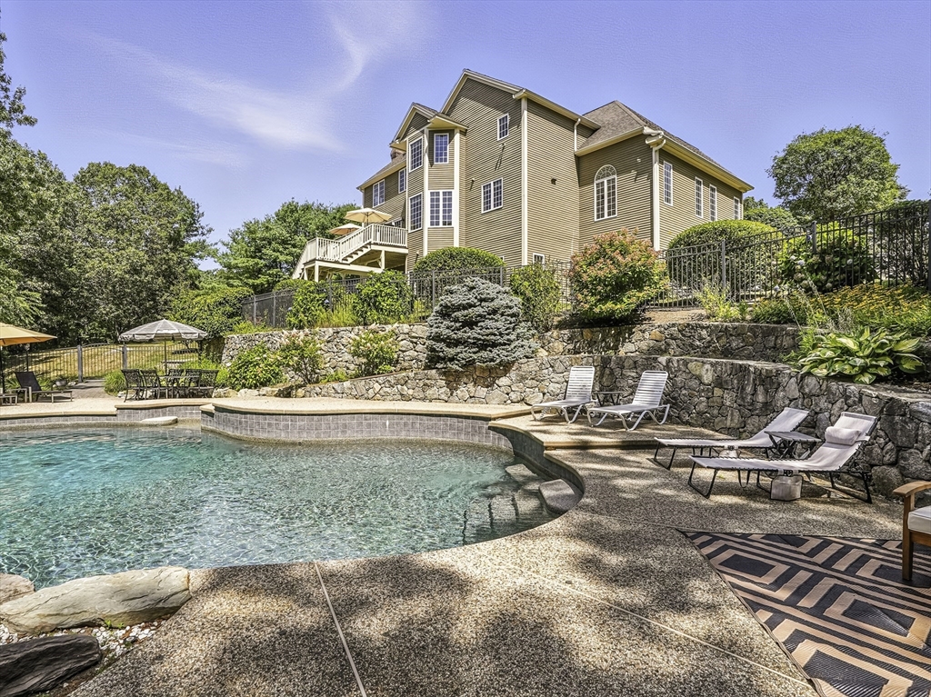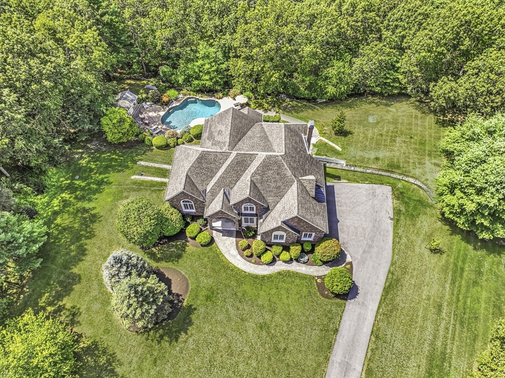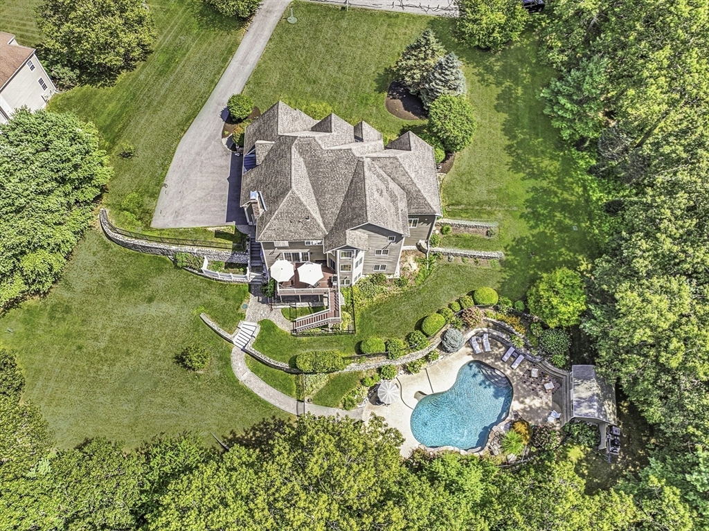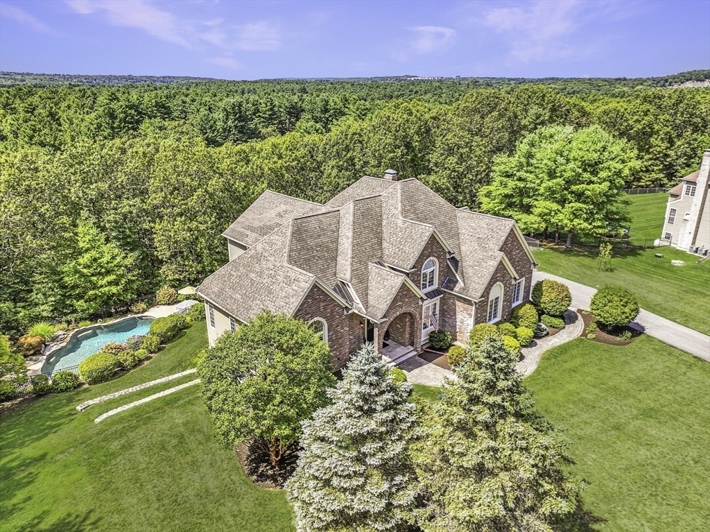Exquisite, custom-built French Country masterpiece gracefully nestled on 2 private acres in coveted cul-de-sac. Prepare to be captivated by the home’s elegant sophistication, soaring ceilings, intricate millwork & timeless architectural details. Entertain effortlessly in formal living & dining rooms, designed w refined finishes. Sun-drenched chef’s kitchen outfitted w NEW Bosch appliances including refrig, double ovens & dishwasher flows into expansive family room w stately wood-burning fireplace & access to Trex deck—perfect for BBQs. Work from home in the private office, adorned w French doors. Upstairs, discover 4 en suite bedrooms w hardwood floors & walk-in closets. Walkout lower level w 12-ft ceilings, bar, rec/playroom & full bath. Private backyard oasis awaits w heated pool, cascading waterfall & surrounded by multiple seating areas to for unwind or host gatherings under the stars. New propane heating & CA. Enjoy easy access to Top-rated schools, commuter rail & I90 & parks.