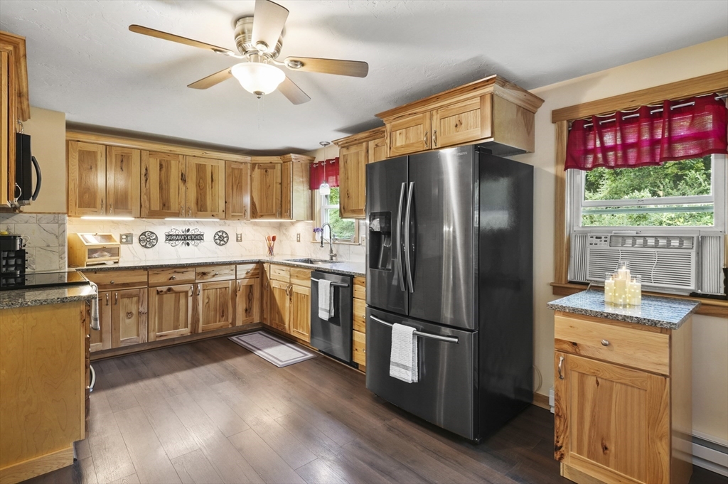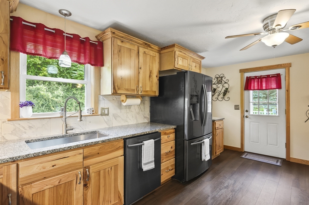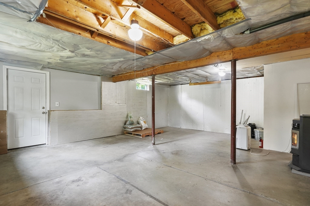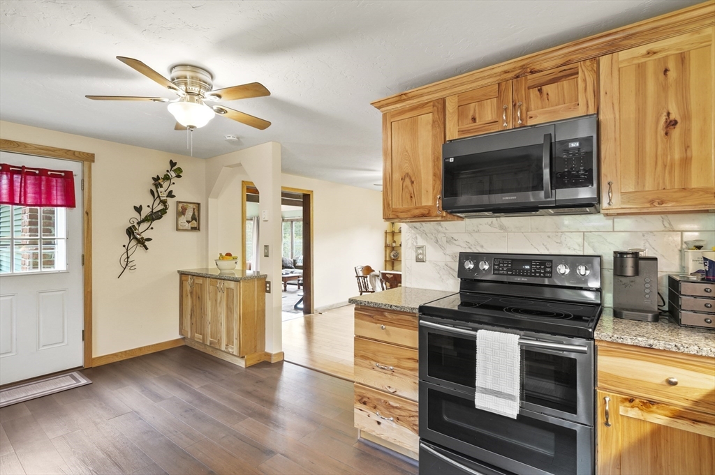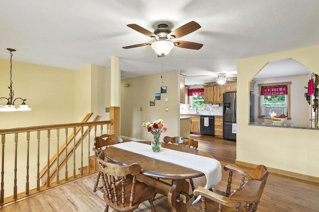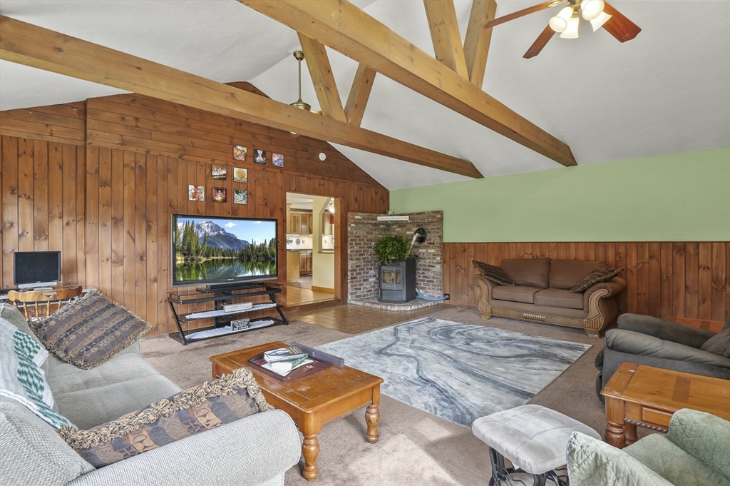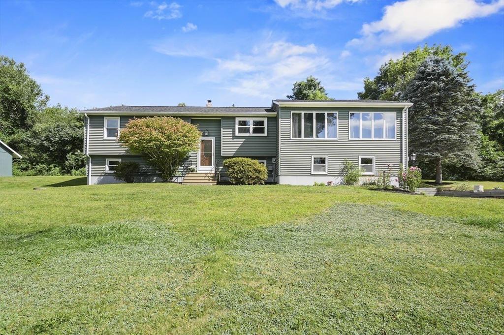 Welcome to this inviting split-entry home in Leicester, offering a thoughtful layout and plenty of charm. The warm, cabinet-packed kitchen features stainless steel appliances, granite counters, and a stylish tile backsplash, opening to the dining room with a convenient passthrough window. The spacious living room impresses with its beamed cathedral ceiling, wood panel accent wall, and cozy pellet stove. Two bedrooms, including the primary, and a full bath complete the main level. Downstairs, the partially finished lower level adds a third bedroom, another full bath, and a second pellet stove for year-round comfort. Enjoy the convenience of an attached garage, ample off-street parking, and great outdoor living with a large yard, composite deck, and storage shed.