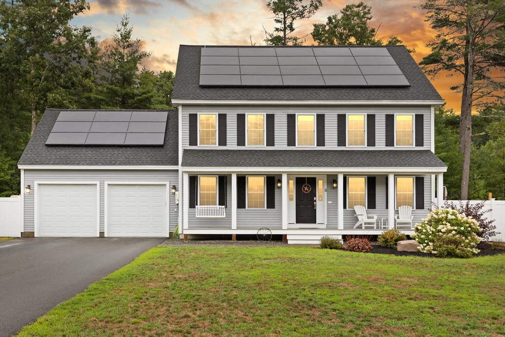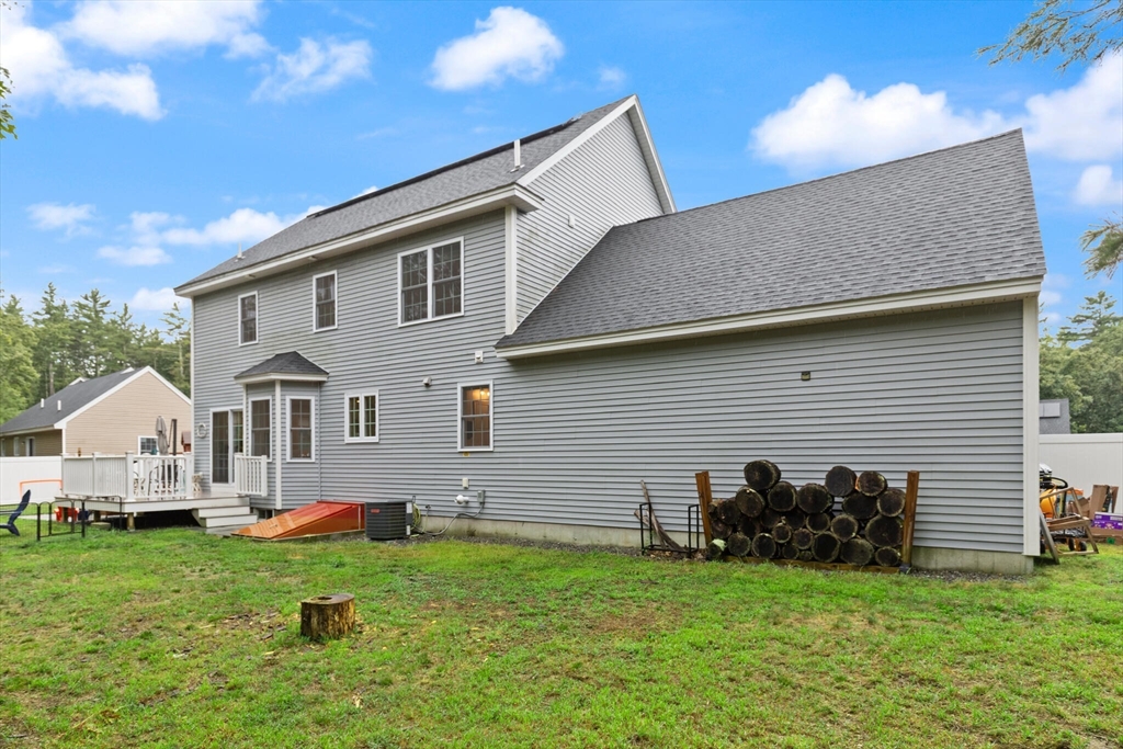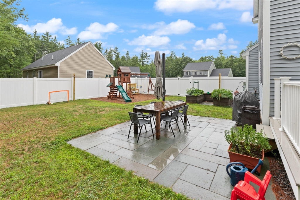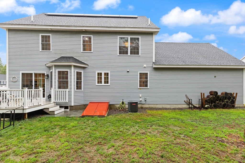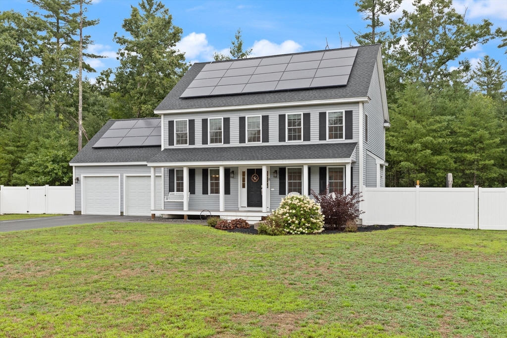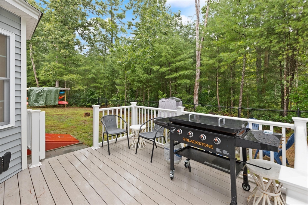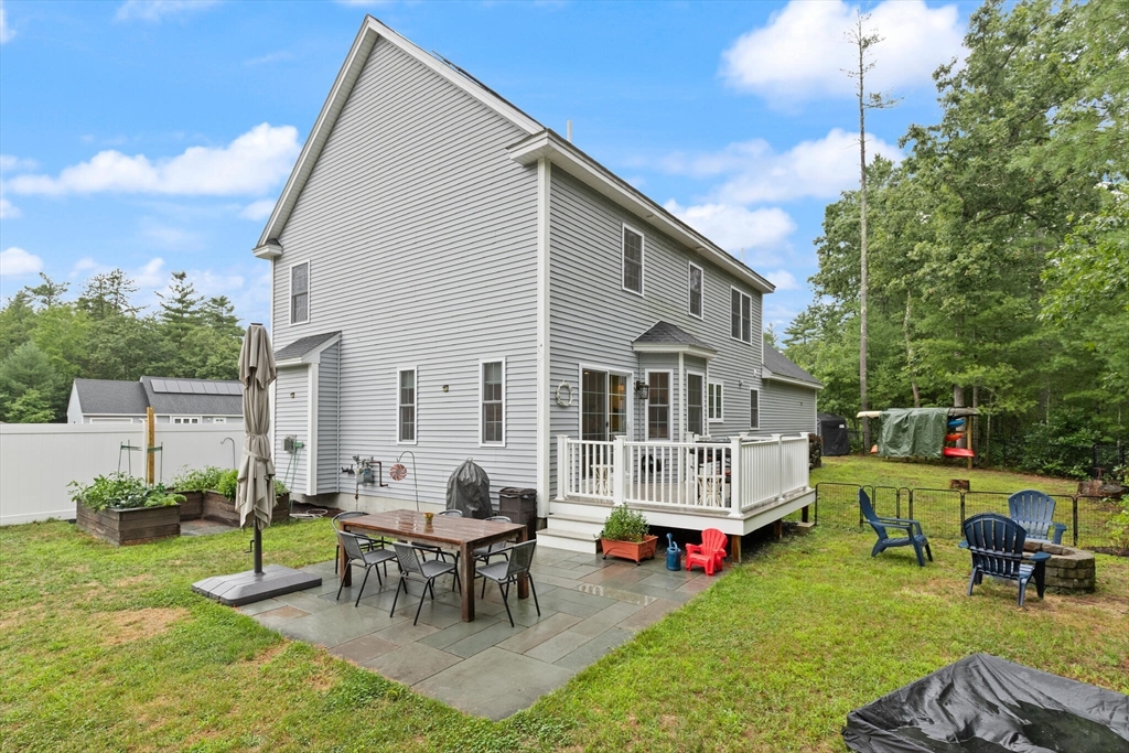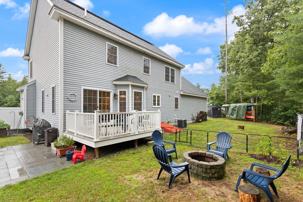 An amazing opportunity to own a 'better-than-new' center entrance colonial on a dead-end street in Townsend, right over the boarder from Pepperell and Groton. Open concept living encompaces kitchen, dining, family, and living rooms. Eat-in kitchen has white shaker cabinets and large quartz island with room for 3 barstools. Gas fireplace in living rm. Family rm has sliders to deck and backyard oasis - fully fenced and thoughtfully designed with deck and patio and optional playstructure. First floor is complete with half bath and direct entry from the garage. Hardwood floors on 1st floor run up the threads and in hallway upstairs, where 3 bedrooms all have wall-to-wall carpet and overhead lighing. Main bedroom has recessed lighting, walk-in closet with built-ins as well as en-suite bath with shower and dual vanity. The basement was finished by builder upon construction and has an extra deep foundation giving it 9ft and 8ft ceilings (1/2+1/2) making it truly usable space.