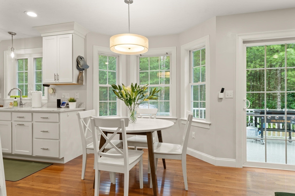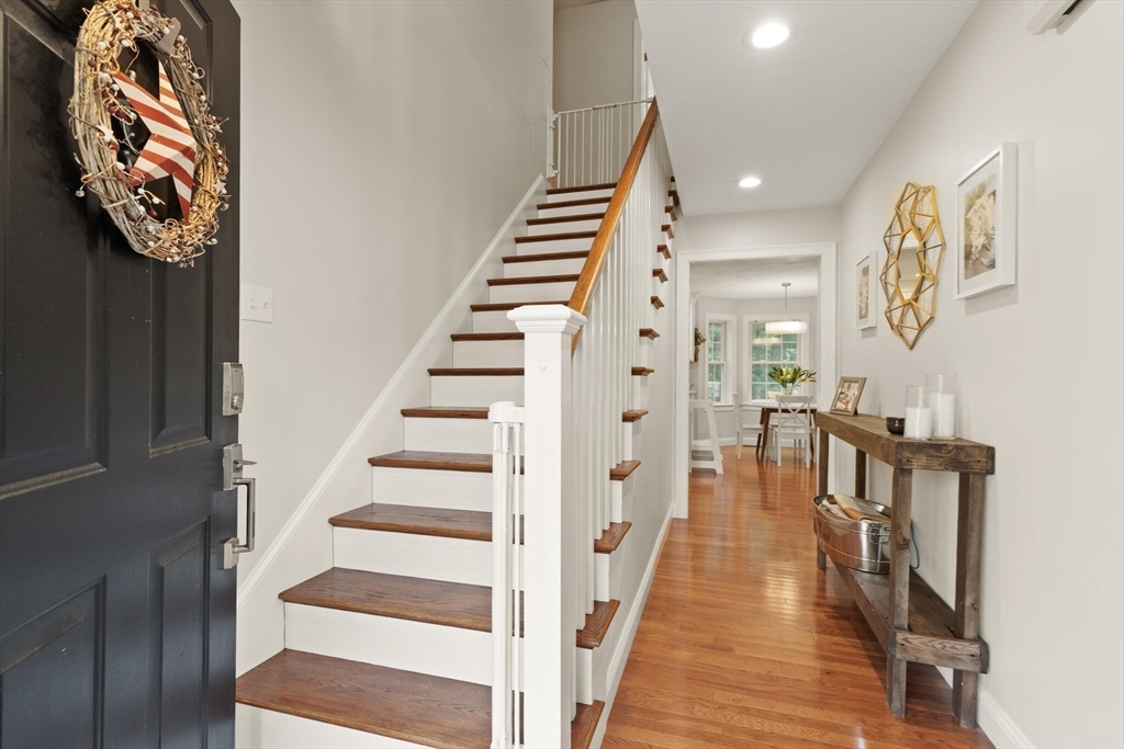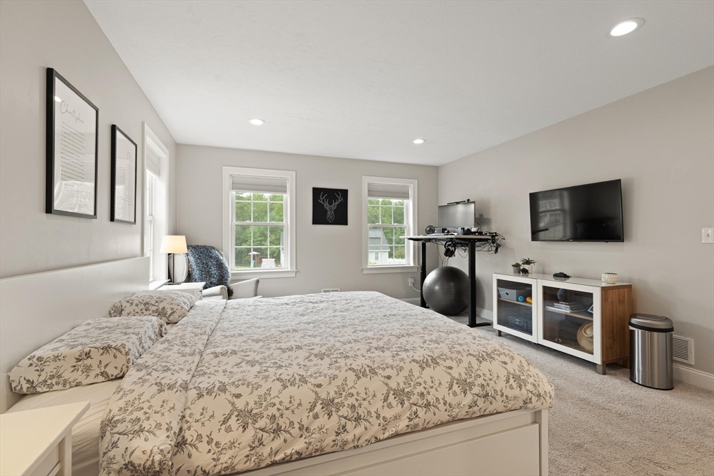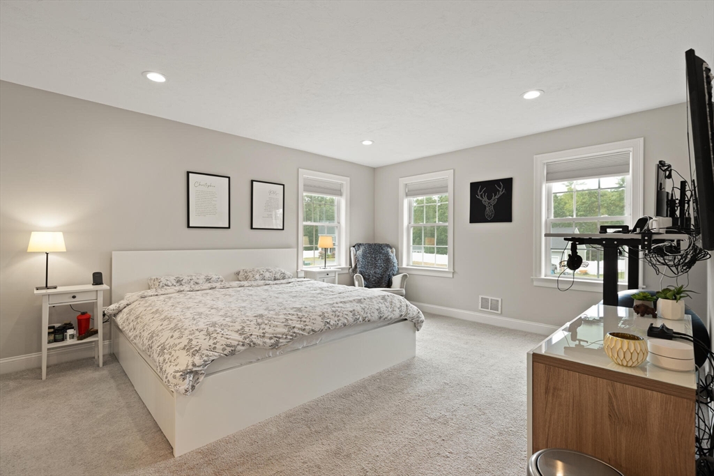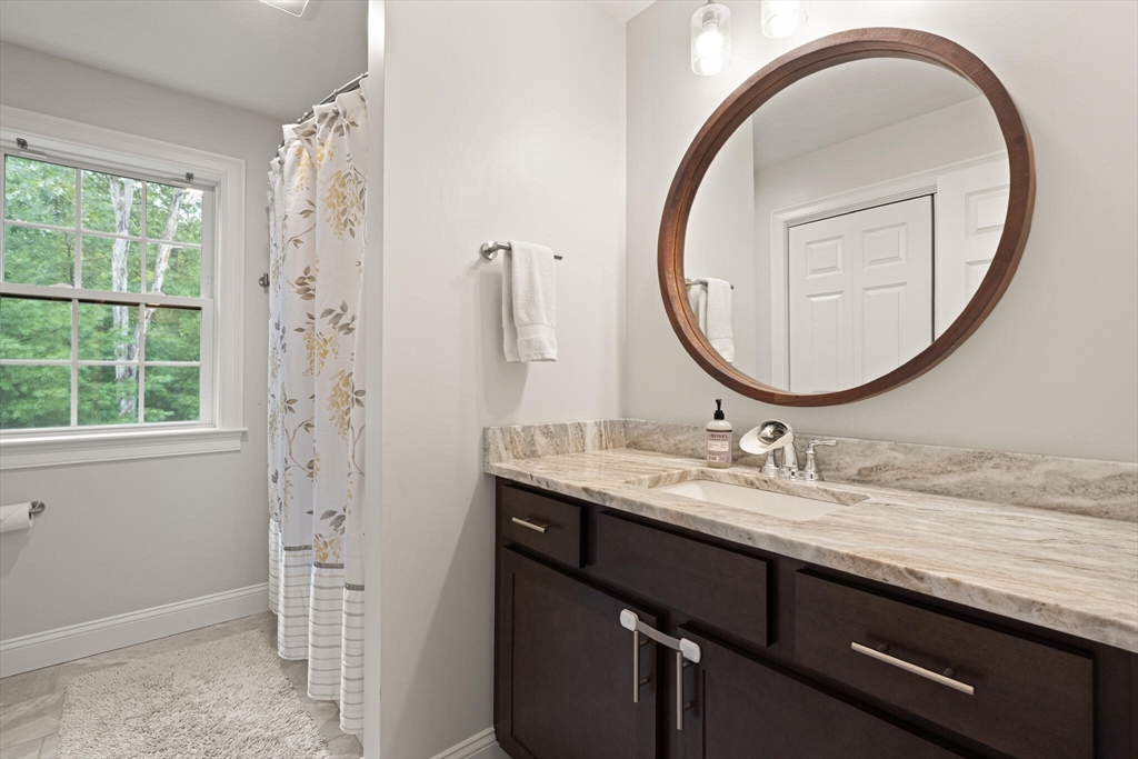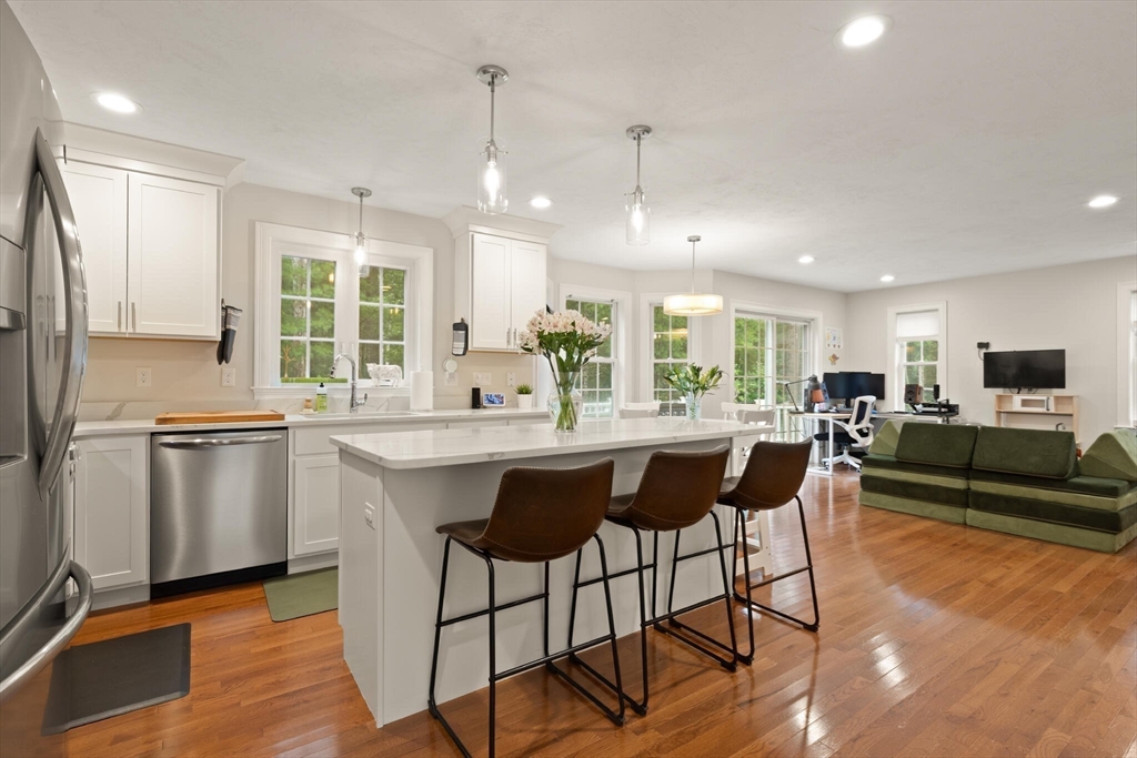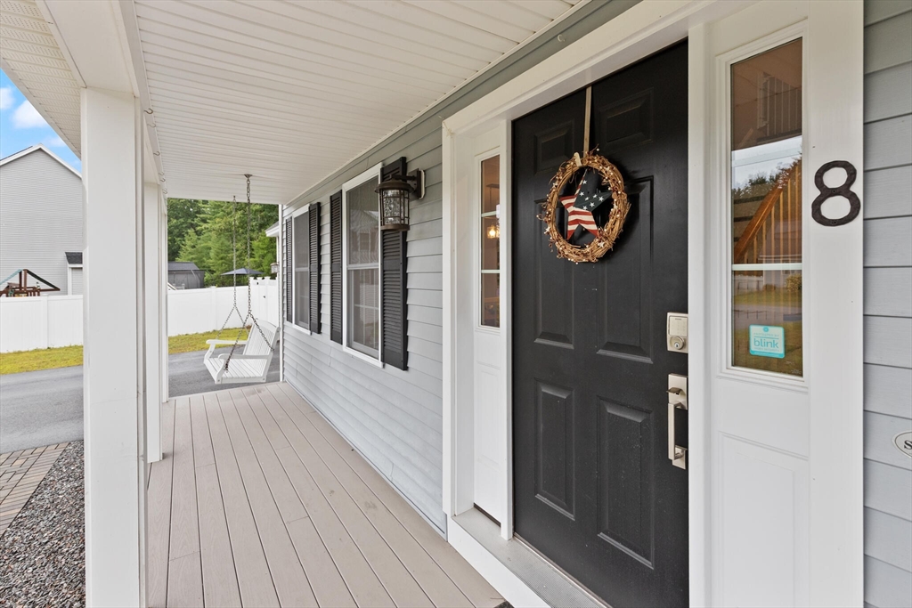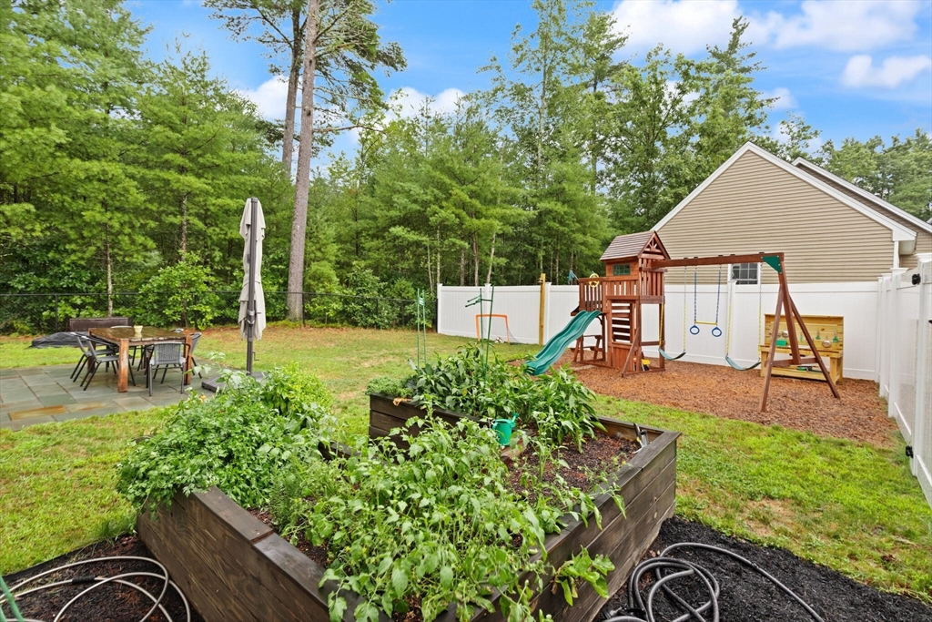 An amazing opportunity to own a 'better-than-new' center entrance colonial on a dead-end street in Townsend, right over the boarder from Pepperell and Groton. Open concept living encompaces kitchen, dining, family, and living rooms. Eat-in kitchen has white shaker cabinets and large quartz island with room for 3 barstools. Gas fireplace in living rm. Family rm has sliders to deck and backyard oasis - fully fenced and thoughtfully designed with deck and patio and optional playstructure. First floor is complete with half bath and direct entry from the garage. Hardwood floors on 1st floor run up the threads and in hallway upstairs, where 3 bedrooms all have wall-to-wall carpet and overhead lighing. Main bedroom has recessed lighting, walk-in closet with built-ins as well as en-suite bath with shower and dual vanity. The basement was finished by builder upon construction and has an extra deep foundation giving it 9ft and 8ft ceilings (1/2+1/2) making it truly usable space.