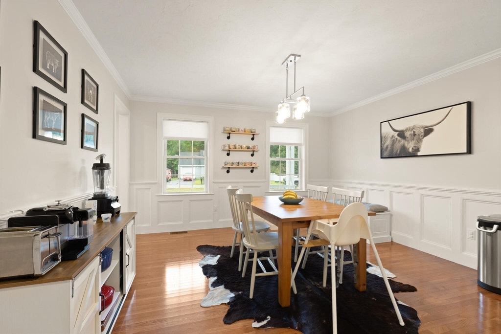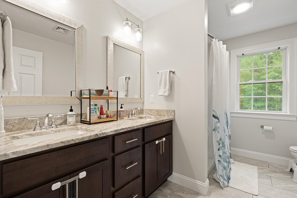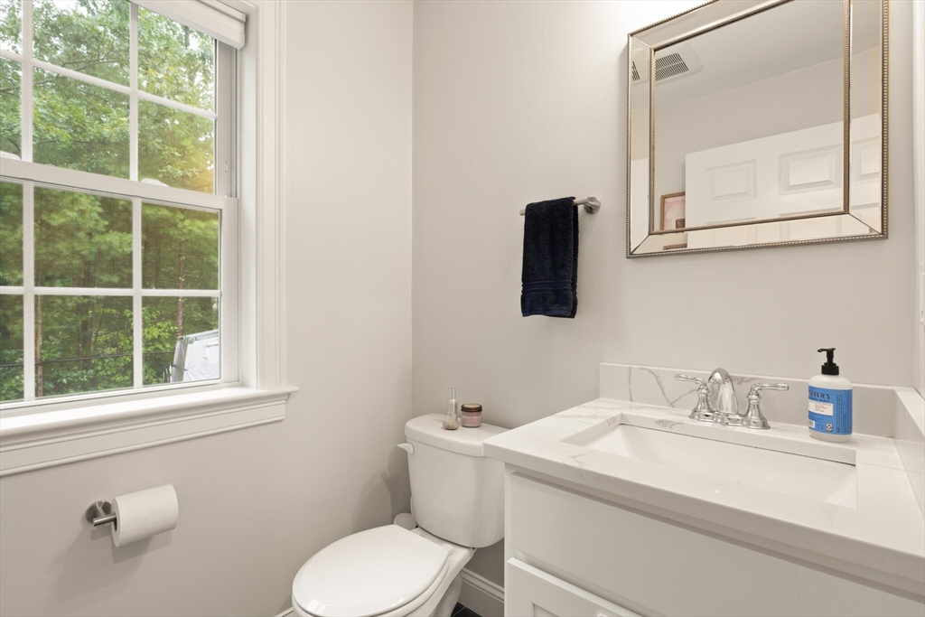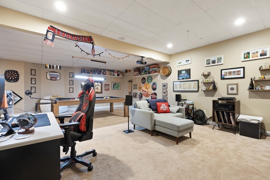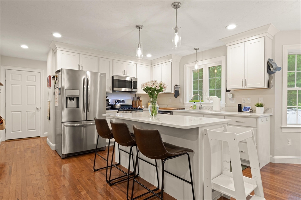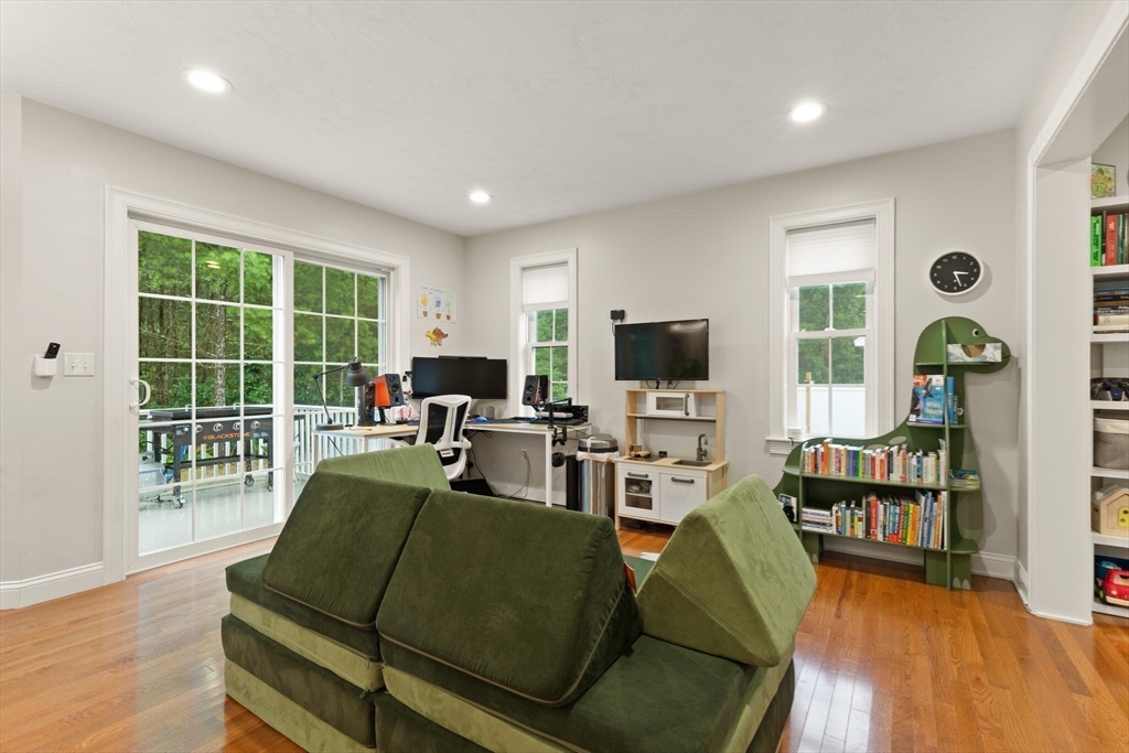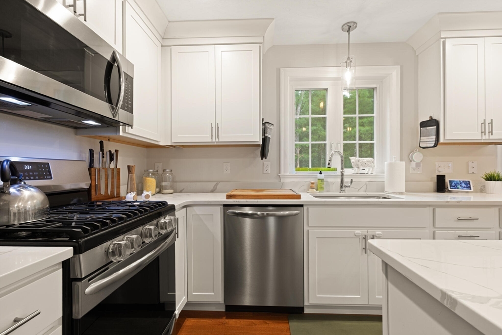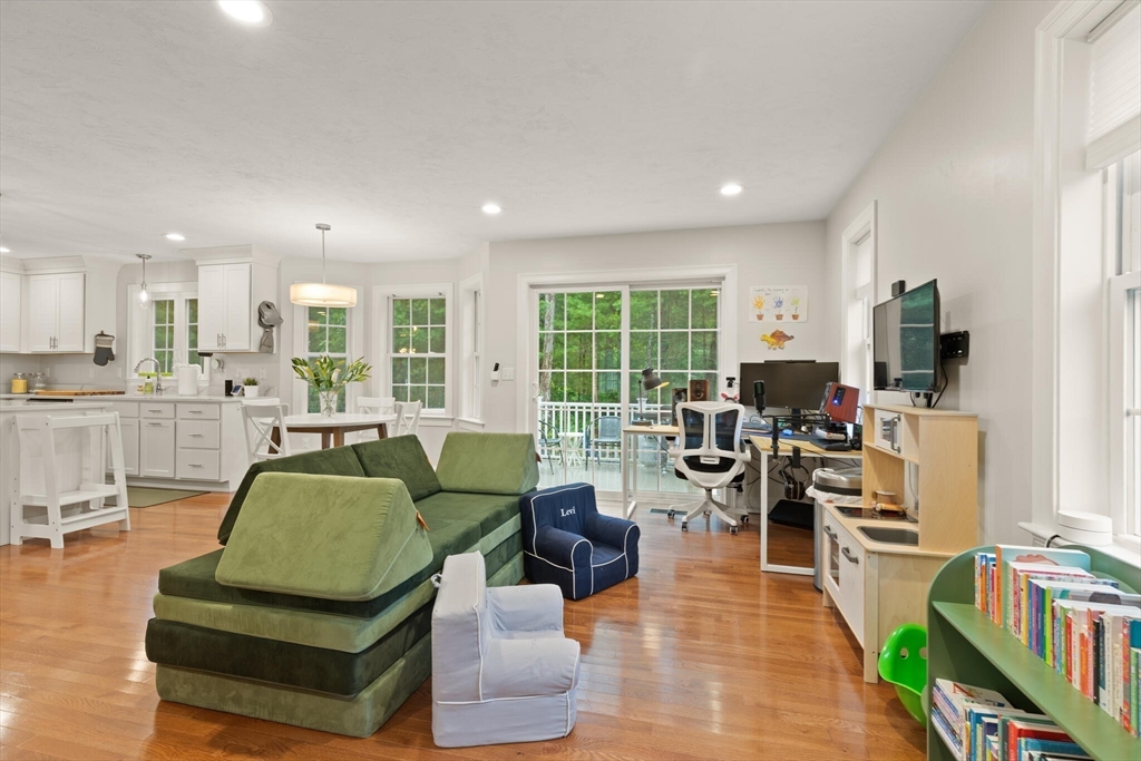 An amazing opportunity to own a 'better-than-new' center entrance colonial on a dead-end street in Townsend, right over the boarder from Pepperell and Groton. Open concept living encompaces kitchen, dining, family, and living rooms. Eat-in kitchen has white shaker cabinets and large quartz island with room for 3 barstools. Gas fireplace in living rm. Family rm has sliders to deck and backyard oasis - fully fenced and thoughtfully designed with deck and patio and optional playstructure. First floor is complete with half bath and direct entry from the garage. Hardwood floors on 1st floor run up the threads and in hallway upstairs, where 3 bedrooms all have wall-to-wall carpet and overhead lighing. Main bedroom has recessed lighting, walk-in closet with built-ins as well as en-suite bath with shower and dual vanity. The basement was finished by builder upon construction and has an extra deep foundation giving it 9ft and 8ft ceilings (1/2+1/2) making it truly usable space.