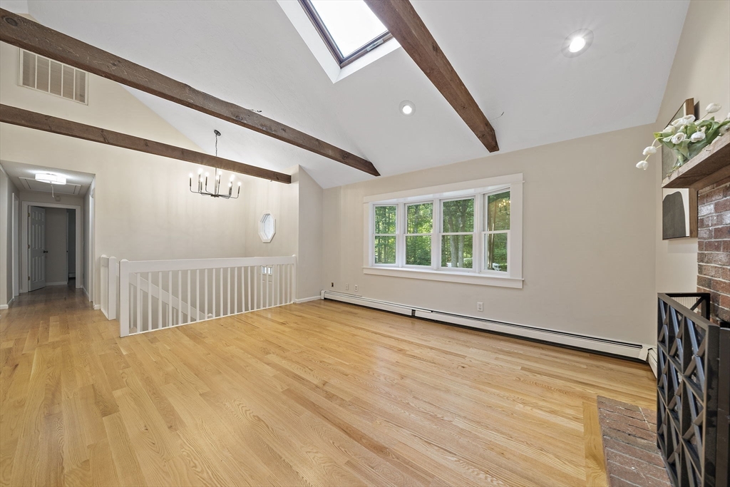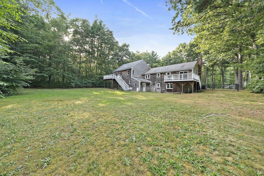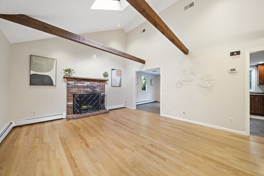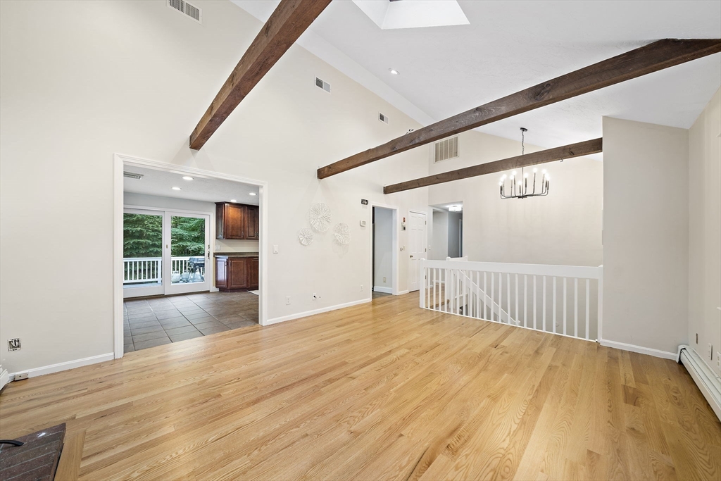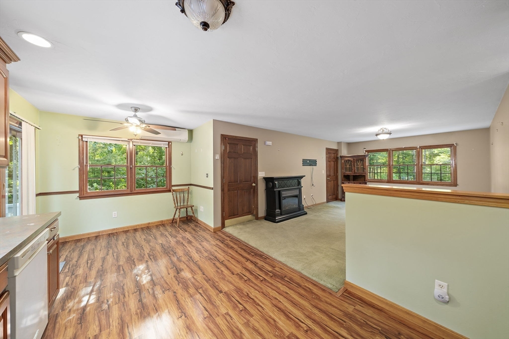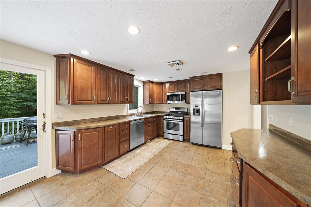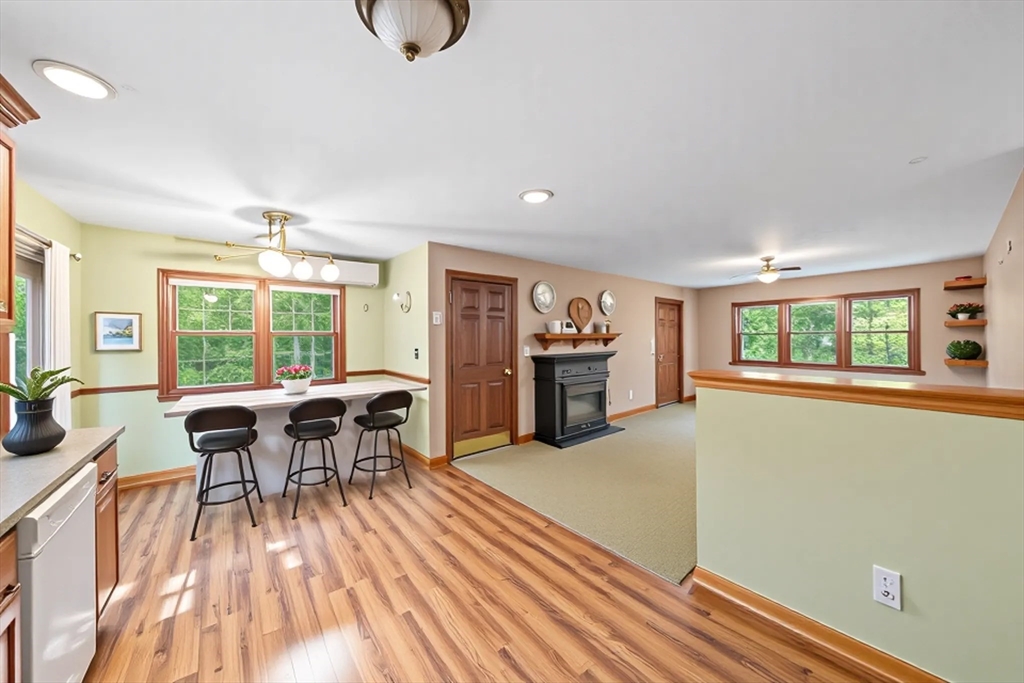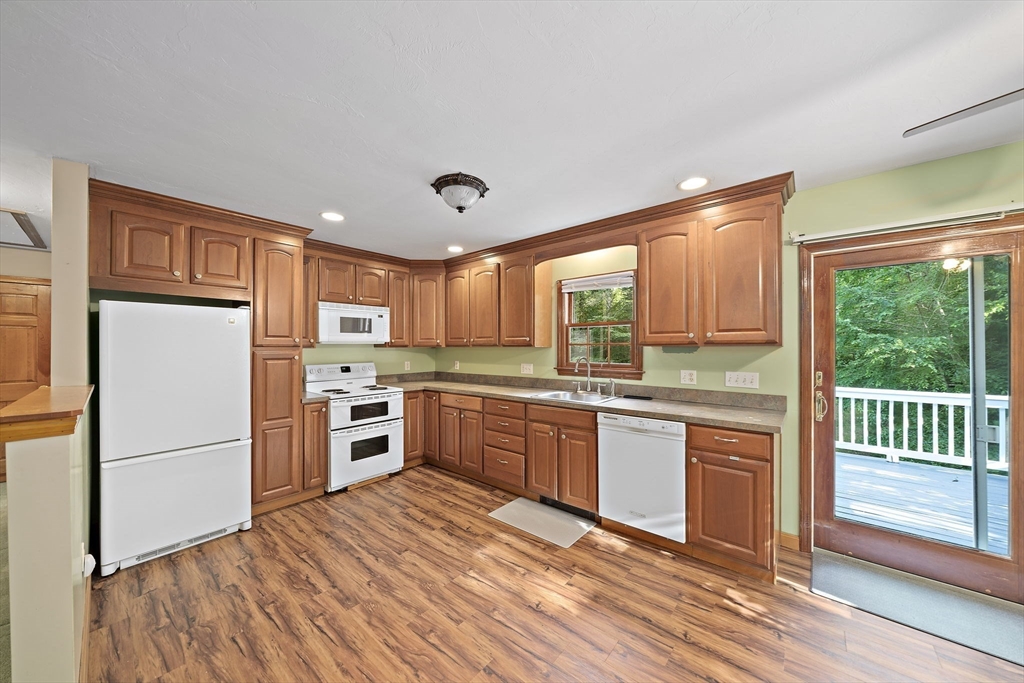 This spacious home truly has room for everyone! The main house welcomes you with a dramatic cathedral-ceiling family room complete with a wood-burning fireplace, leading into a generous eat-in kitchen and large deck overlooking the backyard.The main level features three bedrooms and an updated full bath, with newly installed oak hardwood flooring and fresh paint throughout 1st floor. The walk-out lower level expands the living space with a 2nd fireplaced family room, full bath, kitchenette and office/bedroom perfect for guests, extended family, or a private retreat. A massive addition enhances the property with an oversized two-car garage and a completely separate one-bedroom in-law suite above with its own private deck and laundry offering ultimate independence Set on a level 1.4 acre lot in a highly convenient neighborhood with walking trails and quick access to highways, shopping, and dining, this property provides endless possibilities for multi-generational living or rental income