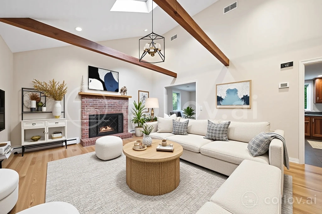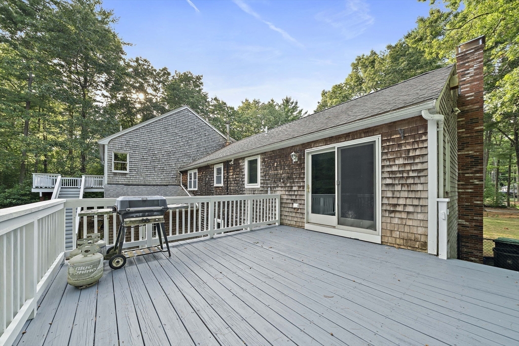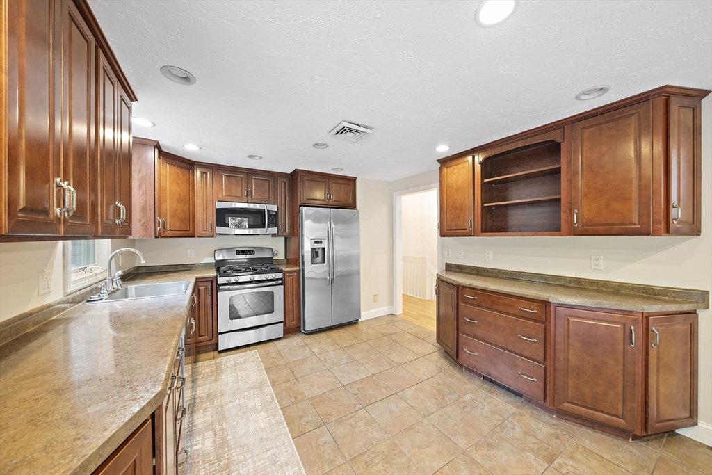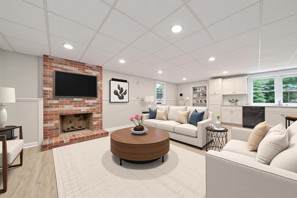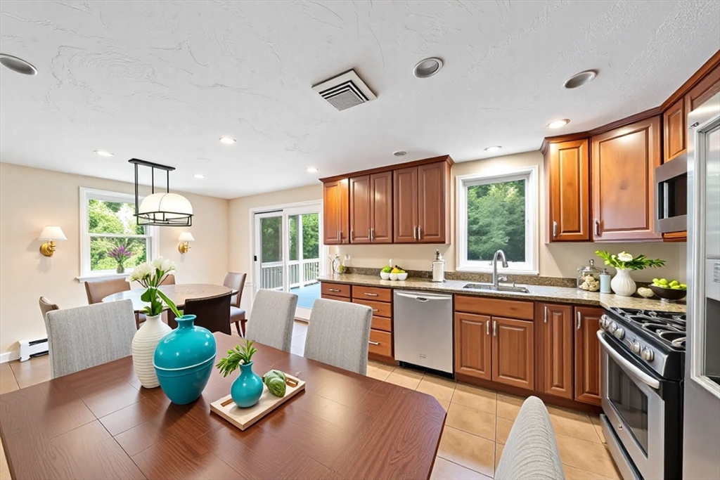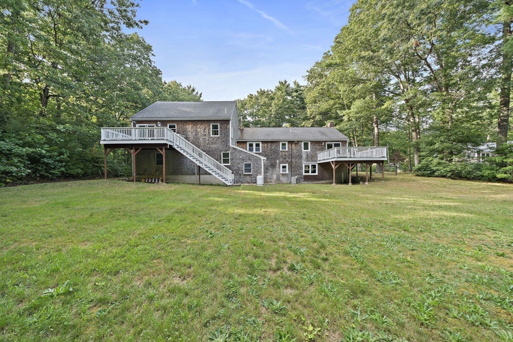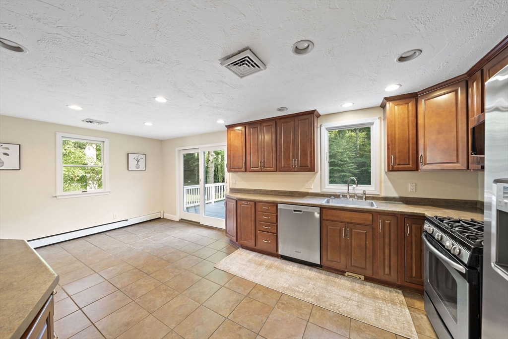 This spacious home truly has room for everyone! The main house welcomes you with a dramatic cathedral-ceiling family room complete with a wood-burning fireplace, leading into a generous eat-in kitchen and large deck overlooking the backyard.The main level features three bedrooms and an updated full bath, with newly installed oak hardwood flooring and fresh paint throughout 1st floor. The walk-out lower level expands the living space with a 2nd fireplaced family room, full bath, kitchenette and office/bedroom perfect for guests, extended family, or a private retreat. A massive addition enhances the property with an oversized two-car garage and a completely separate one-bedroom in-law suite above with its own private deck and laundry offering ultimate independence Set on a level 1.4 acre lot in a highly convenient neighborhood with walking trails and quick access to highways, shopping, and dining, this property provides endless possibilities for multi-generational living or rental income