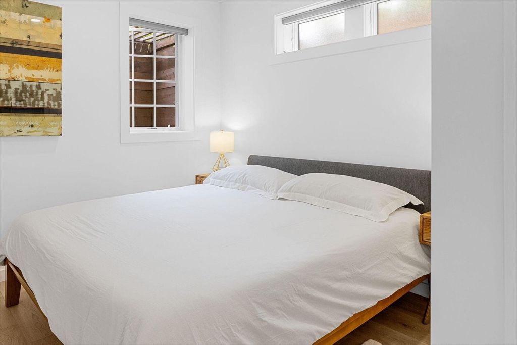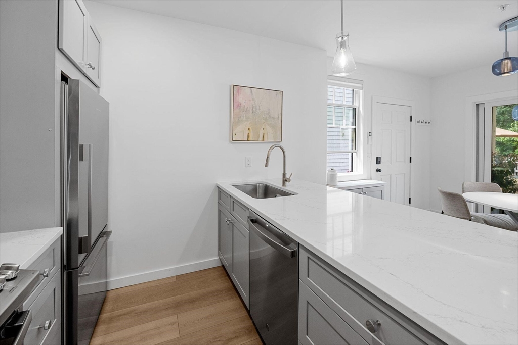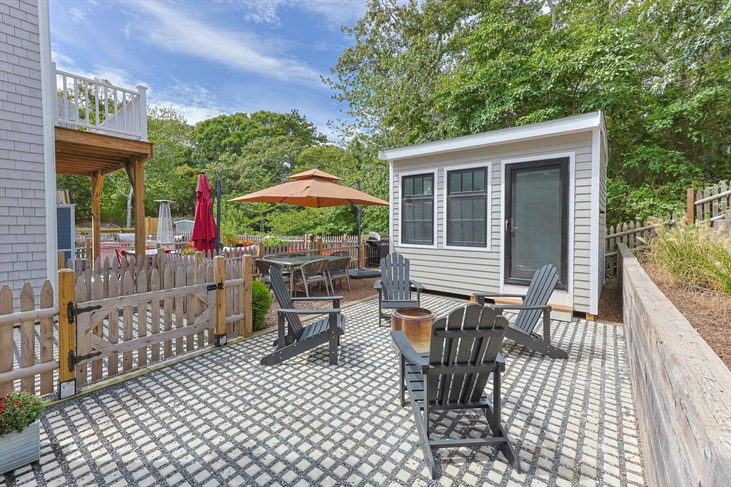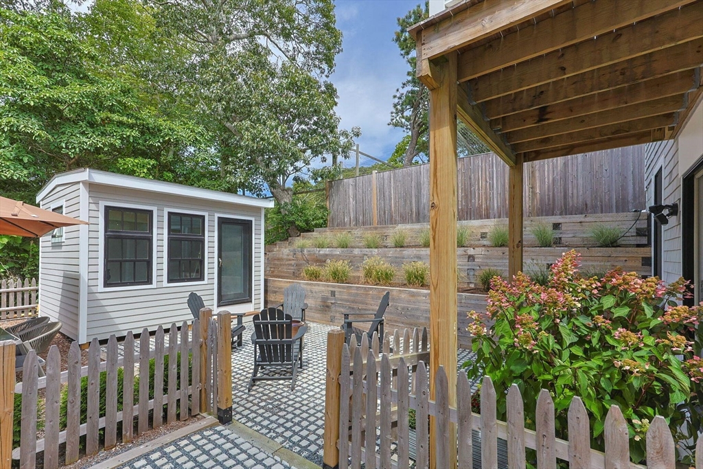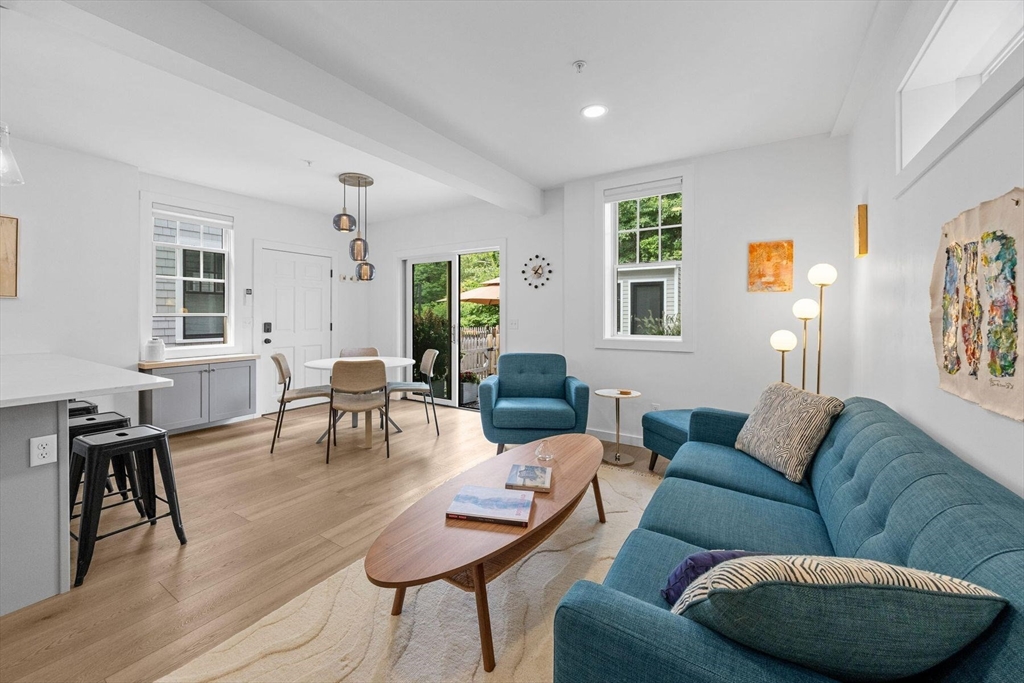 Located near the Provincetown Tennis Club, this 2021 garden-level condo combines modern design with everyday ease. Lightly lived in, it features nearly 9-foot ceilings, an open-concept layout, and a kitchen with upgraded cabinetry, high-end appliances, and a stone peninsula with seating for four. The spacious living and dining area flows seamlessly outdoors to a beautifully landscaped patio, perfect for entertaining or relaxing. A custom 110 sq. ft. shed offers ample storage for bikes, gear, and garden supplies, while an exclusive-use wooded area of about 9,000 sq. ft. provides privacy and potential for future use, such as an artist’s studio. With two bedrooms and two bathrooms, this rare East End property balances comfort, style, and convenience in one inviting package.