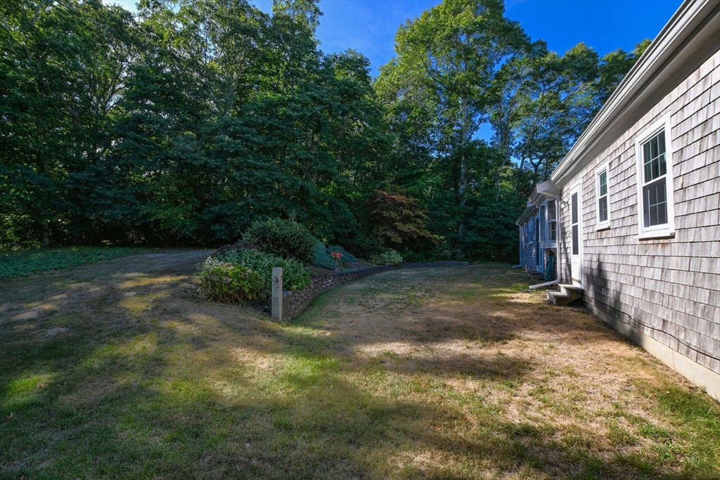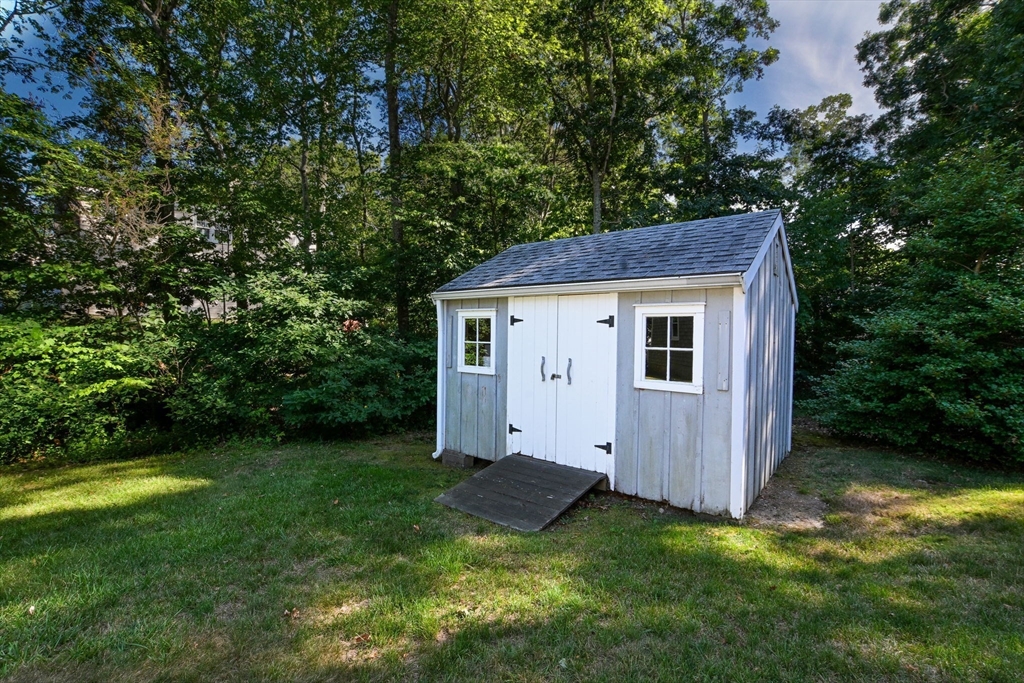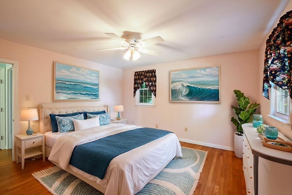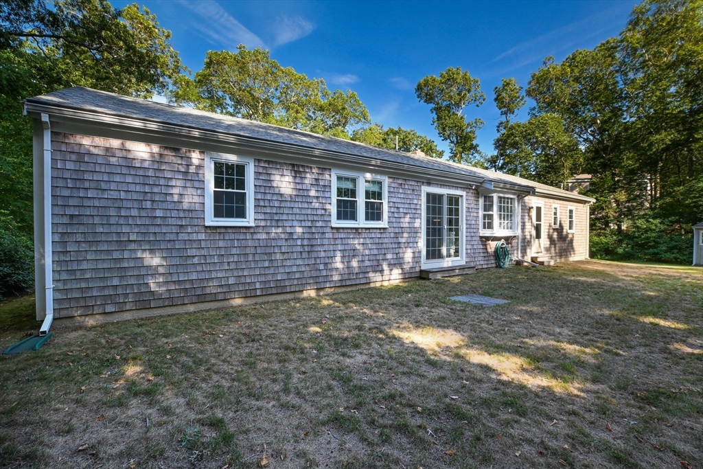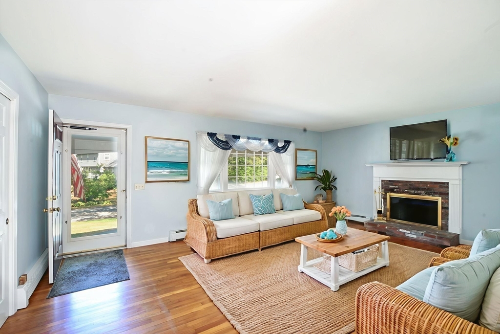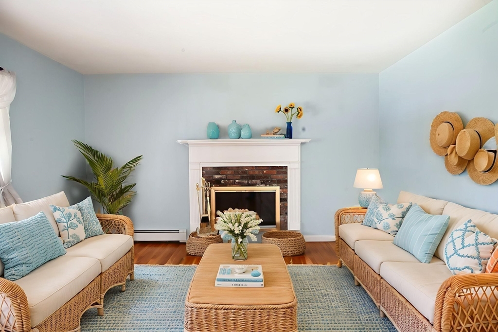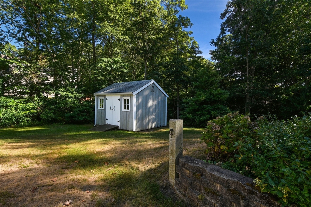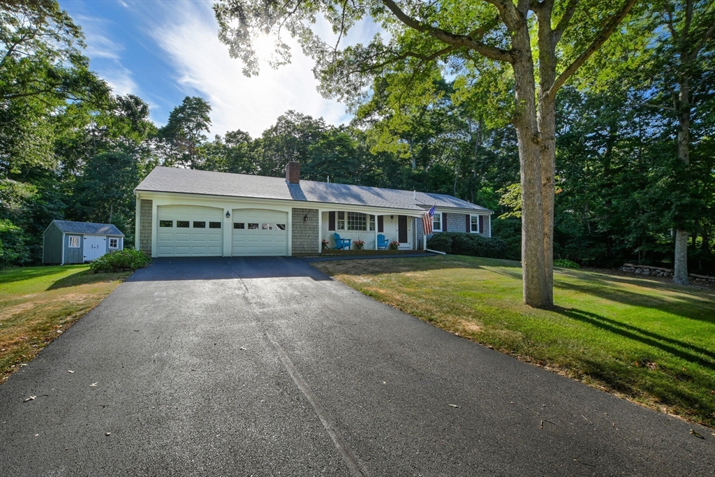 Meticulously cared for home tucked away on a quiet cul-de-sac minutes from town. Set on a 2/3 acre wooded lot, it offers privacy while still being part of the Galloping Hills neighborhood. The inviting front porch is perfect for relaxing, and the attached two-car garage makes bringing in groceries easy. Inside, you'll find hardwood floors, a cozy wood-burning fireplace, and an updated kitchen with quartz countertops. The primary bedroom includes its own ¾ bath and a walk-in closet. Two additional bedrooms share a full bath, and there's a bonus room ideal for guests, a home office, or den. The basement has built-in storage shelves, and a backyard shed holds lawn tools and equipment. Many updates over the years, including roof, kitchen, baths, windows & double lined oil tank. Enjoy easy access to nearby beaches, downtown shopping and dining, the marina, and the Cape Cod Canal. This home offers a perfect blend of comfort, privacy, and convenience.