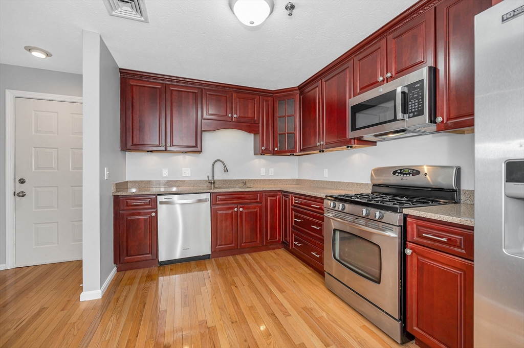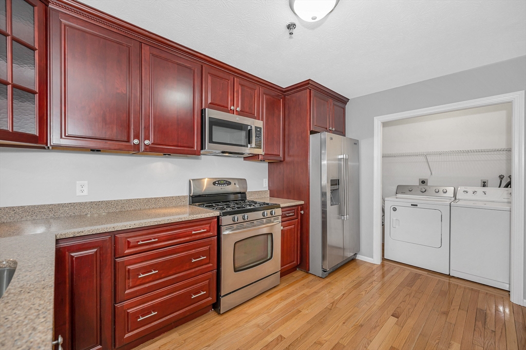 *YOU MUST SEE* this 55+ community, Garden style condo that has been nicely updated and cared for. This unit has been freshly painted in a neutral color to match any decor. Hardwood flooring leads you through the kitchen, dining room, living room and your two bedrooms. The kitchen has stainless steel appliances, updated cabinets with under cabinet lighting and granite countertops. This lovely unit is also equipped with it's own washer and dryer for your convenience. Spacious living room and dining room has sliders out to your private balcony overlooking the peaceful grounds. Primary bedroom has ensuite bath with a second bedroom for guests or your choice of uses. The second full bath has tile flooring and a tub/shower unit. This appealing brick building is also equipped with an intercom and elevator directly from the garage. Come and take a look at this wonderful END UNIT with deeded parking spot right next to the elevator!