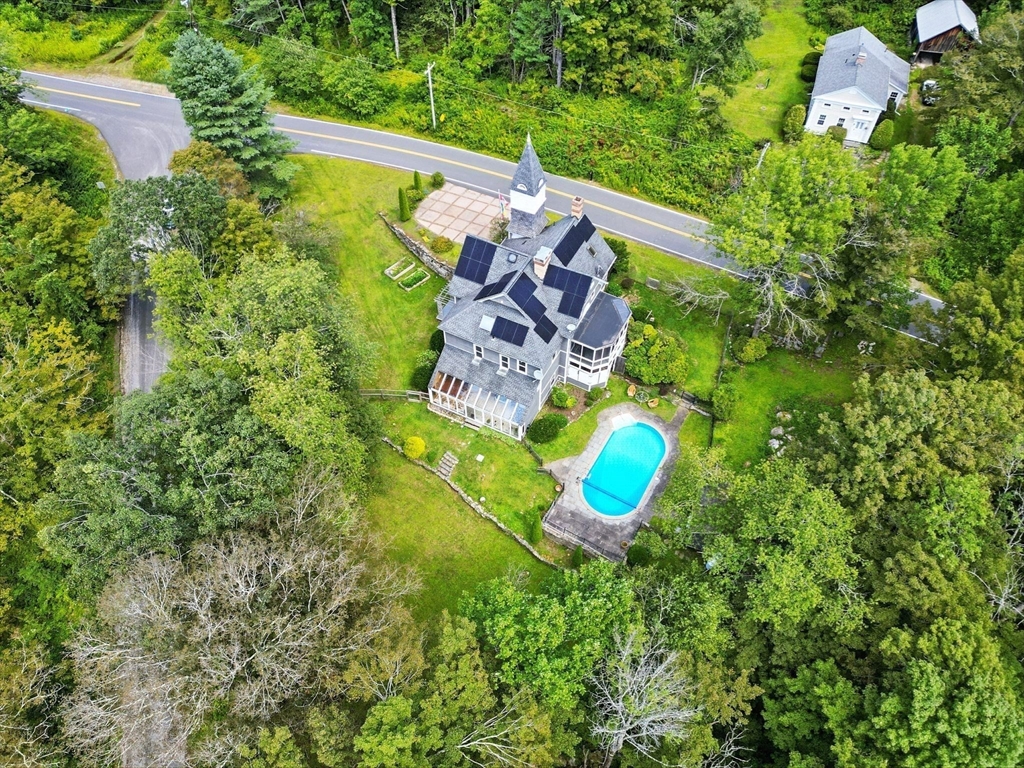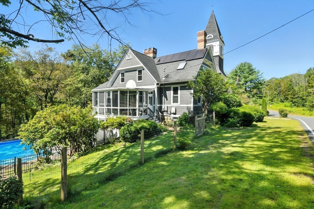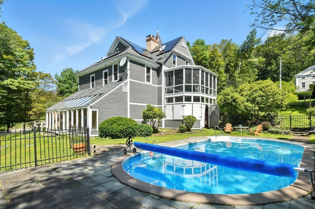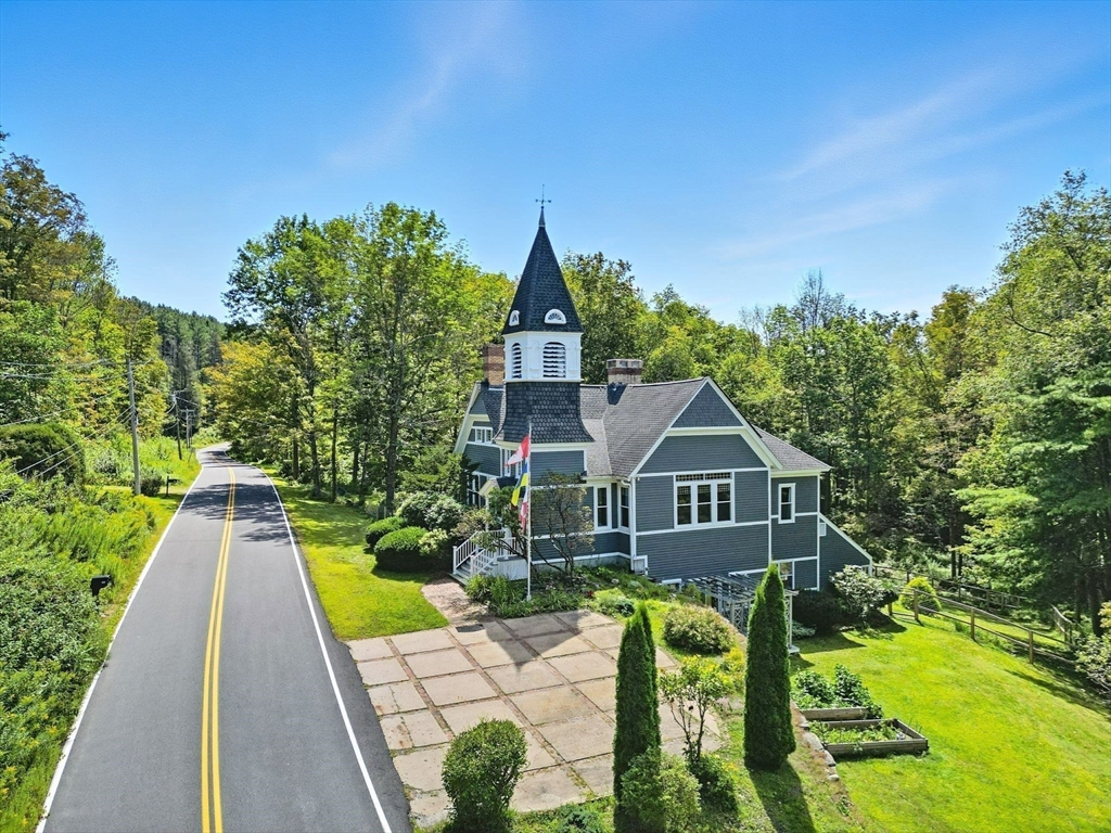 Step inside this stunning transformation of a historic church into a one-of-a-kind 3-bed, 3-bath home blending character and comfort. The original steeple serves as a striking centerpiece, cathedral ceilings, original stained-glass windows, and local fieldstone fireplaces on all three levels add timeless charm. Enjoy an open floor plan, screened-in porch, and a sun-filled solarium with hot tub that opens to a fenced yard. Each floor features a private bedroom and full bath, offering ideal flexibility. The lower level includes a separate entrance, kitchenette, and living space—perfect for an in-law or guest suite. Outside, unwind by the heated in-ground pool in your private backyard retreat. Truly a unique opportunity to own a piece of history with modern luxury. See feature sheet and improvement sheet attached.