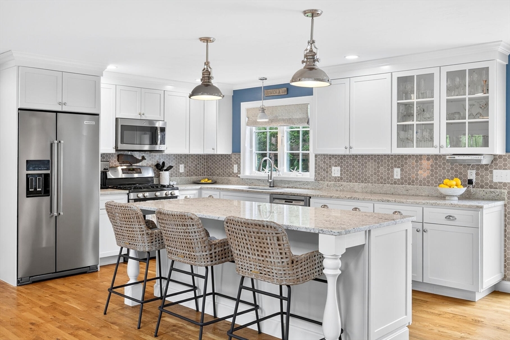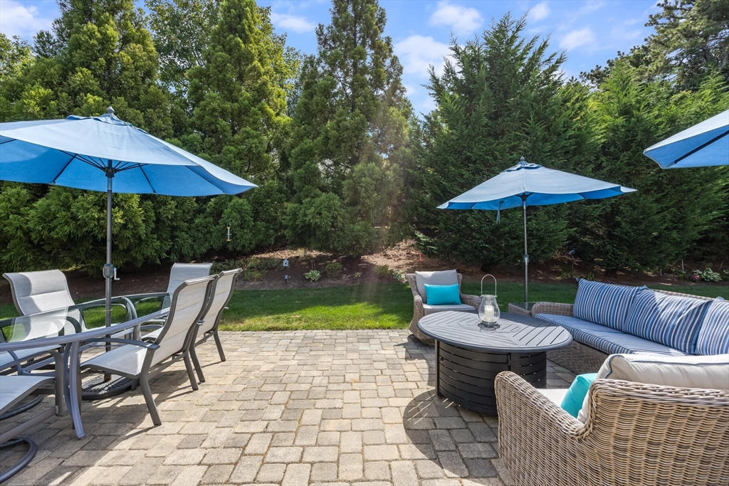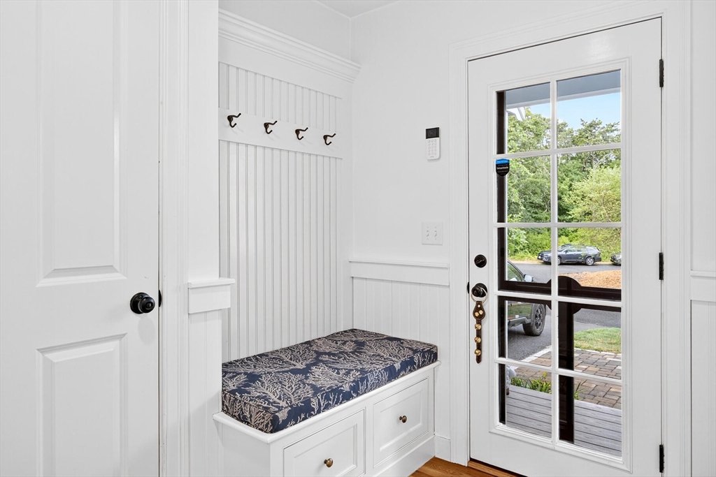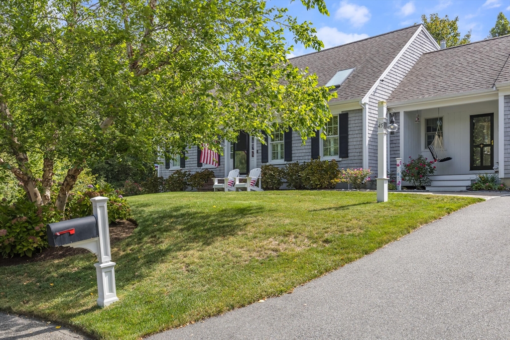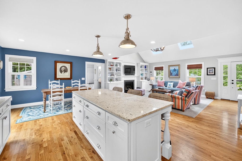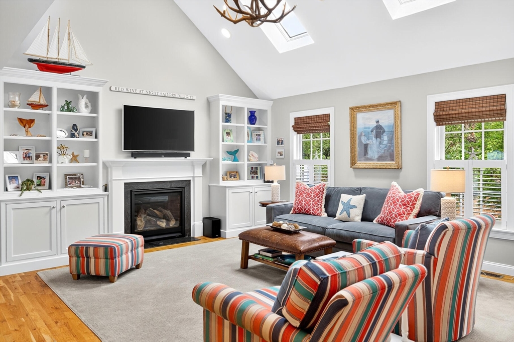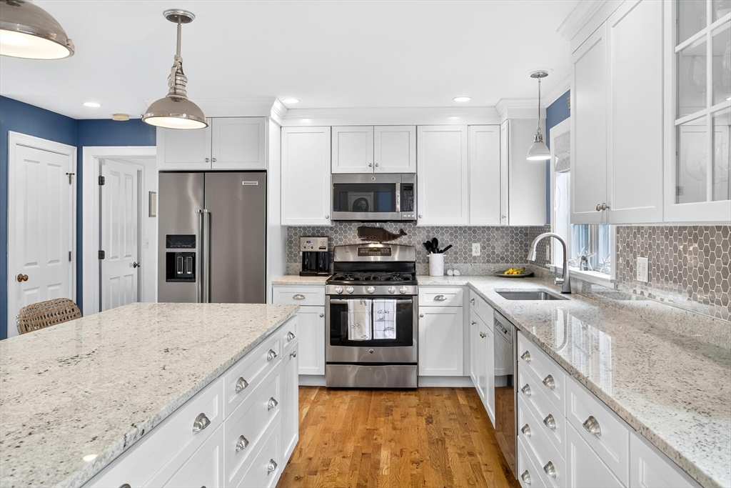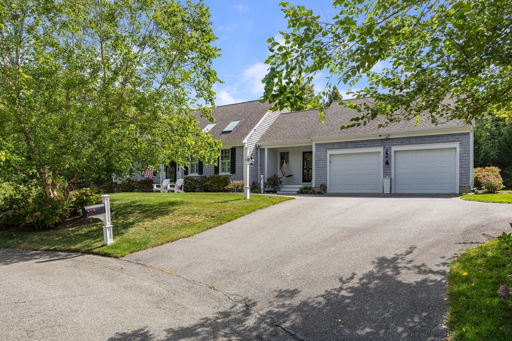 Beautiful Eastward-Built home nestled on a quiet cul-de-sac just 1 mi. to beach. This exceptional home features a thoughtfully designed open-concept floor plan perfect for modern living and entertaining. The expansive great room impresses with its cathedral ceiling, gas fp, custom built-ins, and rich wood flooring that seamlessly flows into the stunning gourmet kitchen with a large center island, custom crafted cabinetry, granite countertops and upscale appliances.The adjacent dining area opens to a private patio, perfect for outdoor entertaining and overlooks a meticulously landscaped yard with lush perennial gardens. The gracious first-floor primary suite offers a peaceful retreat with a large walk-in closet and private en suite bath. Additional highlights include a versatile home office, a mudroom off the two-car garage and laundry room offering convenient one-level living.