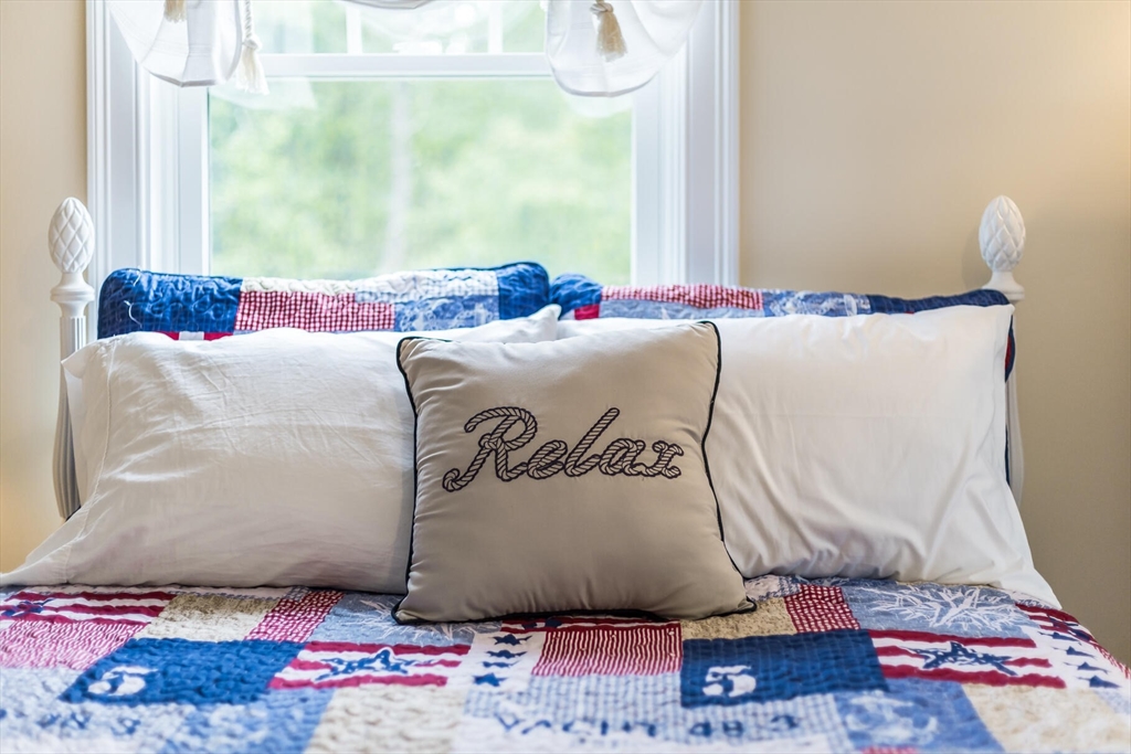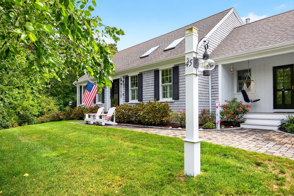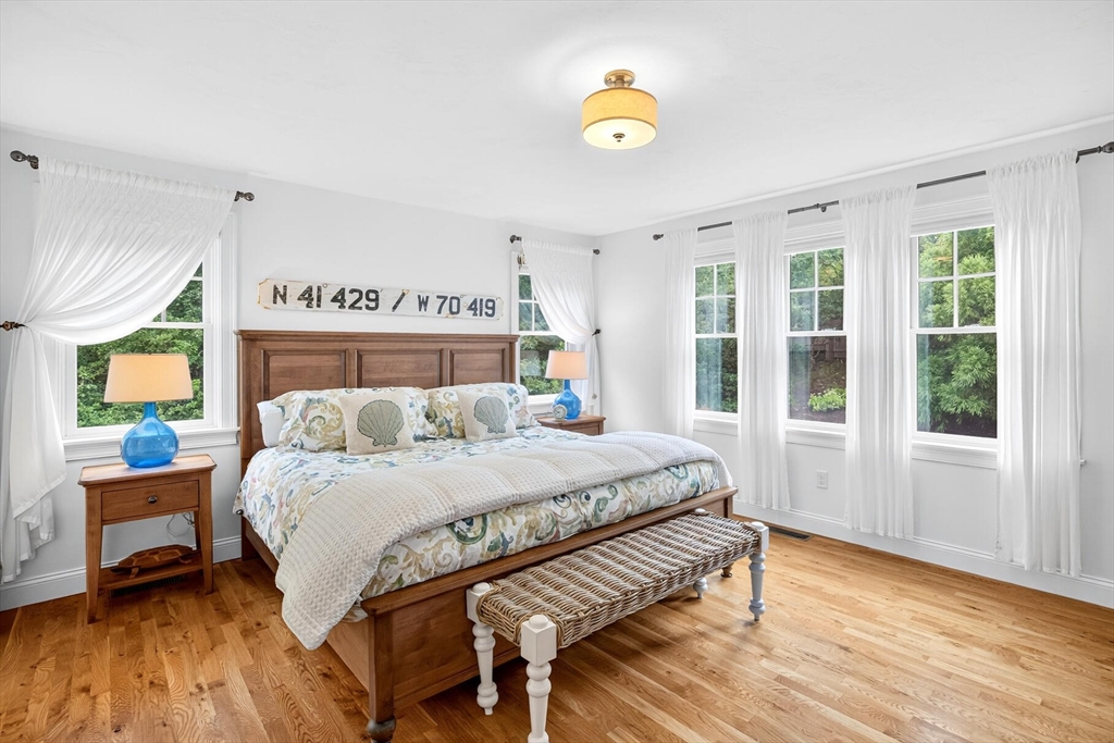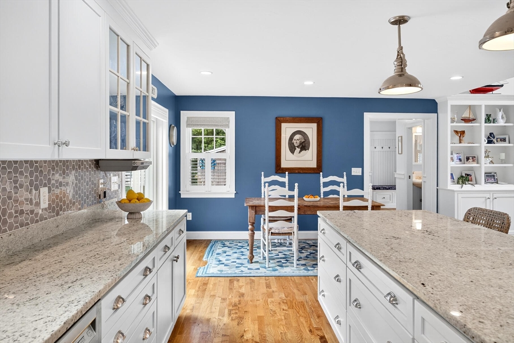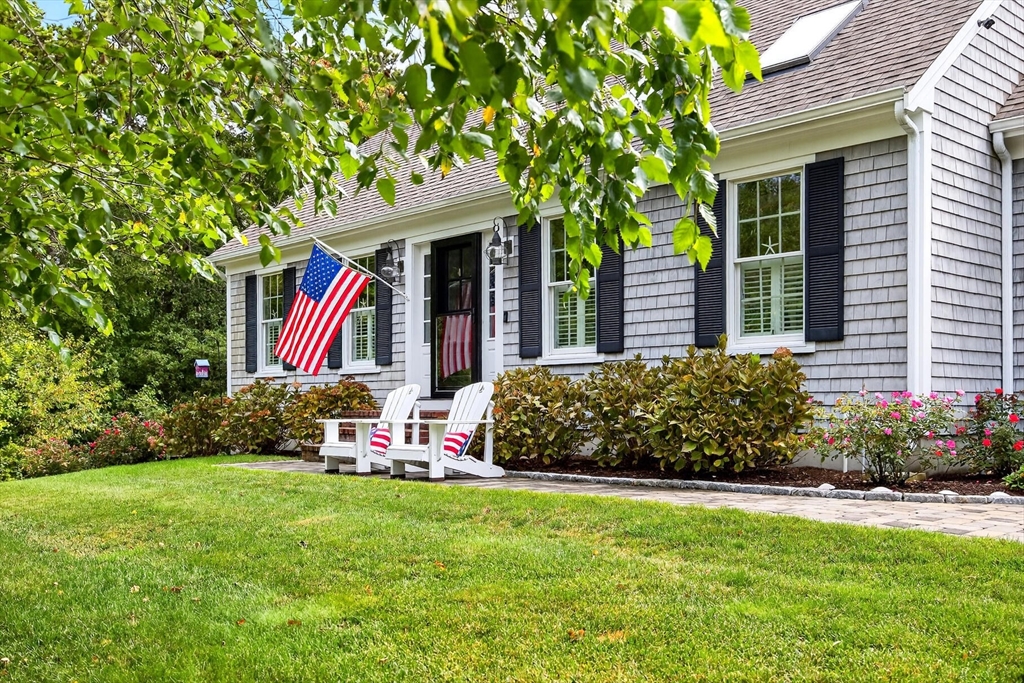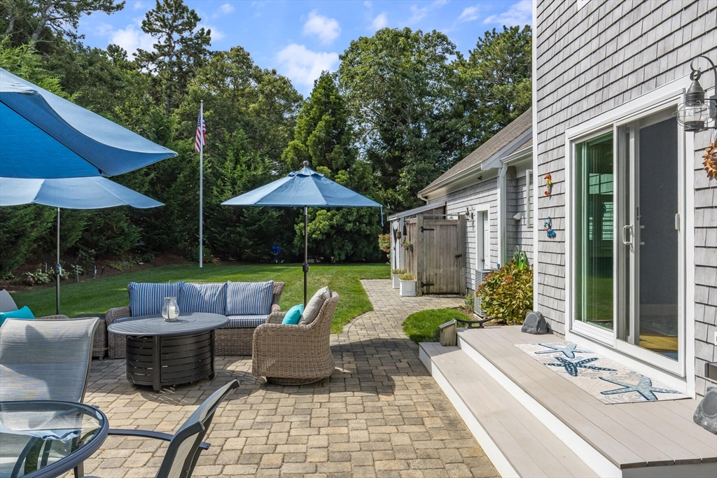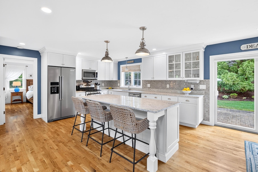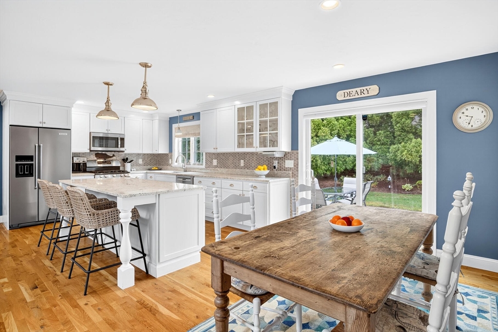 Beautiful Eastward-Built home nestled on a quiet cul-de-sac just 1 mi. to beach. This exceptional home features a thoughtfully designed open-concept floor plan perfect for modern living and entertaining. The expansive great room impresses with its cathedral ceiling, gas fp, custom built-ins, and rich wood flooring that seamlessly flows into the stunning gourmet kitchen with a large center island, custom crafted cabinetry, granite countertops and upscale appliances.The adjacent dining area opens to a private patio, perfect for outdoor entertaining and overlooks a meticulously landscaped yard with lush perennial gardens. The gracious first-floor primary suite offers a peaceful retreat with a large walk-in closet and private en suite bath. Additional highlights include a versatile home office, a mudroom off the two-car garage and laundry room offering convenient one-level living.