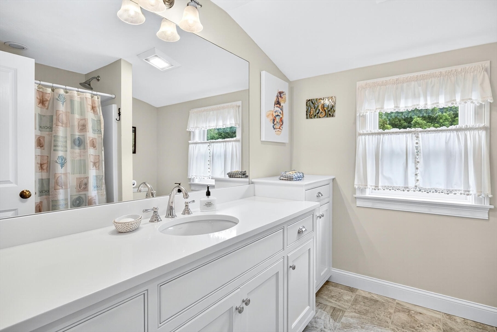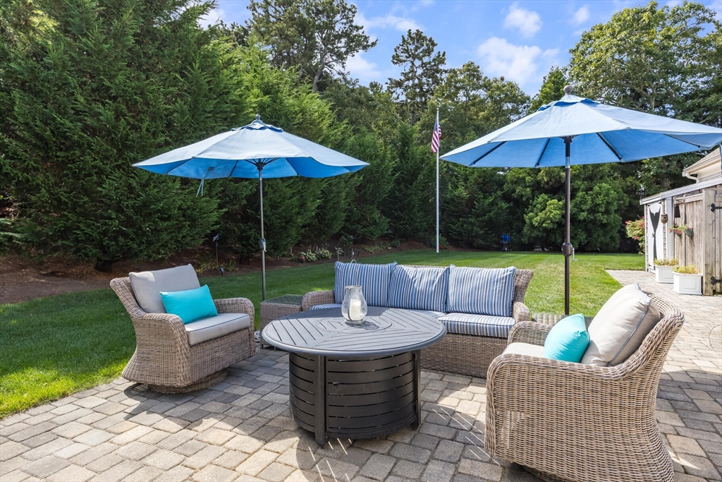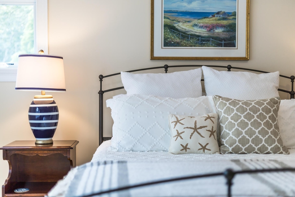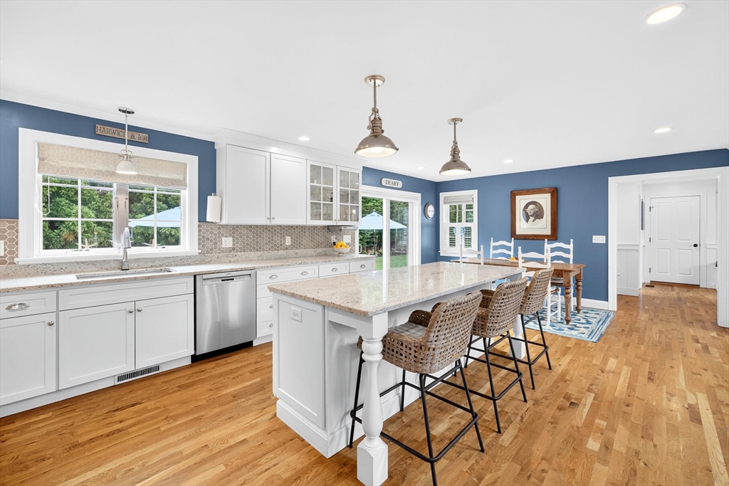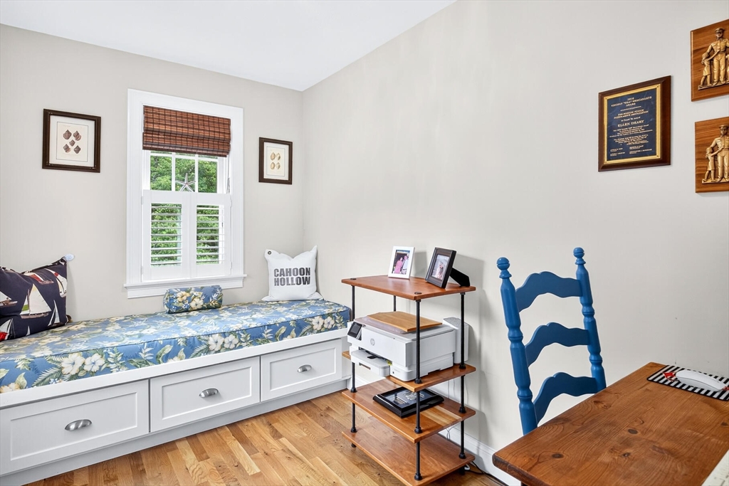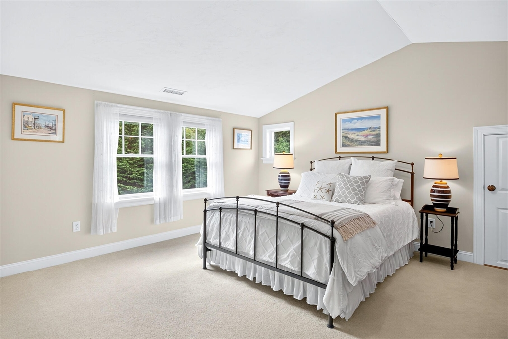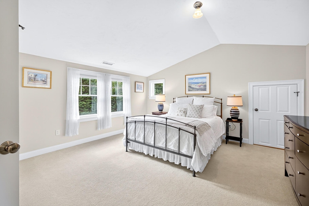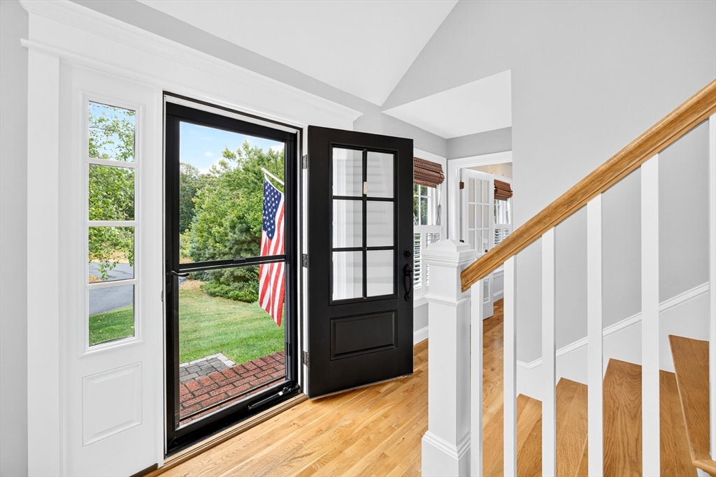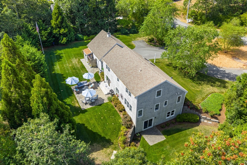 Beautiful Eastward-Built home nestled on a quiet cul-de-sac just 1 mi. to beach. This exceptional home features a thoughtfully designed open-concept floor plan perfect for modern living and entertaining. The expansive great room impresses with its cathedral ceiling, gas fp, custom built-ins, and rich wood flooring that seamlessly flows into the stunning gourmet kitchen with a large center island, custom crafted cabinetry, granite countertops and upscale appliances.The adjacent dining area opens to a private patio, perfect for outdoor entertaining and overlooks a meticulously landscaped yard with lush perennial gardens. The gracious first-floor primary suite offers a peaceful retreat with a large walk-in closet and private en suite bath. Additional highlights include a versatile home office, a mudroom off the two-car garage and laundry room offering convenient one-level living.