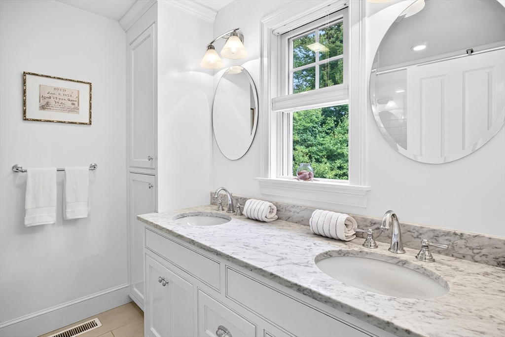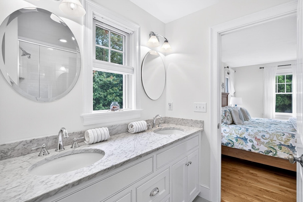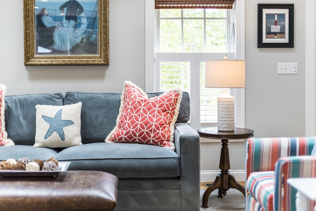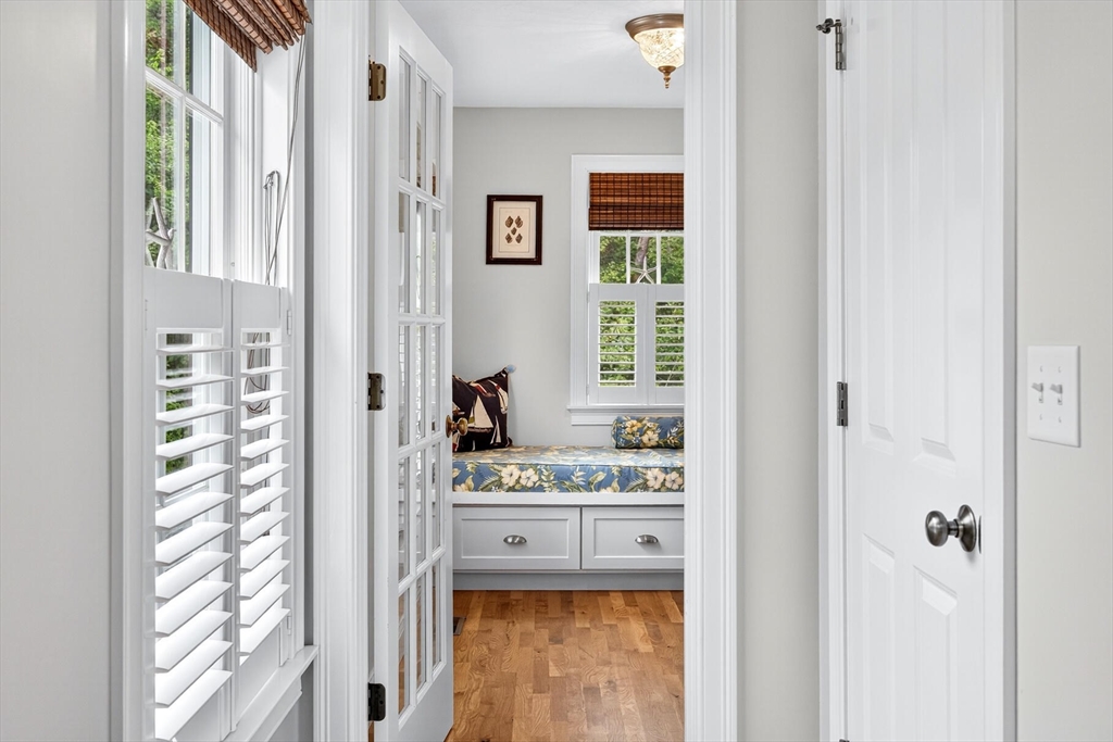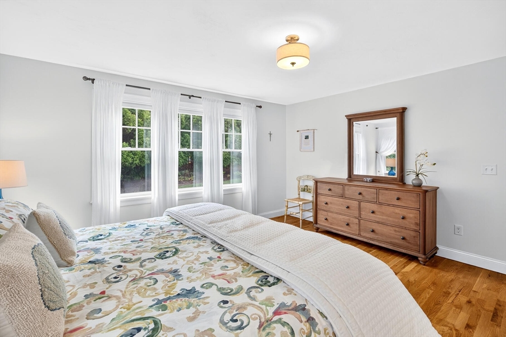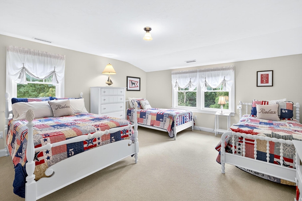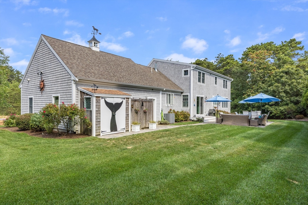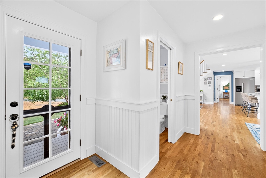 Beautiful Eastward-Built home nestled on a quiet cul-de-sac just 1 mi. to beach. This exceptional home features a thoughtfully designed open-concept floor plan perfect for modern living and entertaining. The expansive great room impresses with its cathedral ceiling, gas fp, custom built-ins, and rich wood flooring that seamlessly flows into the stunning gourmet kitchen with a large center island, custom crafted cabinetry, granite countertops and upscale appliances.The adjacent dining area opens to a private patio, perfect for outdoor entertaining and overlooks a meticulously landscaped yard with lush perennial gardens. The gracious first-floor primary suite offers a peaceful retreat with a large walk-in closet and private en suite bath. Additional highlights include a versatile home office, a mudroom off the two-car garage and laundry room offering convenient one-level living.