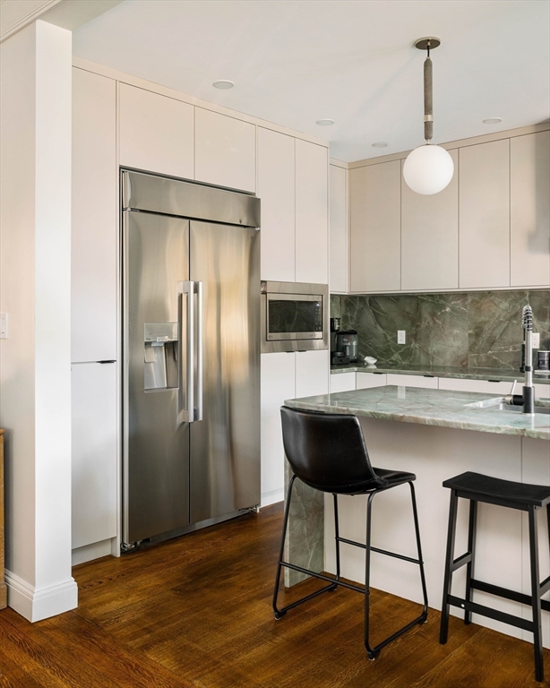 Set in a beautifully restored Victorian home just off Coolidge Corner, this 1,869 SF condo combines historic charm with modern updates. High ceilings, original millwork, and hardwood floors anchor gracious living and dining rooms with two fireplaces. A complete gut renovation in 2024 introduced high-end finishes, a powder room, central HVAC, and a walk-in closet to the primary suite. The chef’s kitchen features Italian Quartzite countertops, custom cabinetry, and all new appliances. A versatile bonus room offers the perfect space for a home office, den, or guest area—just a closet away from serving as a third bedroom. The fully fenced patio is exclusive to this unit, while the basement includes a partially finished studio with ducted heating/cooling and a separate storage room. With two parking spaces, in-unit laundry, and a prime location near shops, dining, and the Green Line, this home offers a rare blend of character, comfort, and flexibility.