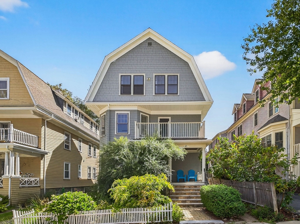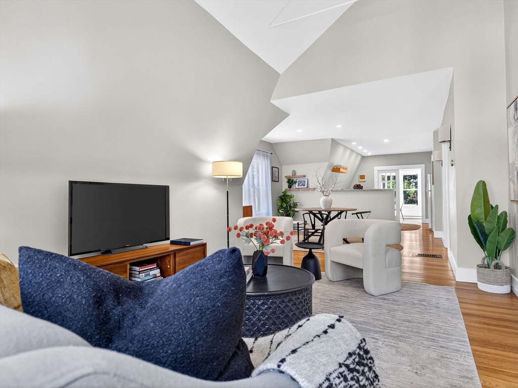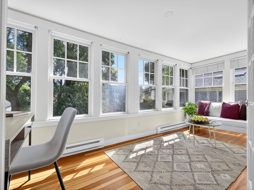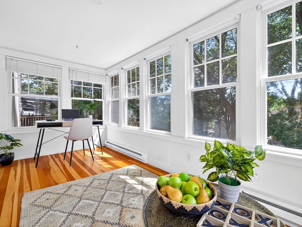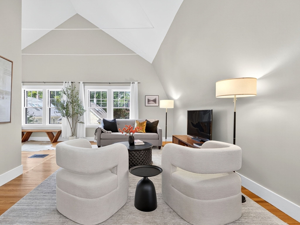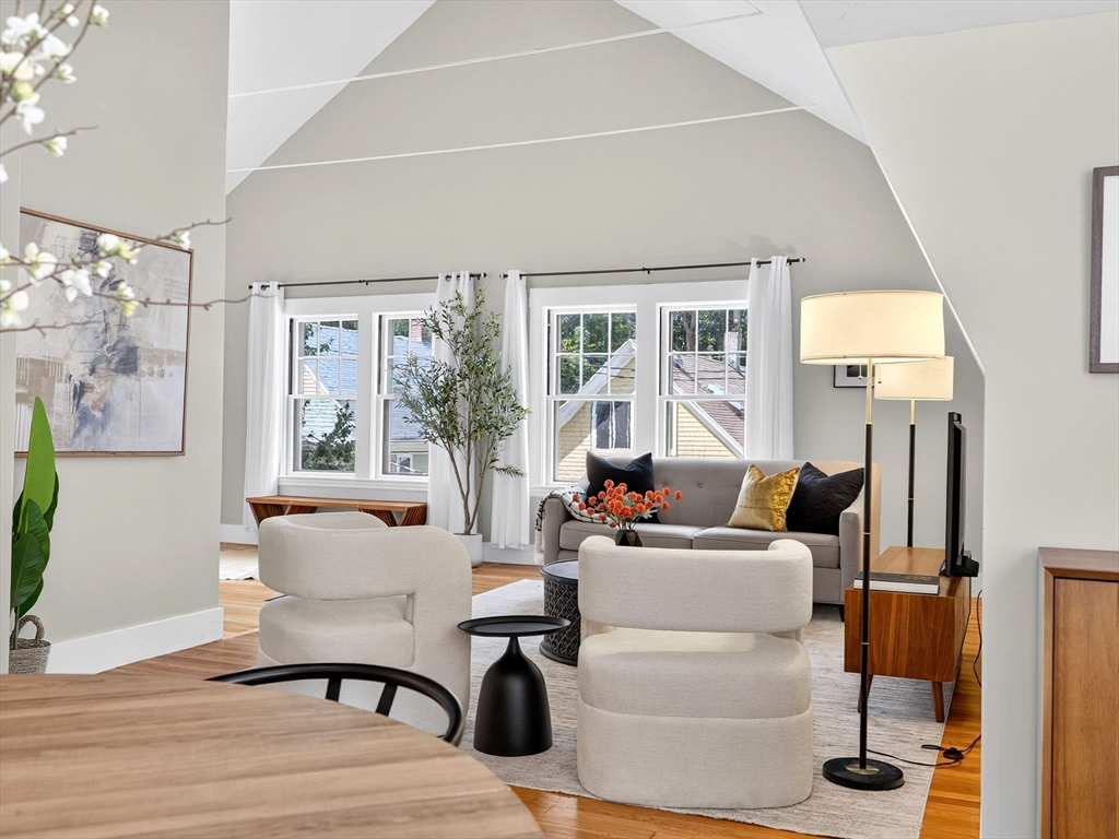 This bright penthouse, a true gem in a classic Gambrel-three family home, boasts an open-concept living and dining area that feels expansive due to cathedral ceilings and abundant natural light. The updated kitchen and bath feature modern tile, granite counters, & French Doors. Two bedrooms, separated by the full bath, offer ample closet space. Enjoy wood flooring, wide moldings, and a spacious south-facing sunroom overlooking a shared yard. Parking, Air Conditioning, and storage in an exclusive use attic space in addition to the basement are included. The vibrant location provides easy access to public transit, the Emerald Necklace Parks, and Jamaica Plain center. Welcome home to your urban oasis!
