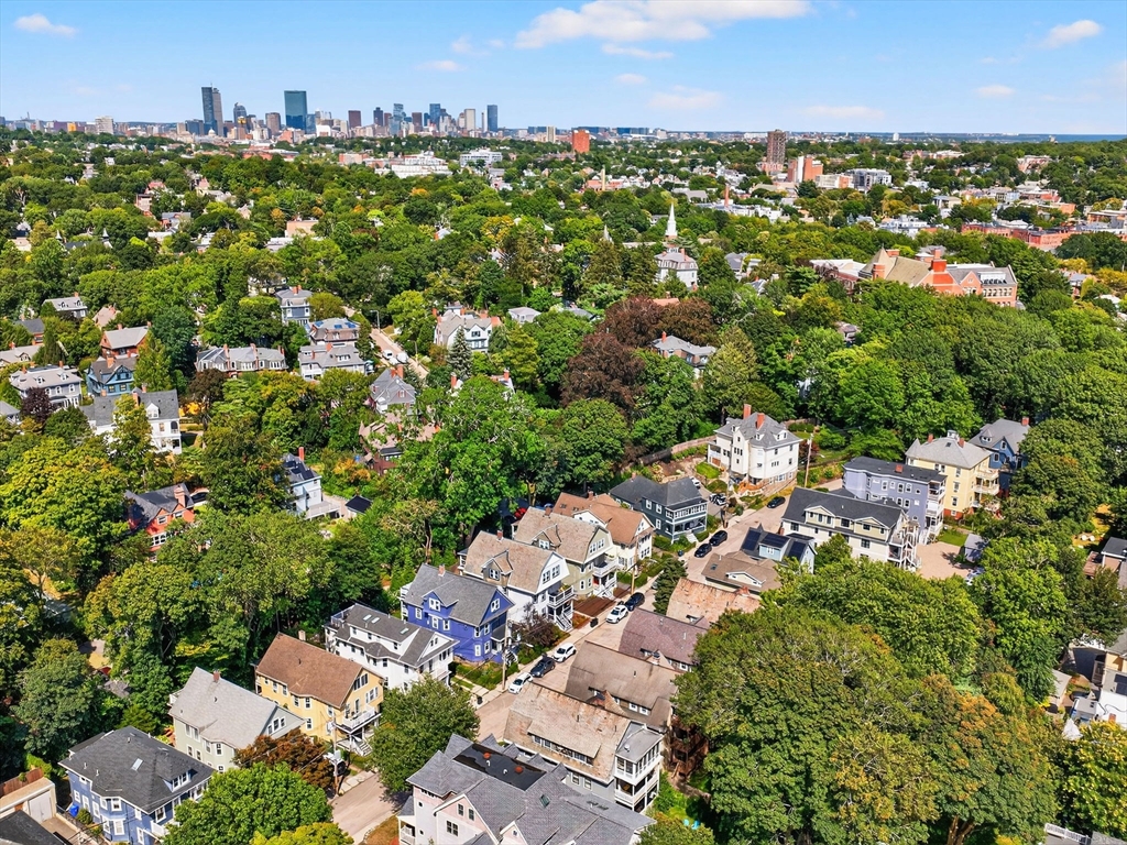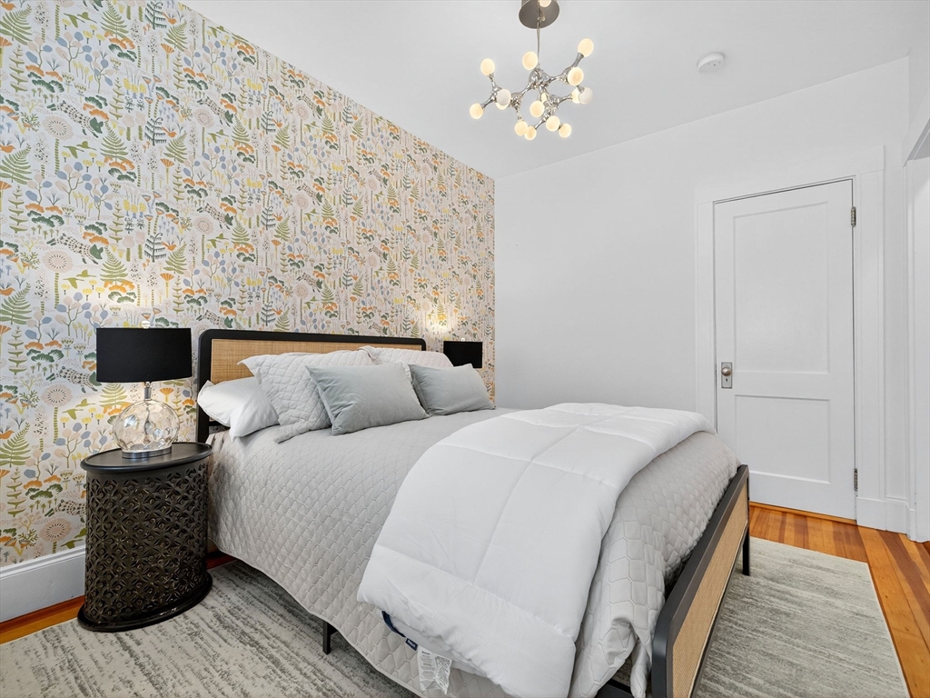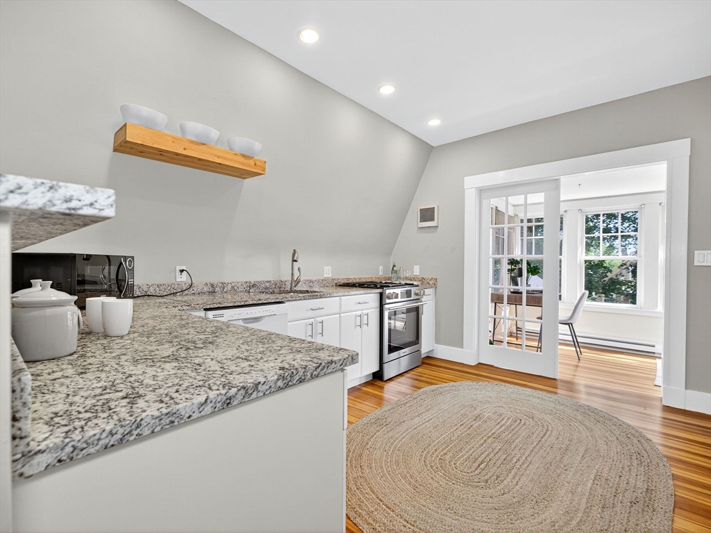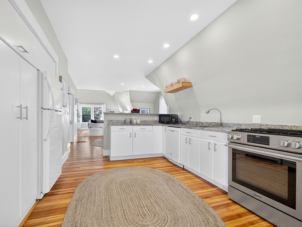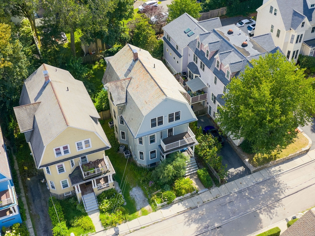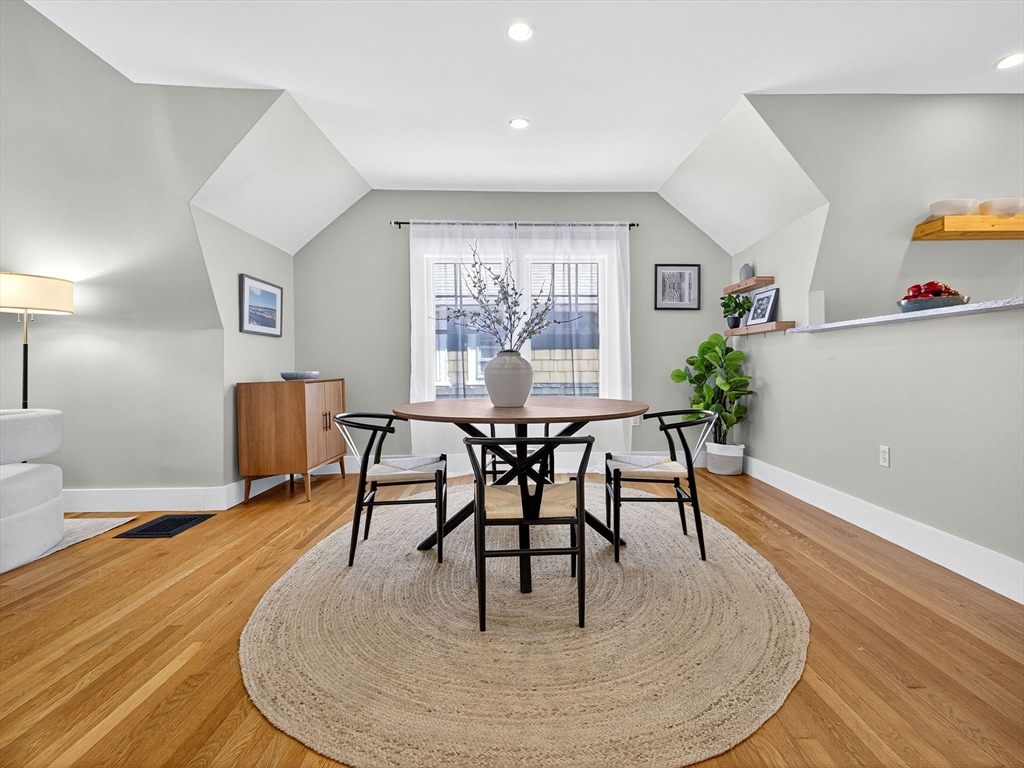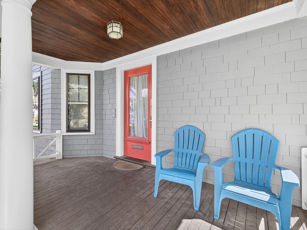 This bright penthouse, a true gem in a classic Gambrel-three family home, boasts an open-concept living and dining area that feels expansive due to cathedral ceilings and abundant natural light. The updated kitchen and bath feature modern tile, granite counters, & French Doors. Two bedrooms, separated by the full bath, offer ample closet space. Enjoy wood flooring, wide moldings, and a spacious south-facing sunroom overlooking a shared yard. Parking, Air Conditioning, and storage in an exclusive use attic space in addition to the basement are included. The vibrant location provides easy access to public transit, the Emerald Necklace Parks, and Jamaica Plain center. Welcome home to your urban oasis!