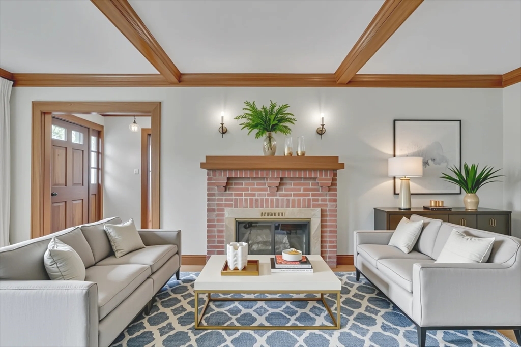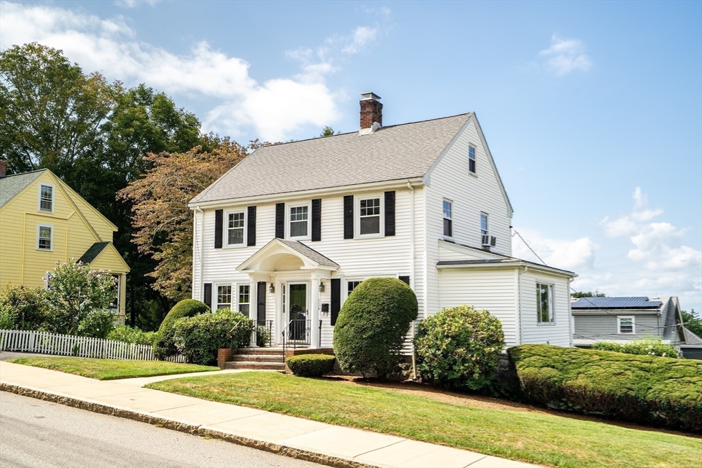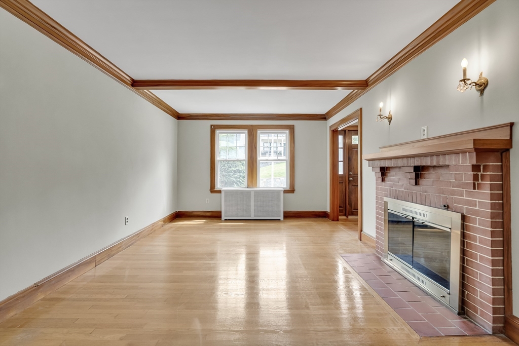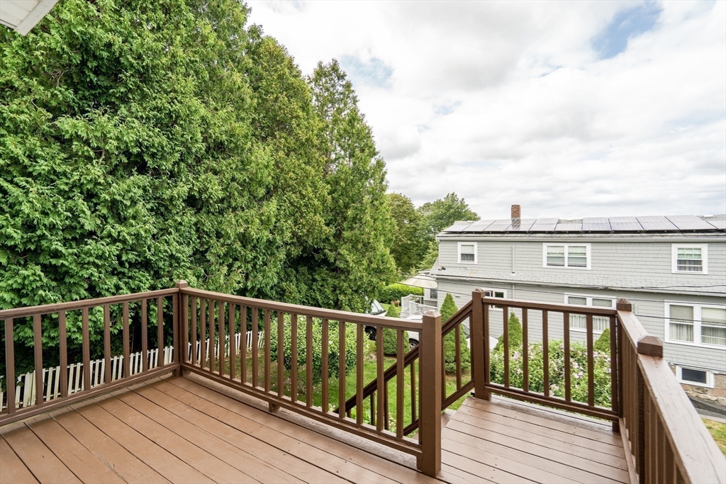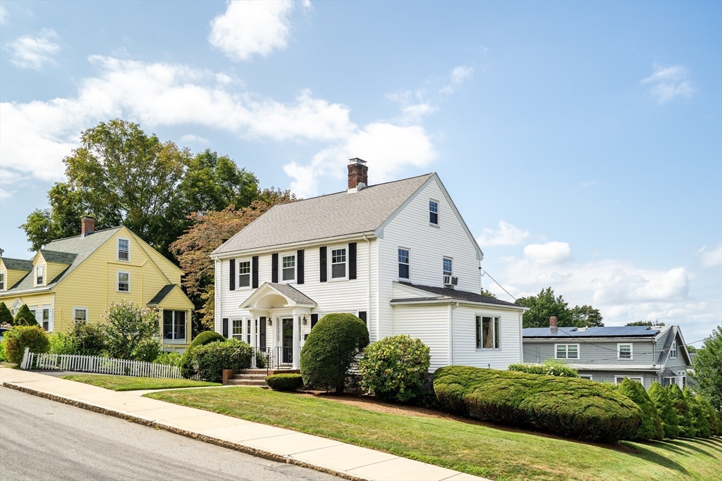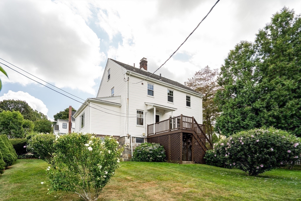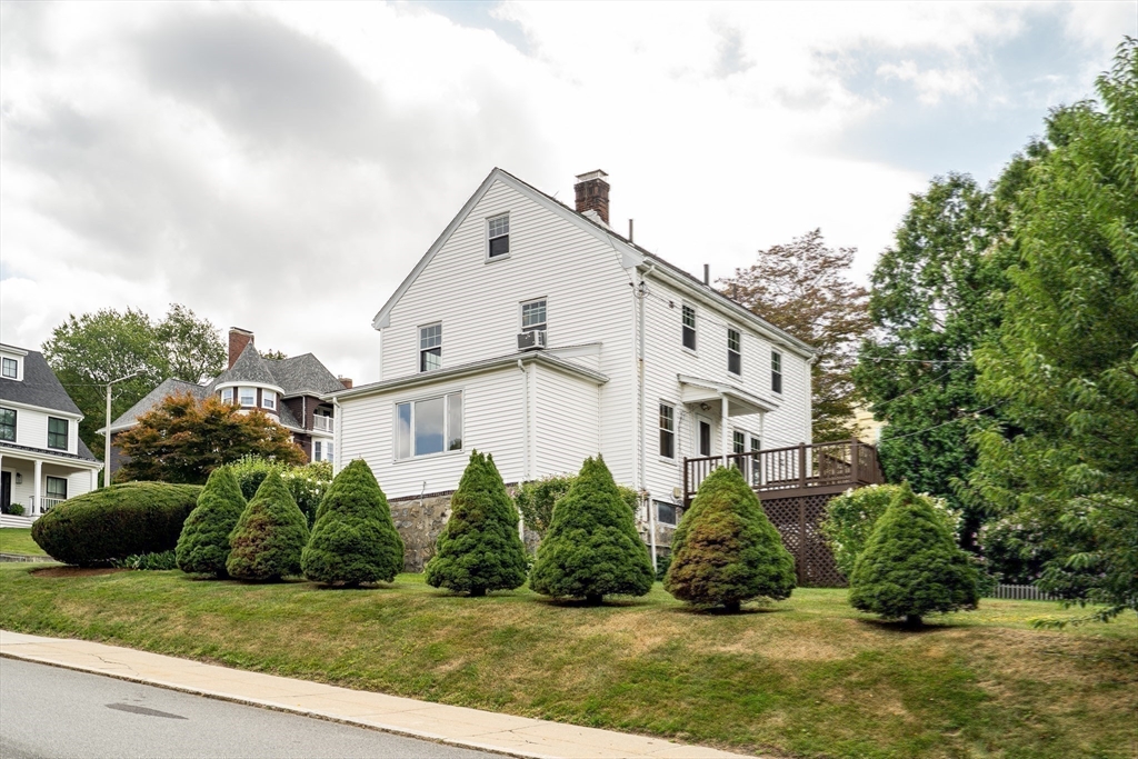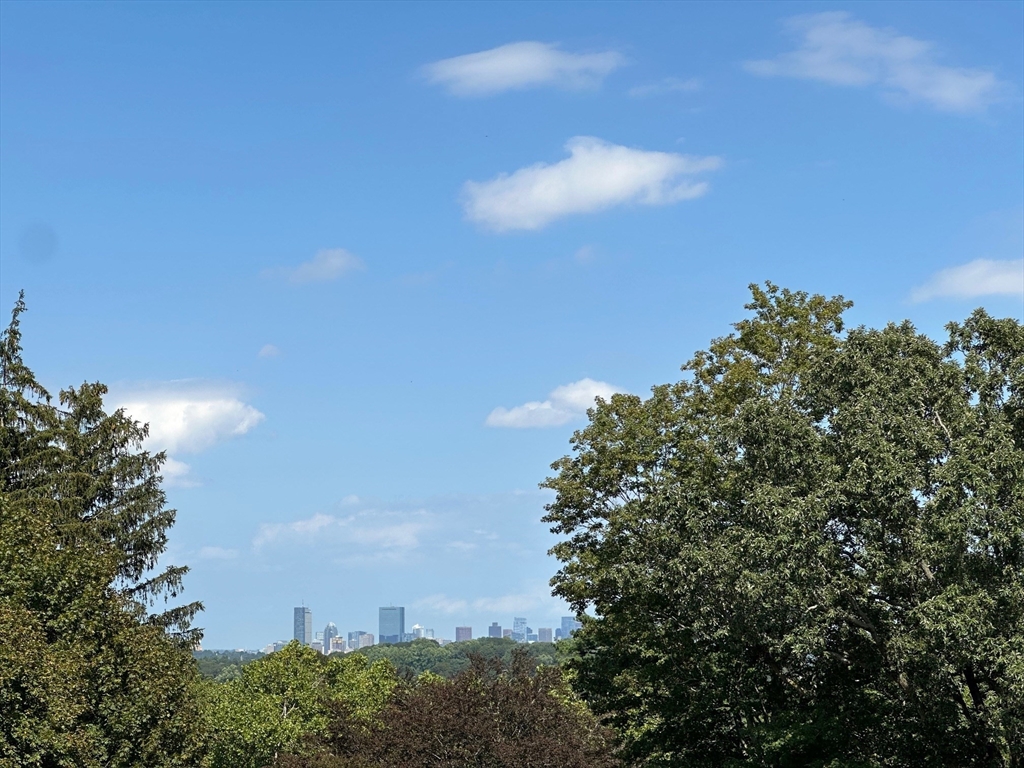Beautiful center-entrance Colonial on desirable corner lot in prime Bellevue Hill location. Spacious living room features beamed ceiling, crown molding, and classic wood-burning brick fireplace. Formal dining room showcases custom built-in hutch, crown molding, and chair rail. Large eat-in kitchen opens to deck overlooking professionally landscaped grounds with mature plantings. First level also offers bonus family room with large picture window, foyer with coat closet, and tiled half bath. Second level offers three bedrooms, tiled full bath, linen closet, and views of the Boston skyline. Gleaming hardwood floors flow throughout. Full walk-up attic with heat offers excellent expansion potential. An elegant entry portico, decorative shutters, wrought-iron railings, and bluestone and brick steps enhance this home's curb appeal. Just a short walk to the commuter rail station (0.3 miles) and to neighborhood shops and restaurants.