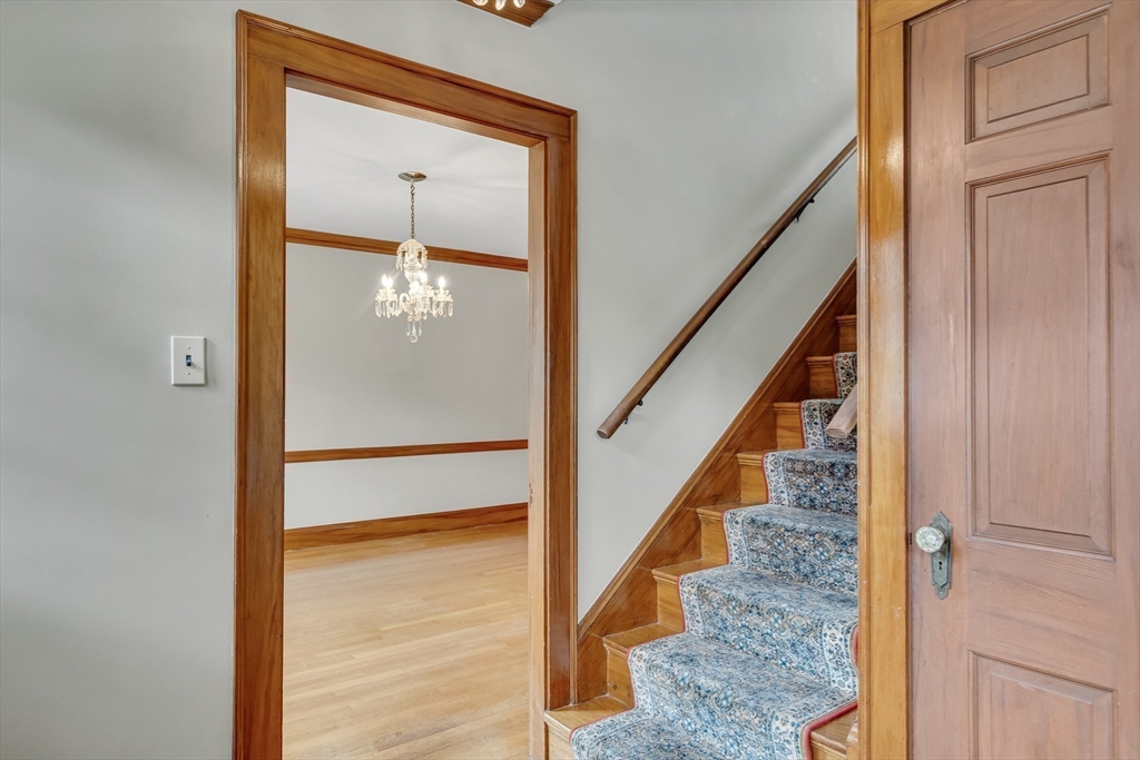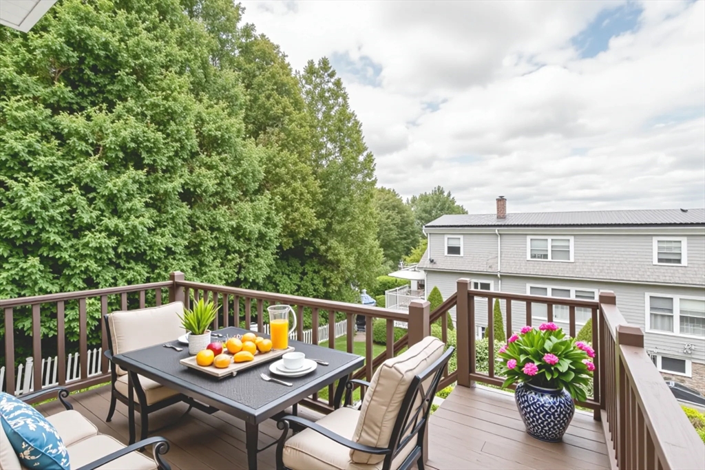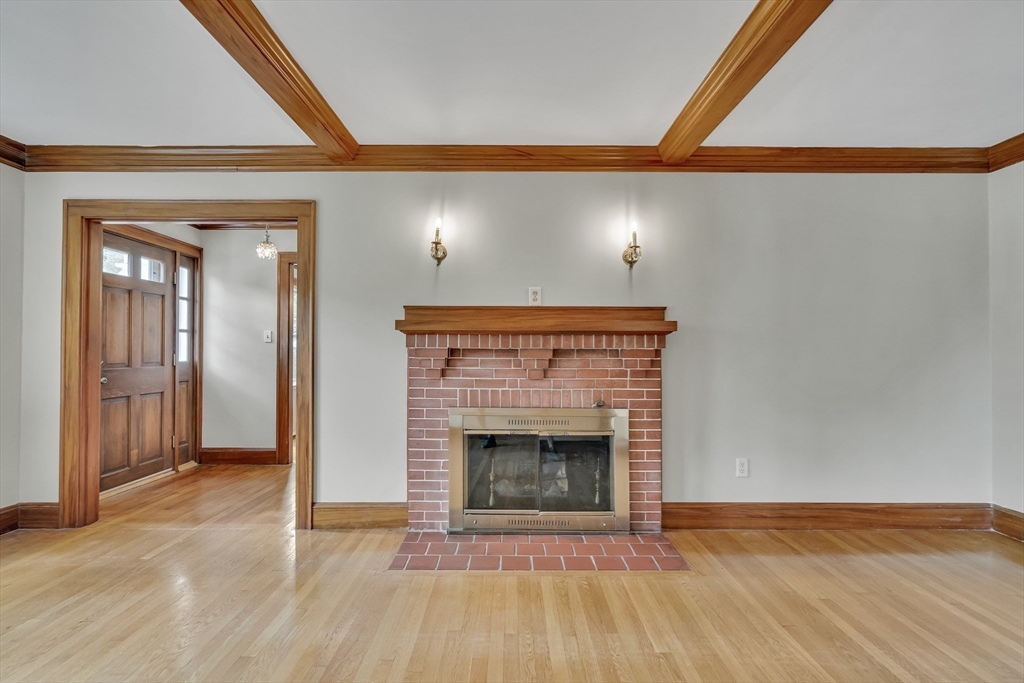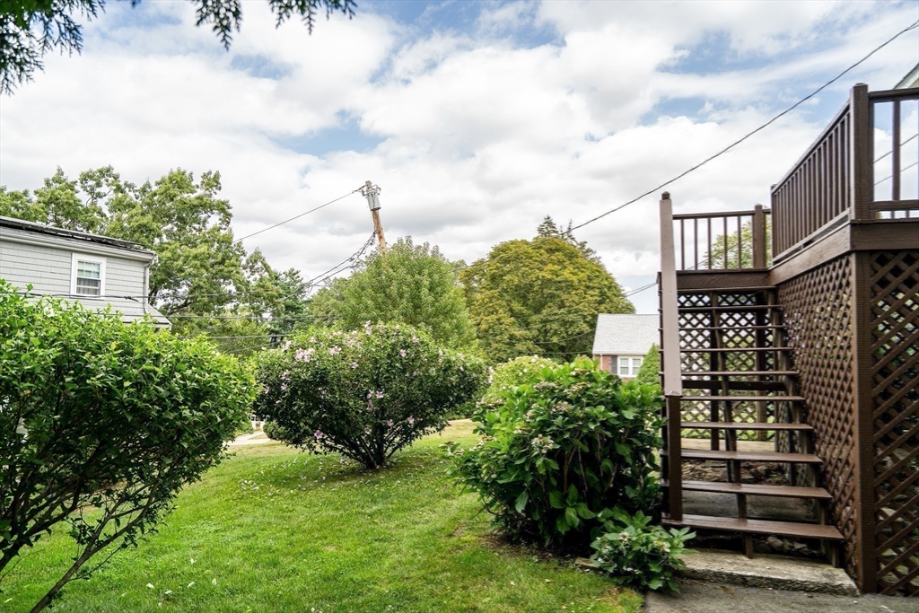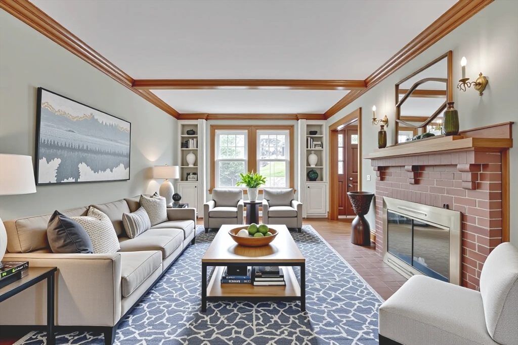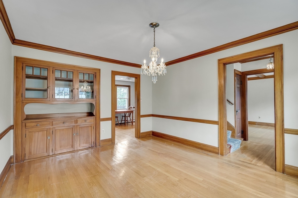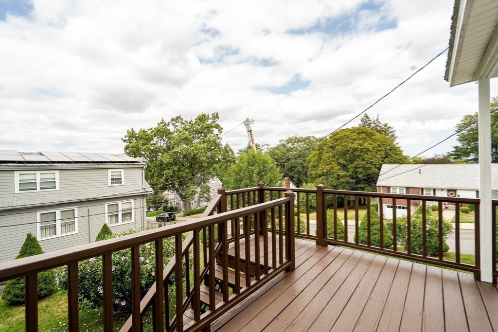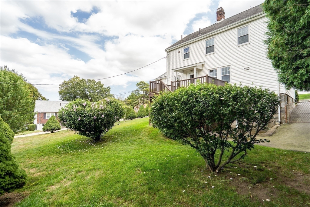 Beautiful center-entrance Colonial on desirable corner lot in prime Bellevue Hill location. Spacious living room features beamed ceiling, crown molding, and classic wood-burning brick fireplace. Formal dining room showcases custom built-in hutch, crown molding, and chair rail. Large eat-in kitchen opens to deck overlooking professionally landscaped grounds with mature plantings. First level also offers bonus family room with large picture window, foyer with coat closet, and tiled half bath. Second level offers three bedrooms, tiled full bath, linen closet, and views of the Boston skyline. Gleaming hardwood floors flow throughout. Full walk-up attic with heat offers excellent expansion potential. An elegant entry portico, decorative shutters, wrought-iron railings, and bluestone and brick steps enhance this home's curb appeal. Just a short walk to the commuter rail station (0.3 miles) and to neighborhood shops and restaurants.