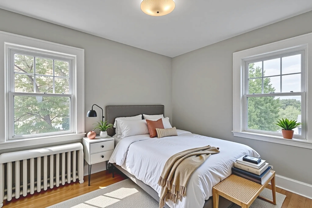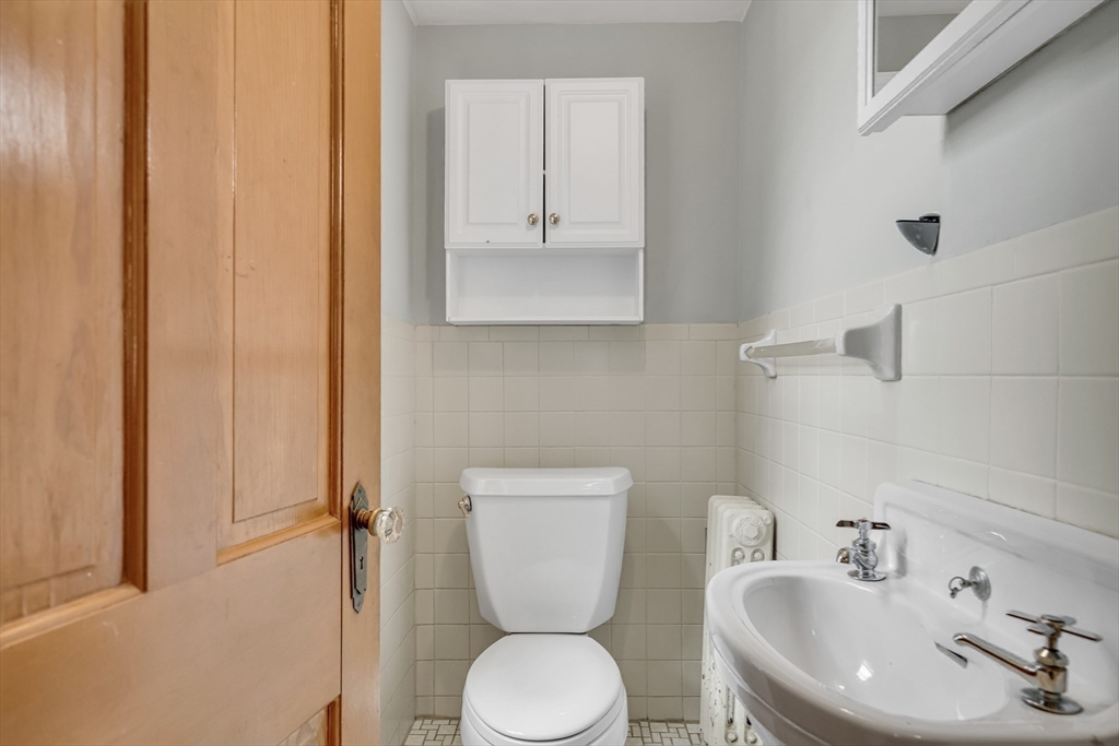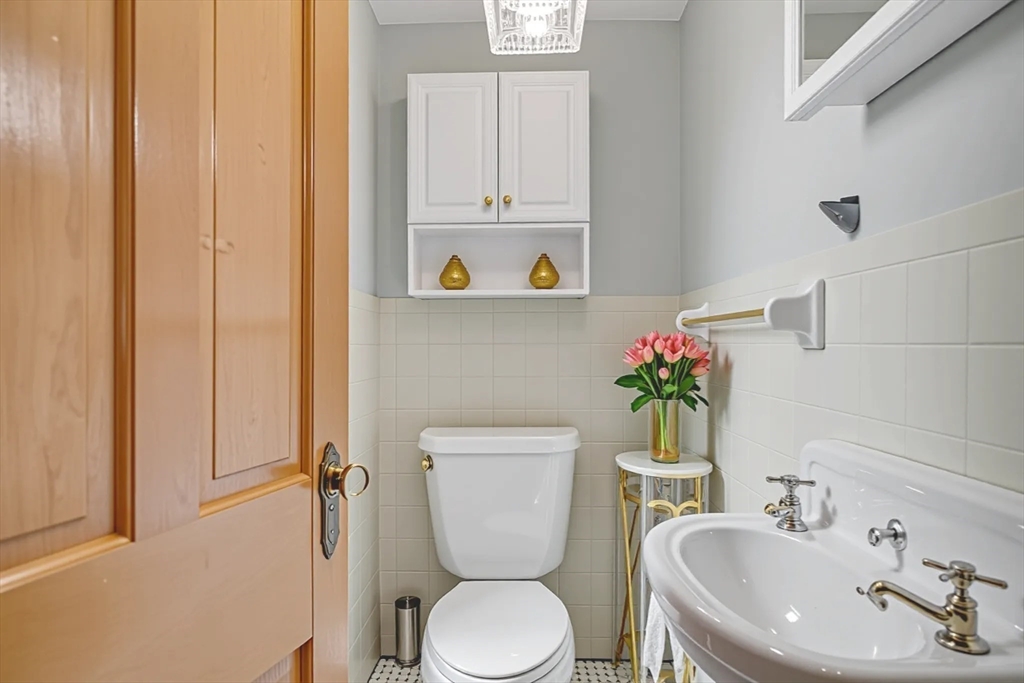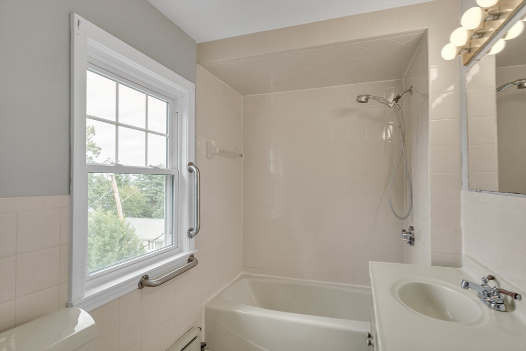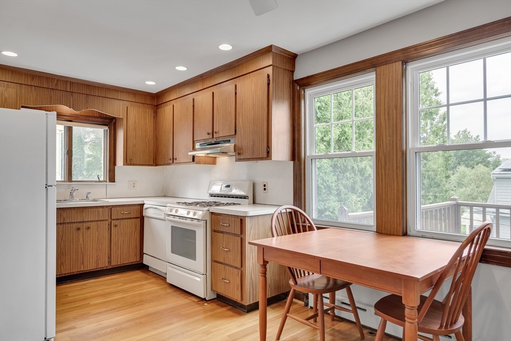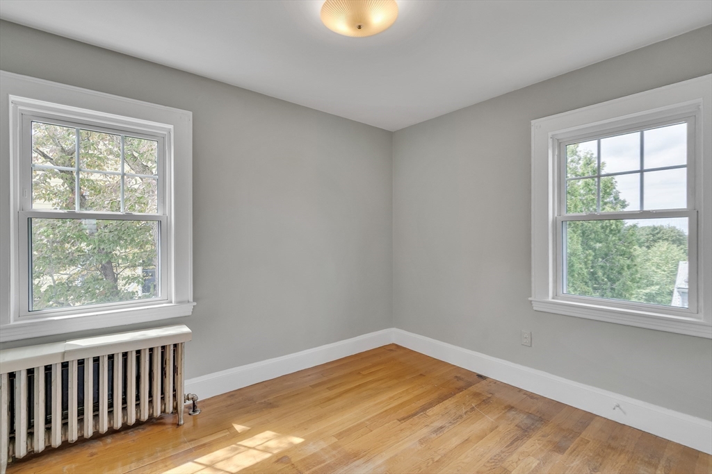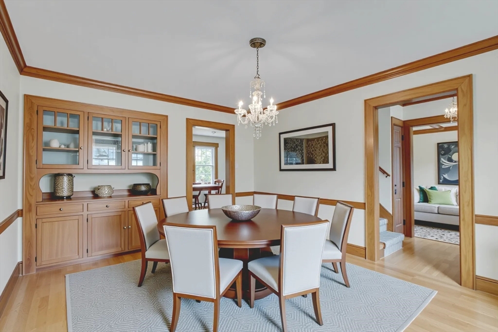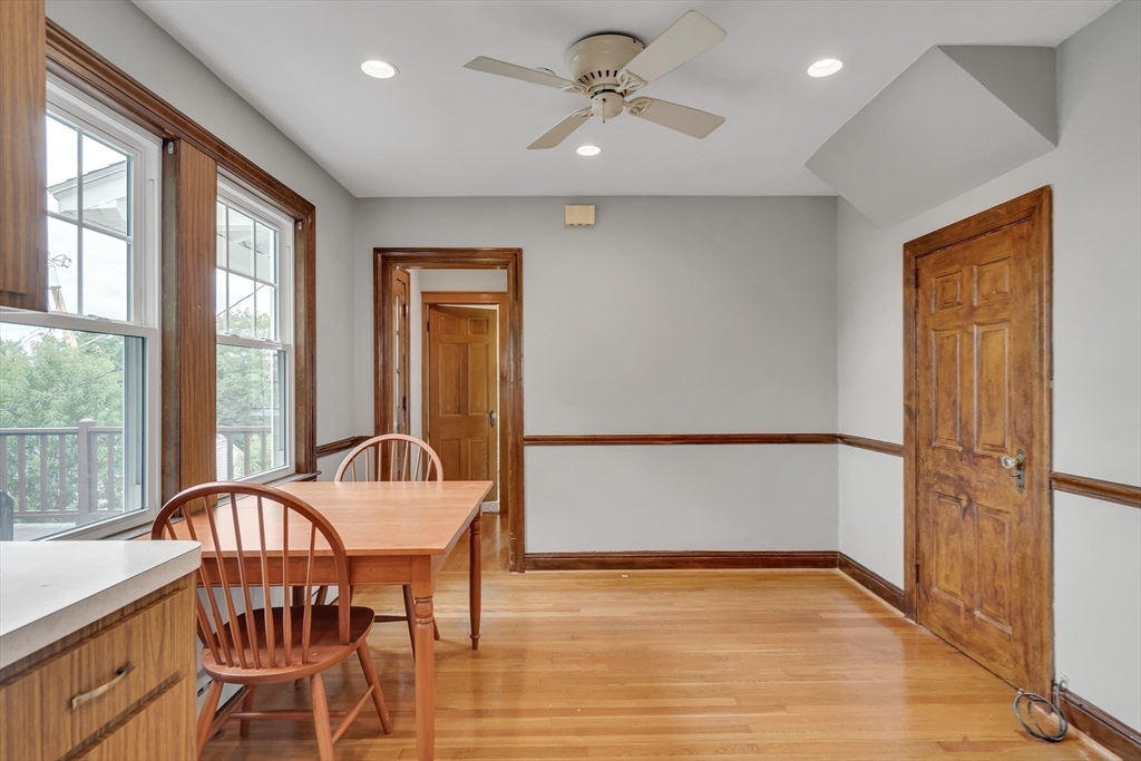 Beautiful center-entrance Colonial on desirable corner lot in prime Bellevue Hill location. Spacious living room features beamed ceiling, crown molding, and classic wood-burning brick fireplace. Formal dining room showcases custom built-in hutch, crown molding, and chair rail. Large eat-in kitchen opens to deck overlooking professionally landscaped grounds with mature plantings. First level also offers bonus family room with large picture window, foyer with coat closet, and tiled half bath. Second level offers three bedrooms, tiled full bath, linen closet, and views of the Boston skyline. Gleaming hardwood floors flow throughout. Full walk-up attic with heat offers excellent expansion potential. An elegant entry portico, decorative shutters, wrought-iron railings, and bluestone and brick steps enhance this home's curb appeal. Just a short walk to the commuter rail station (0.3 miles) and to neighborhood shops and restaurants.