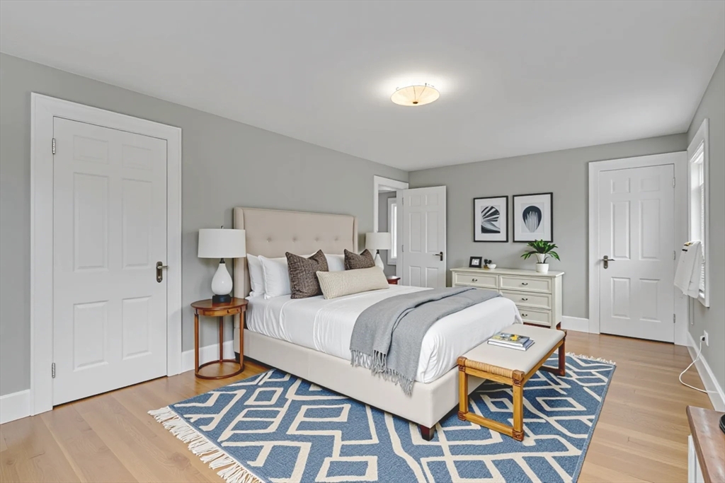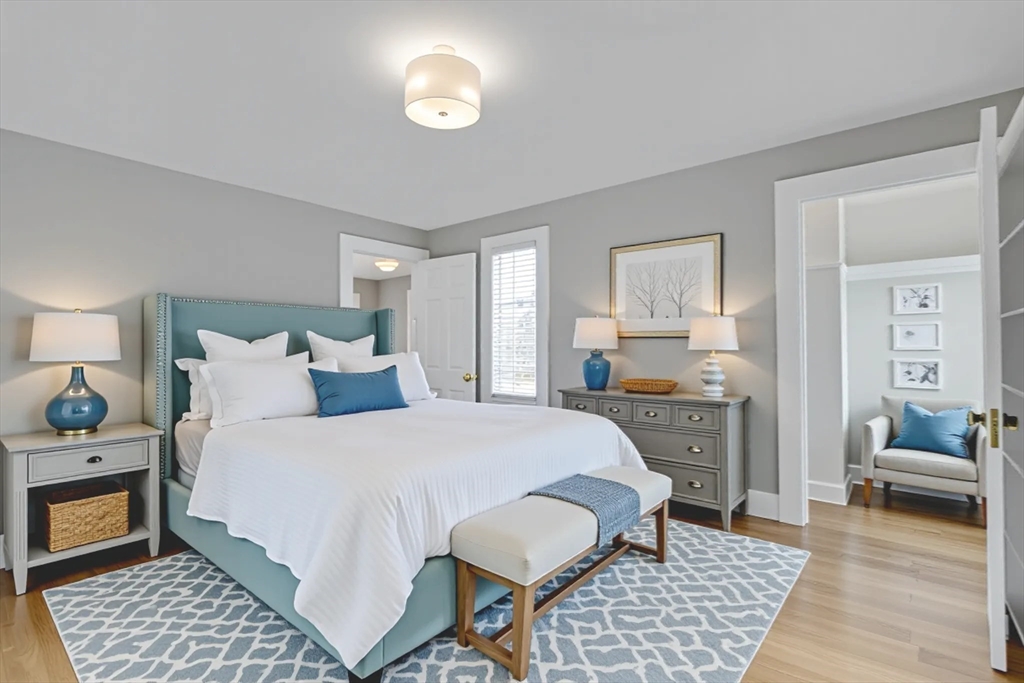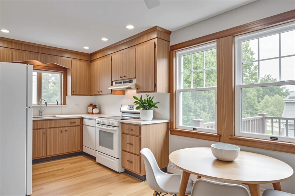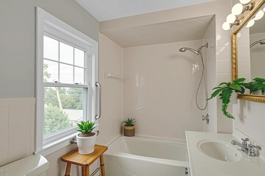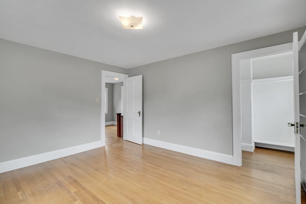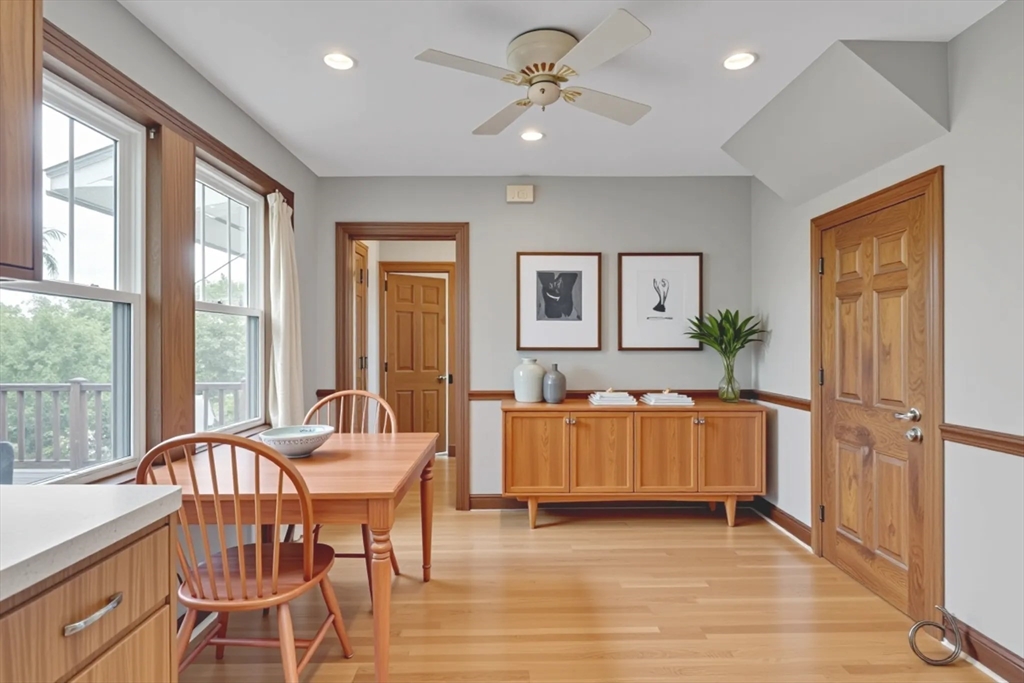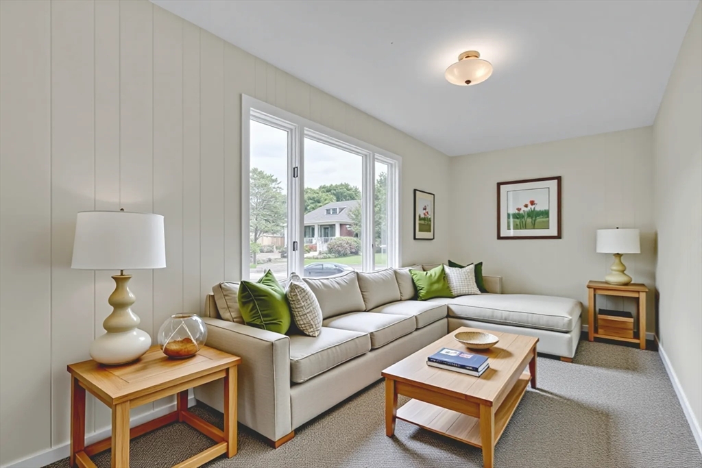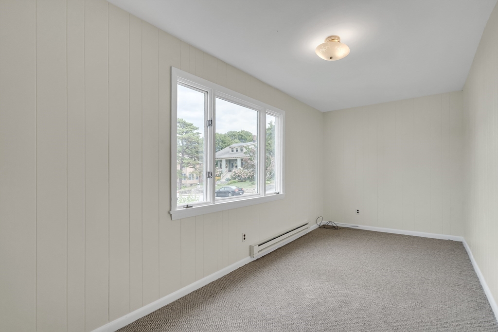 Beautiful center-entrance Colonial on desirable corner lot in prime Bellevue Hill location. Spacious living room features beamed ceiling, crown molding, and classic wood-burning brick fireplace. Formal dining room showcases custom built-in hutch, crown molding, and chair rail. Large eat-in kitchen opens to deck overlooking professionally landscaped grounds with mature plantings. First level also offers bonus family room with large picture window, foyer with coat closet, and tiled half bath. Second level offers three bedrooms, tiled full bath, linen closet, and views of the Boston skyline. Gleaming hardwood floors flow throughout. Full walk-up attic with heat offers excellent expansion potential. An elegant entry portico, decorative shutters, wrought-iron railings, and bluestone and brick steps enhance this home's curb appeal. Just a short walk to the commuter rail station (0.3 miles) and to neighborhood shops and restaurants.