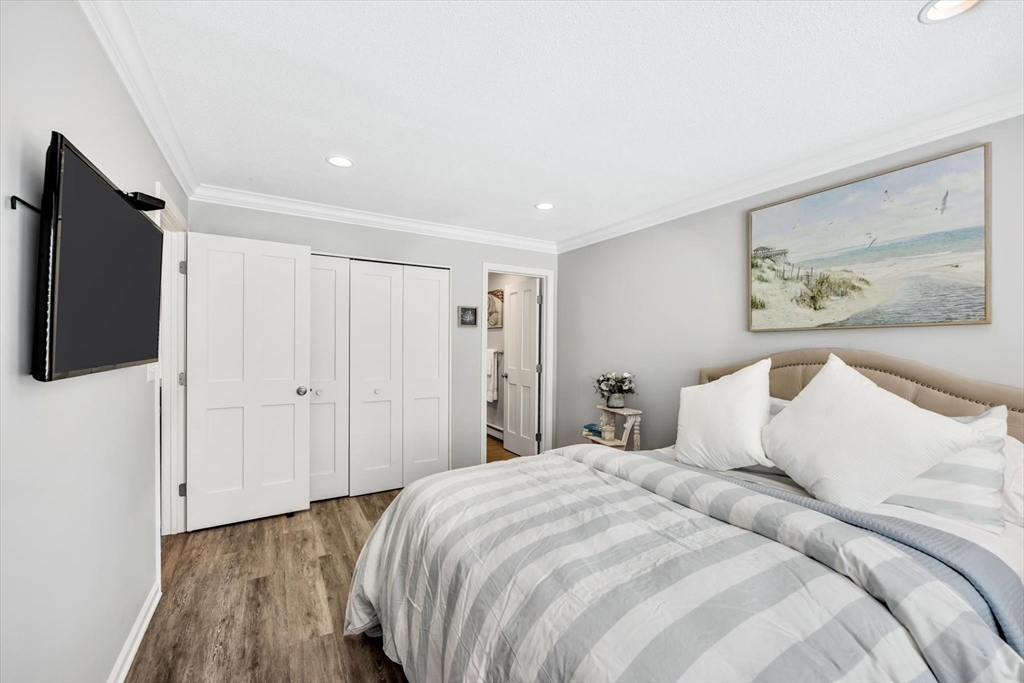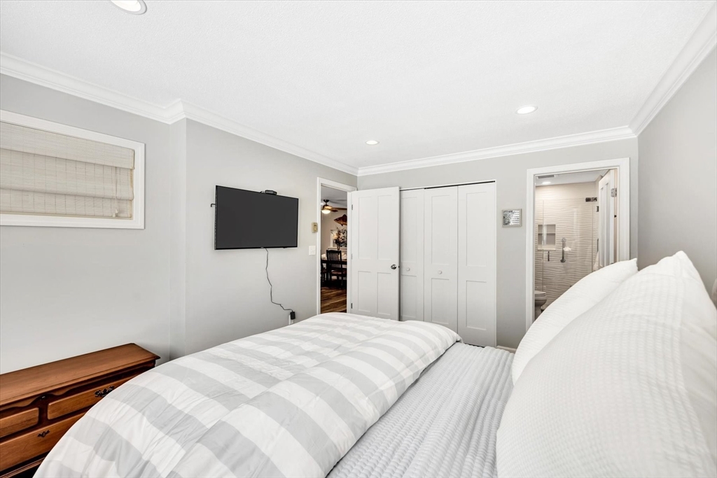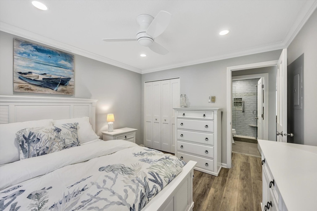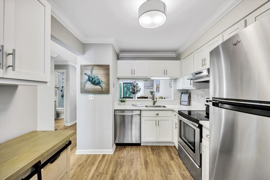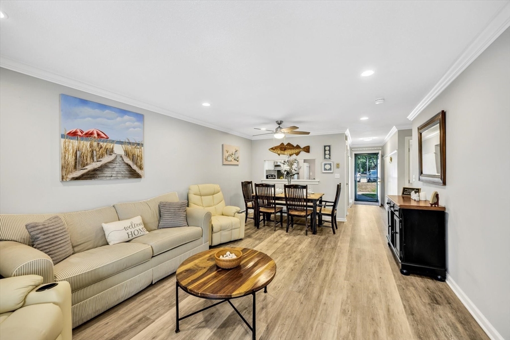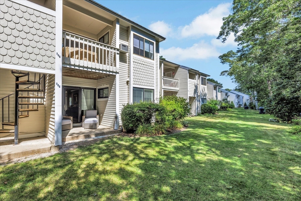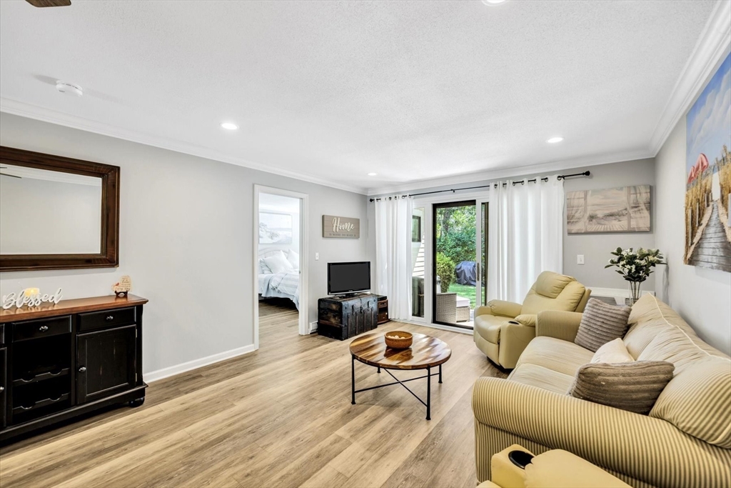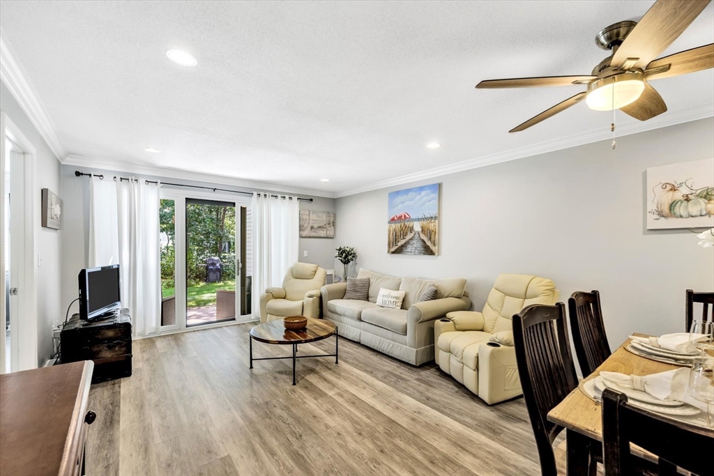 You will fall in love with this beautiful Garden-Style 2-bedroom, 2-bath entry level condominium in Eaton Village at Ocean Edge Resort. This unit offers comfort, style, and a picturesque view of the Jack Nicklaus Designed Private Golf Course. Step inside to find a spacious living and dining room combo with elegant crown molding throughout and modern recessed lighting, creating a warm and inviting atmosphere. The updated kitchen features stainless steel appliances, perfect for cooking and entertaining. Enjoy indoor-outdoor living with a newer sliding glass door that opens to your private patio area, ideal for relaxing and taking in the serene golf course views. Both bathrooms have been renovated, featuring stunning walk-in tiled showers that add a touch of luxury. Convenient to the Cape Cod Bike Trail, restaurants, shops, and beautiful Cape Cod Bay beaches. Don't miss your opportunity to experience the Ocean Edge lifestyle.