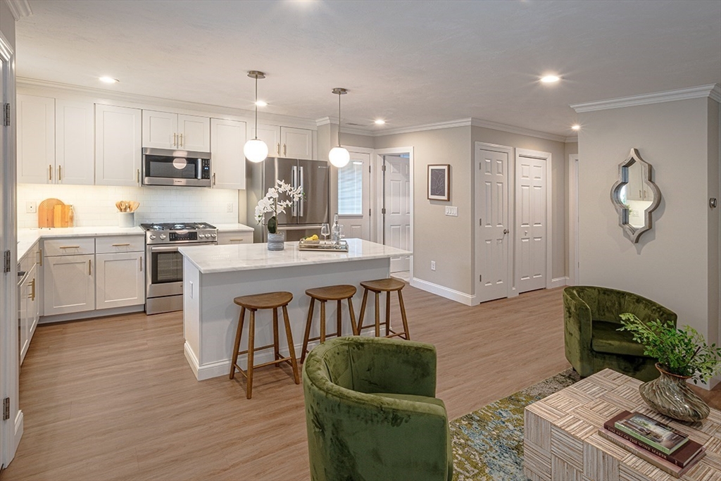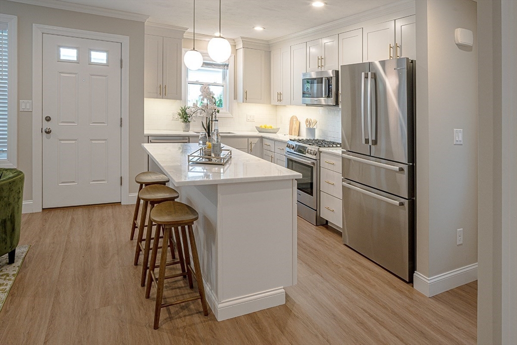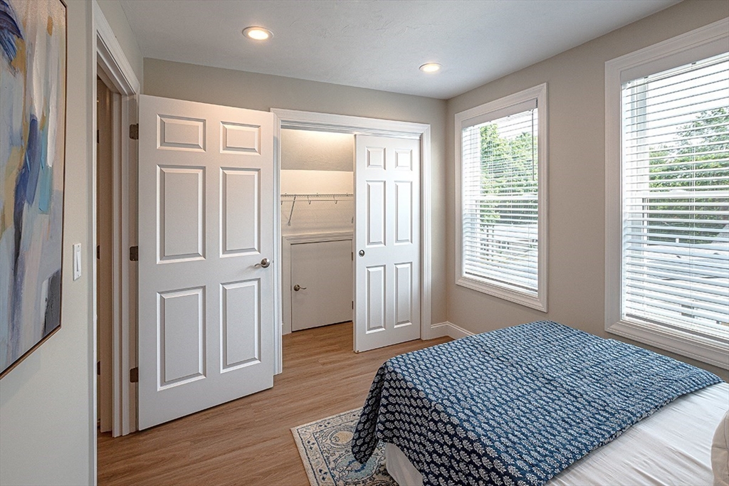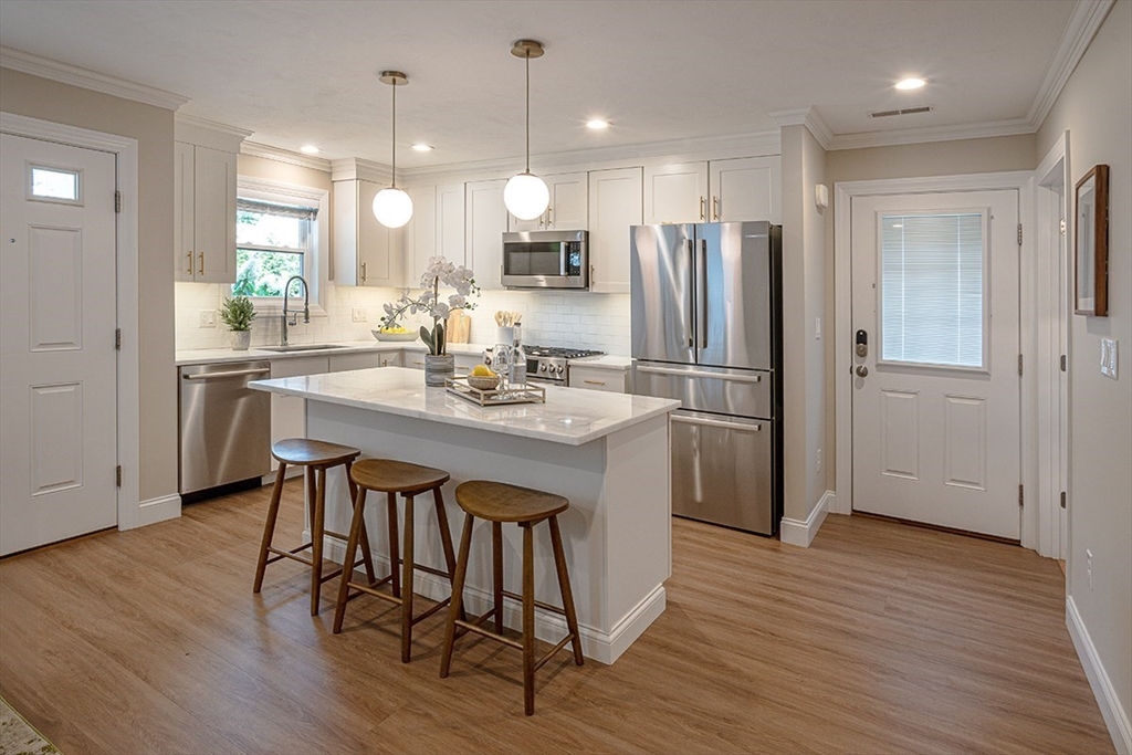 Discover one of the finest units in Pine Hill Crossing, Bedford – a meticulously maintained 3 bedroom, 2.5 bathroom DETACHED TOWNHOUSE condo offering the perfect single-family alternative. This exceptionally well-designed home features beautiful engineered hardwood flooring throughout and elegant recessed lighting. The first floor showcases a stunning open floor plan where the well-appointed kitchen, dining area, and living room flow seamlessly together, creating an ideal space for entertaining. The kitchen features premium Bosch stainless steel appliances and striking quartzite countertop. The first-floor master suite includes a spacious walk-in closet, while the second floor offers two additional bedrooms and a full bathroom. Located in quiet neighborhood with playground within complex-- ideal for families seeking both comfort and community.