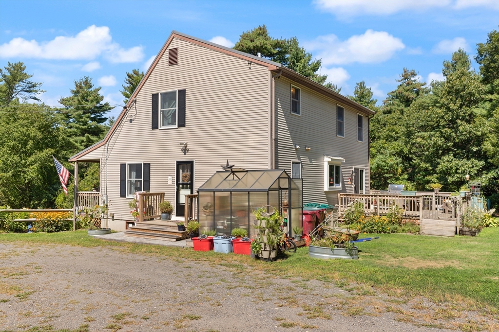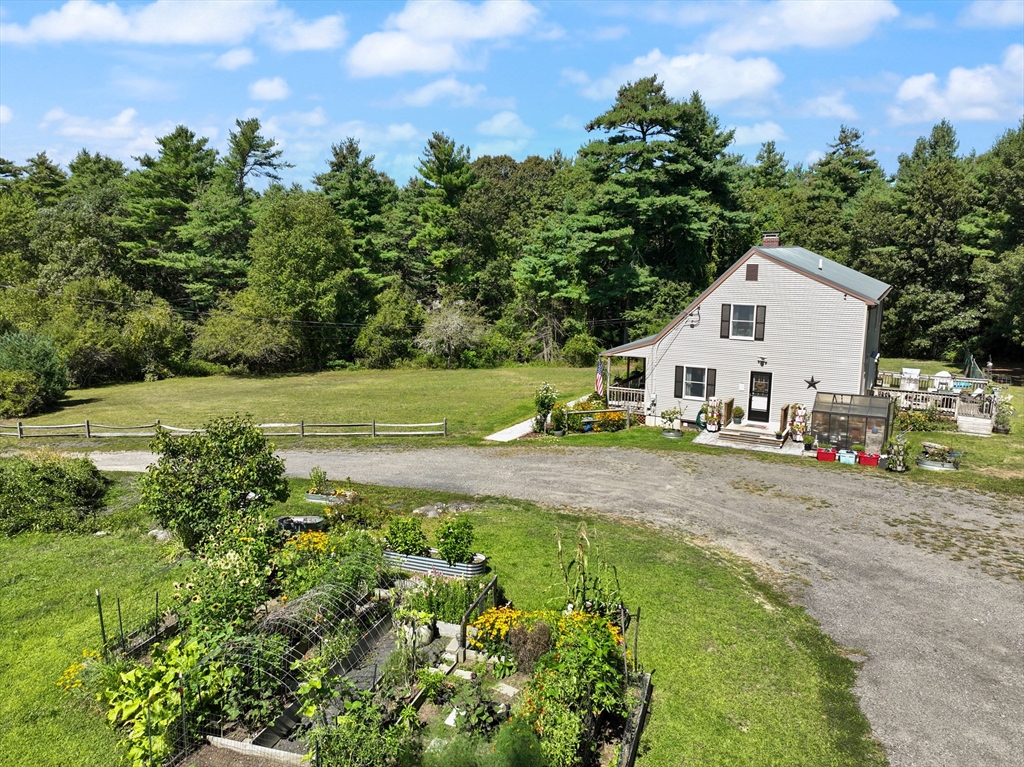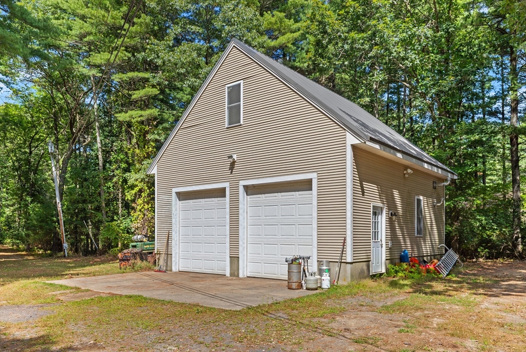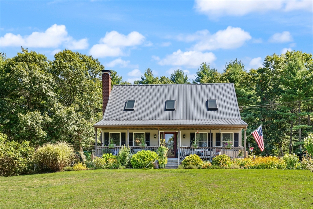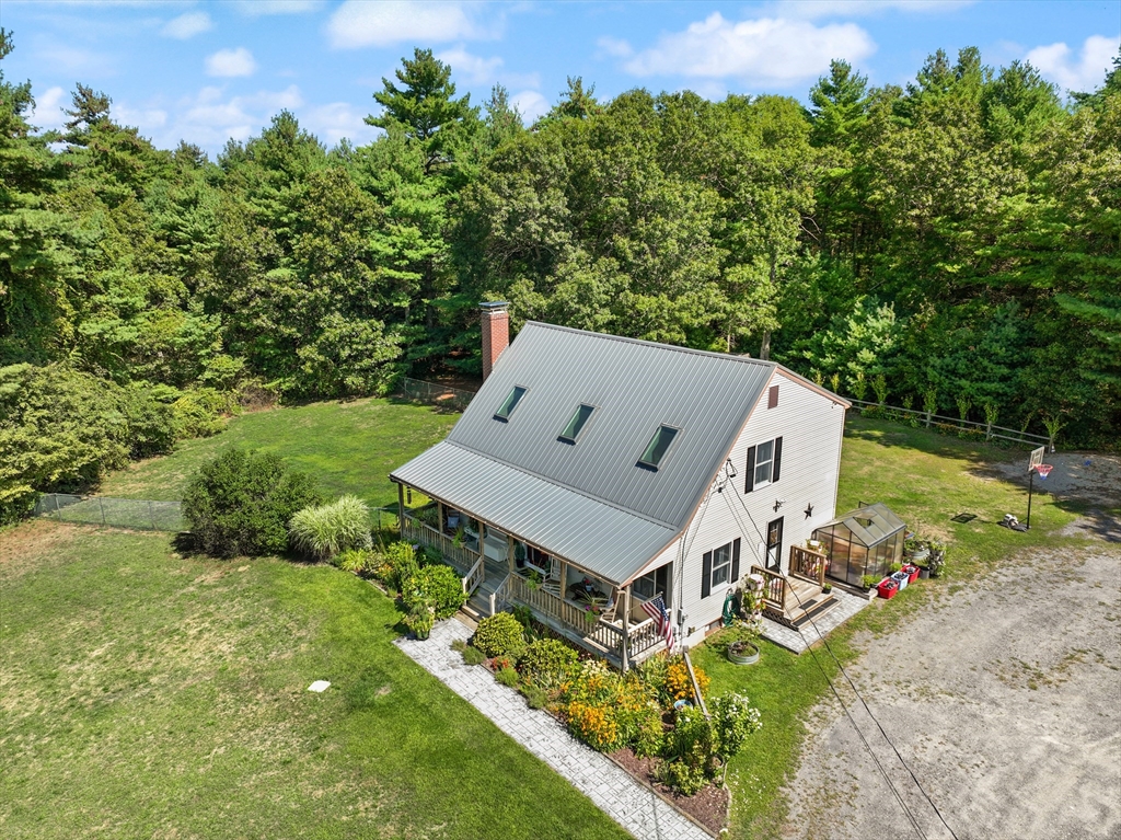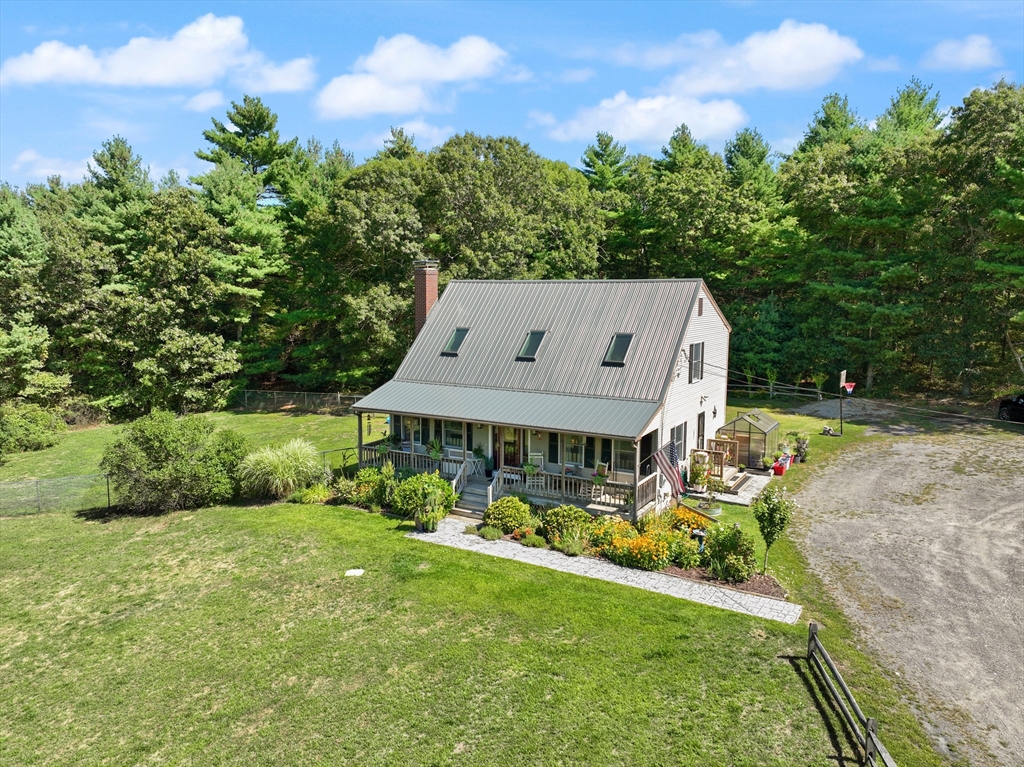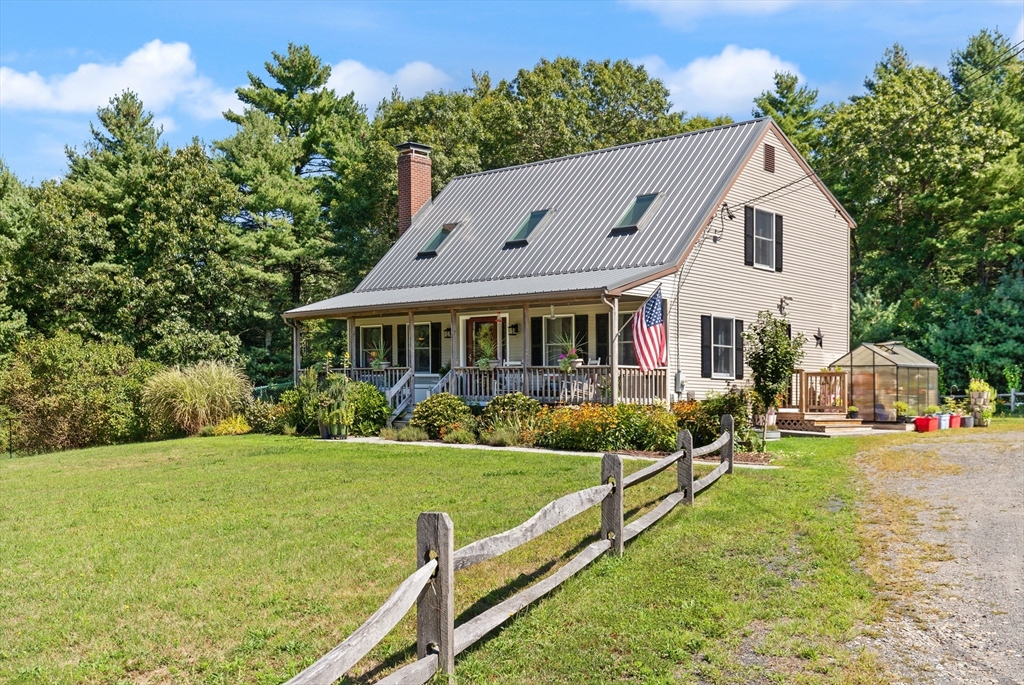Charming and peaceful Cape-style retreat set on 6.15 acres of serene, nature-filled land in close proximity to Routes 3 & 44. This beautifully updated 4-bedroom, 2-bathroom home offers cozy comfort with modern touches throughout. Step onto the inviting farmer’s porch and into a warm, light-filled interior featuring skylights, a wood stove, and a thoughtful layout perfect for everyday living. The spacious kitchen is a dream with quartz countertops, a large center island, and stainless steel appliances. The primary suite offers a full master bathroom and walk-in closet. Outside, enjoy a fully fenced yard, dedicated garden space, and the tranquil beauty of the surrounding woods. A two-bay detached garage with a full second floor provides excellent storage or potential for expansion. Additional highlights include a durable metal roof, a propane-powered generator for peace of mind, and numerous recent updates.