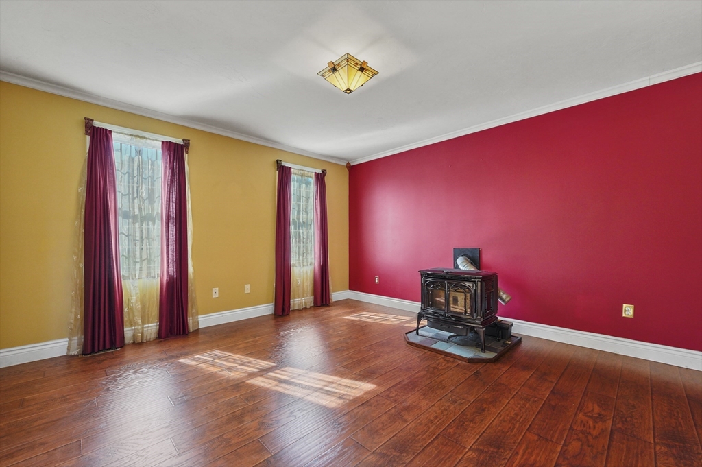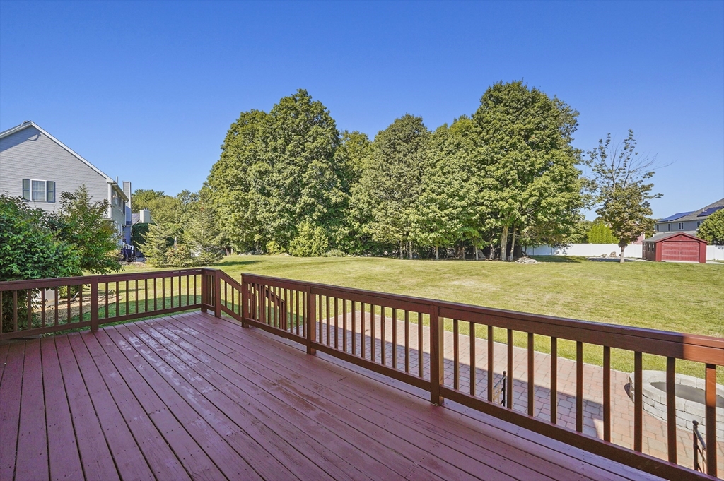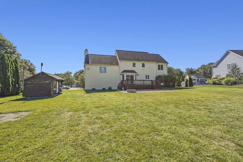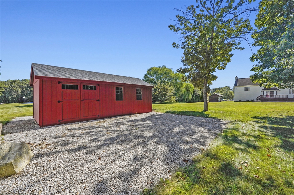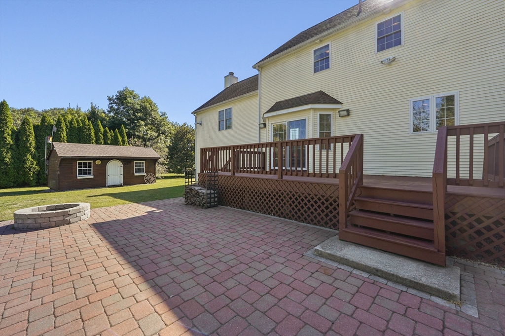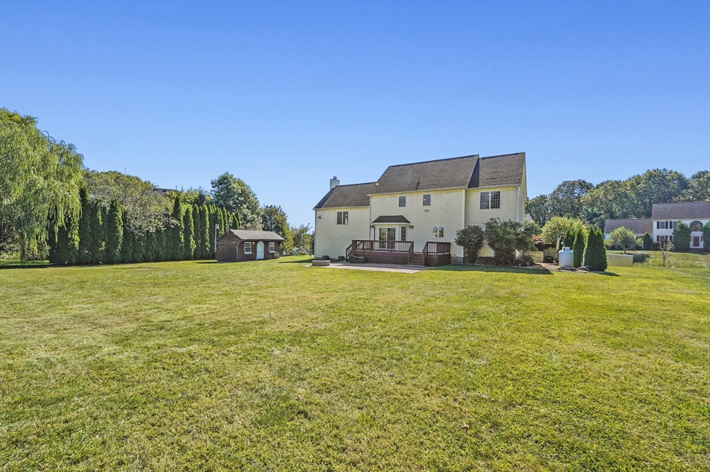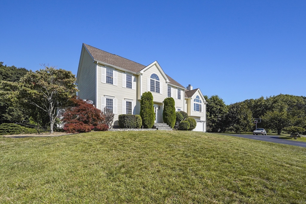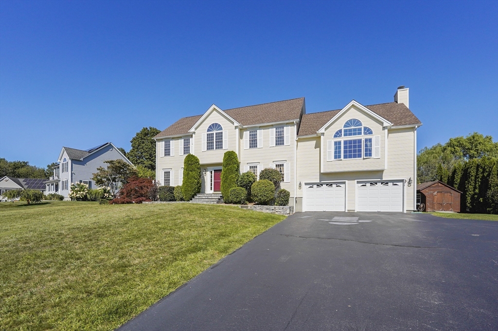 Stunning oversized Colonial in desirable Orchard Estates! This house sits proud on a beautiful corner lot, and includes an oversized driveway, two car garage, and two large sheds. The first floor showcases a living room with a pellet stove, dining room with hardwood floors, an eat in kitchen with a large center island, stone counters, and stainless appliances. Hallway off the kitchen leads to a half bath and a separate laundry room. Sliders off the kitchen to a 10x20 deck and a custom brick patio with built in fire pit, all looking over the fantastic and expansive level back lawn. Just a few steps up from the kitchen is the cathedral ceiling great room with both a wood fireplace and a pellet stove. The second floor has a primary suite with cathedral ceilings, a stunning cedar walk in closet, and a full bath. Three guest bedrooms and an additional full bath complete this level. The basement has a large finished bonus room with a 3/4 bath. You have been waiting for this home!