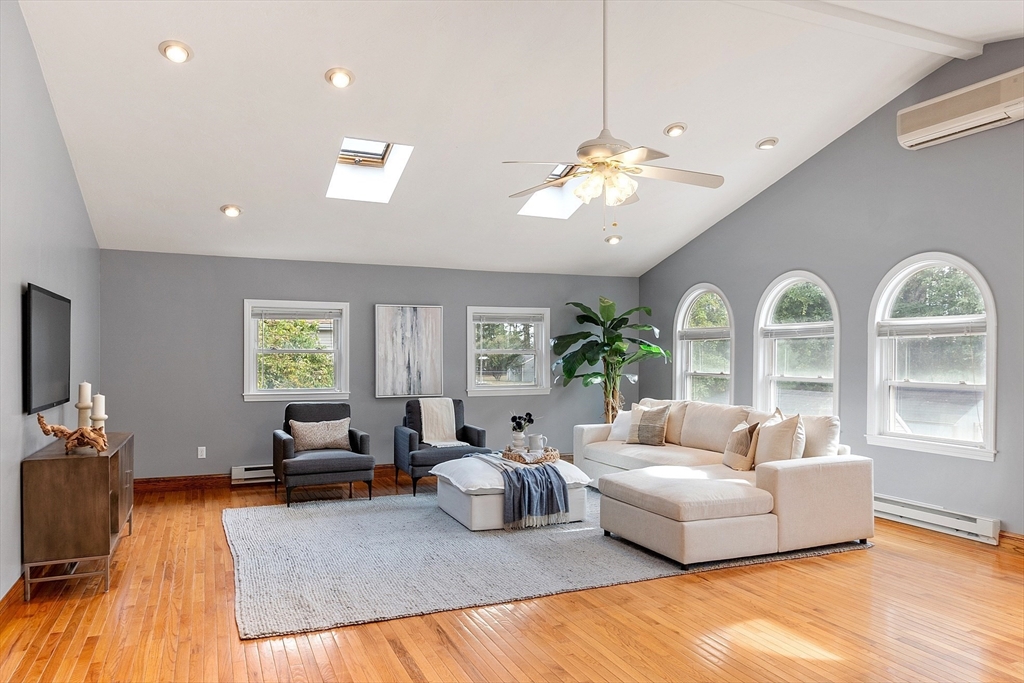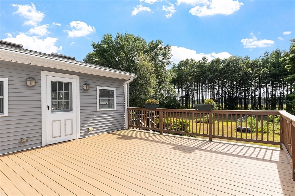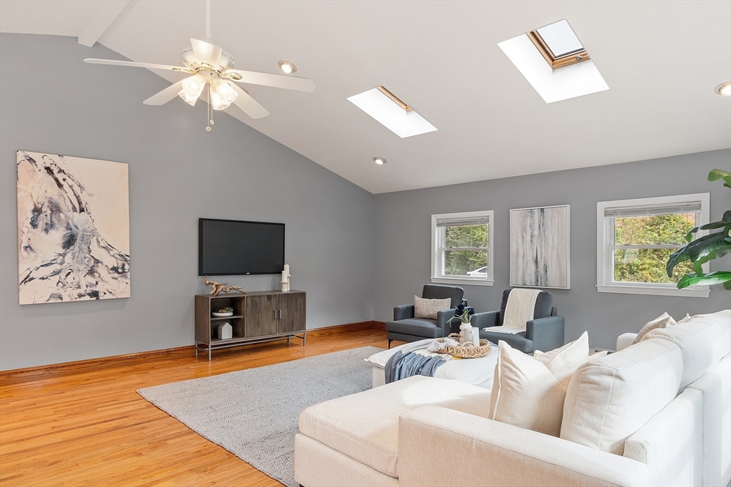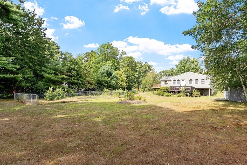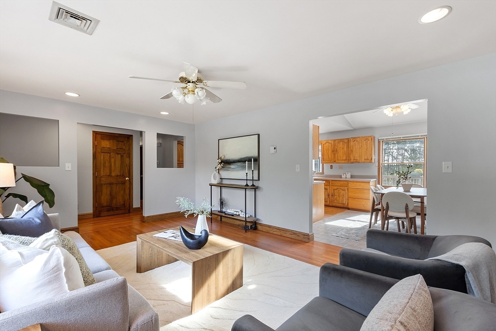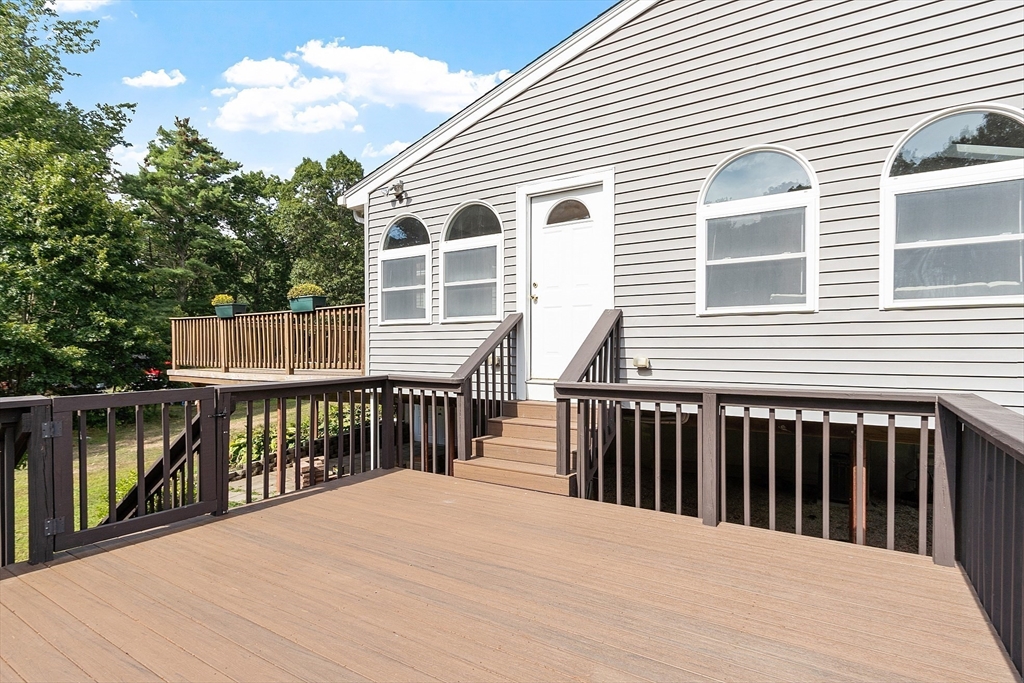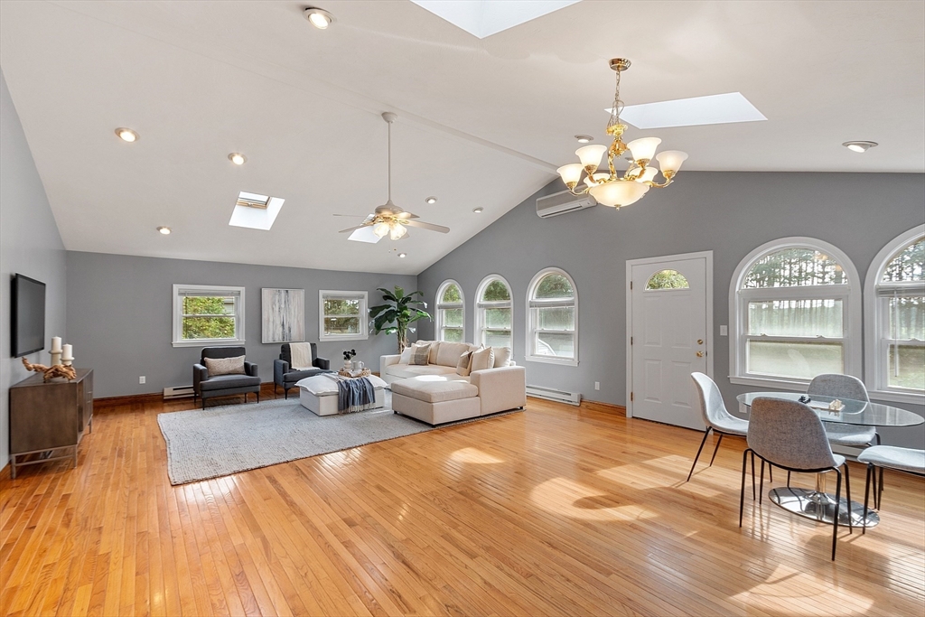 Sunlight streams through this home creating an ever-changing dance of natural light. The expansive Great Room serves as the heart of the home, walls of windows frame serene views. This versatile space flows seamlessly into the kitchen featuring its own skylight-lit dining area. Single-level living offers effortless convenience on the main floor, while the lower level doubles the entertainment possibilities. This finished area includes a dedicated office work out room, plus a versatile family room complete w/wet bar, built-in mini fridge & cooktop. Each bedroom showcases rich HW flooring, creating a harmonious flow throughout. The living room presents exciting possibilities, easily transformable into a formal dining room. The private backyard, with 2 decks, opens to pastoral views of distant cranberry bogs, offering a uniquely peaceful New England backdrop. Additional features: maintenance free exterior, generator, roof 2020, hot H20 heater 2023. Offers due Tuesday, Sept 9th at noon.