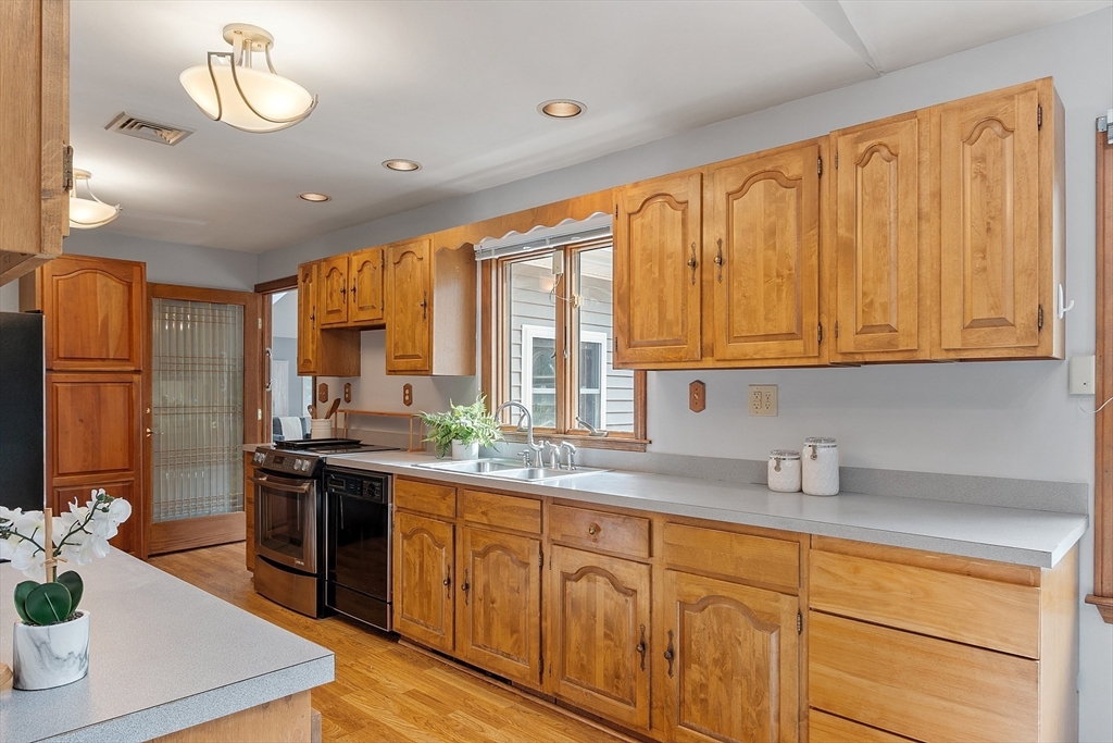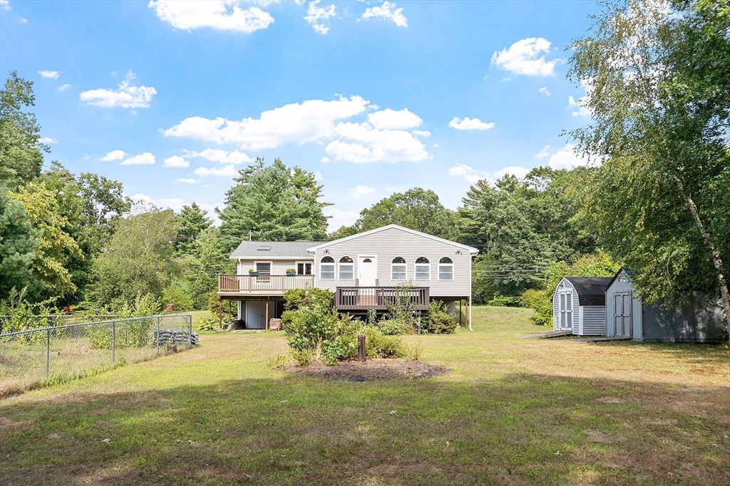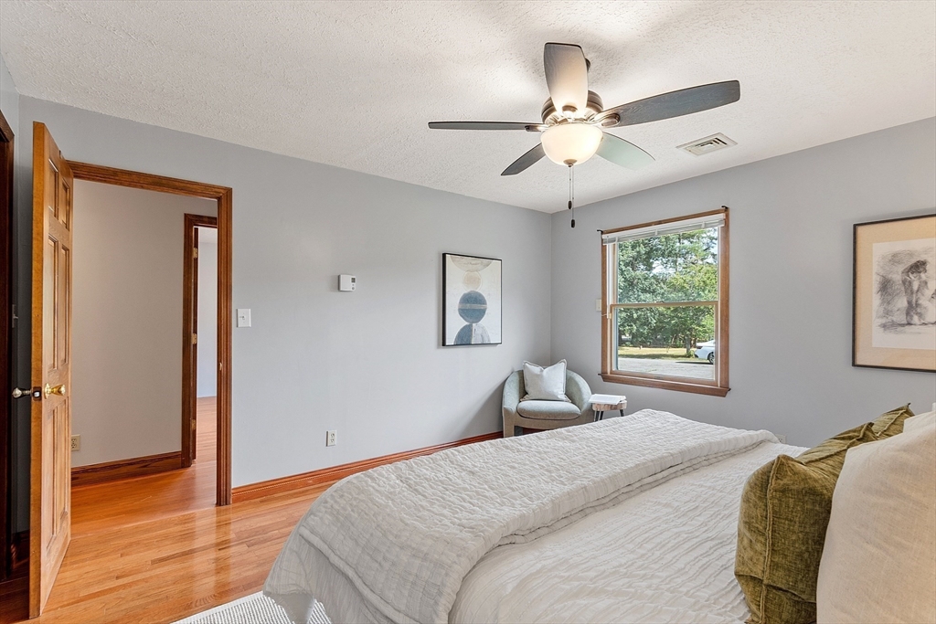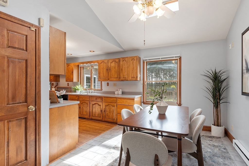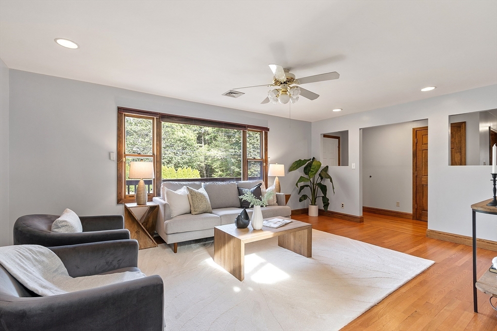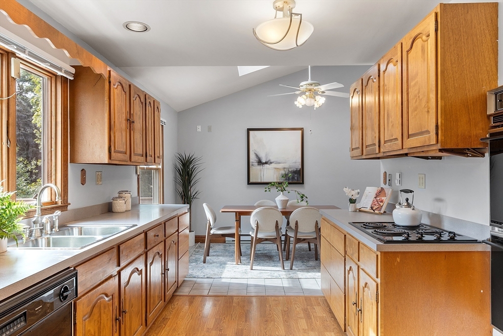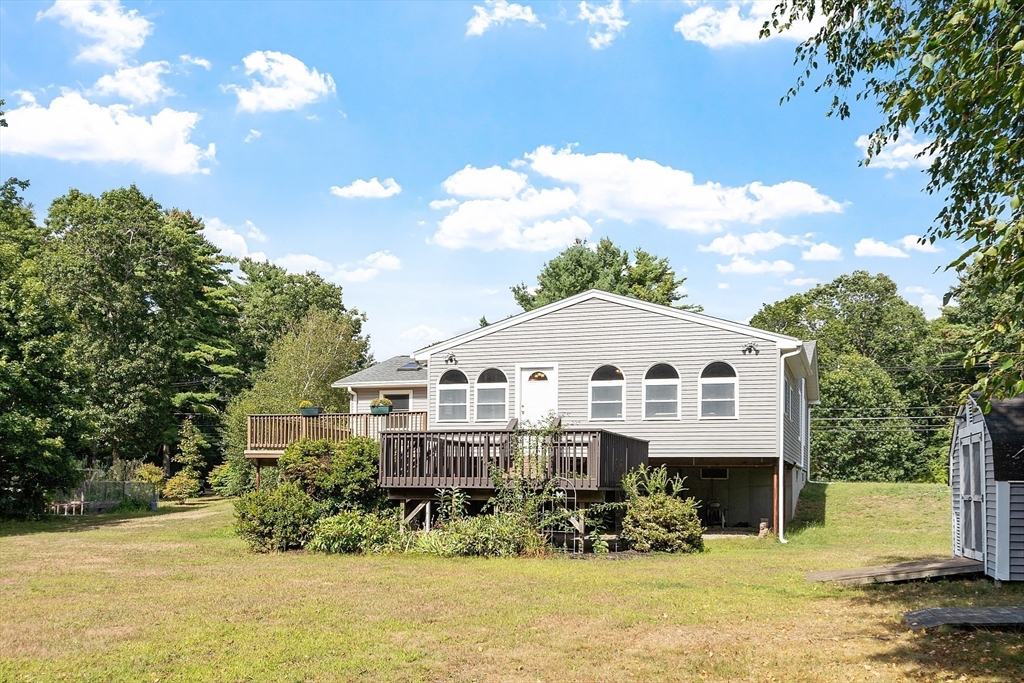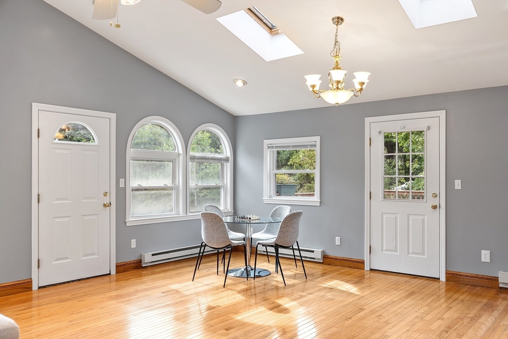 Sunlight streams through this home creating an ever-changing dance of natural light. The expansive Great Room serves as the heart of the home, walls of windows frame serene views. This versatile space flows seamlessly into the kitchen featuring its own skylight-lit dining area. Single-level living offers effortless convenience on the main floor, while the lower level doubles the entertainment possibilities. This finished area includes a dedicated office work out room, plus a versatile family room complete w/wet bar, built-in mini fridge & cooktop. Each bedroom showcases rich HW flooring, creating a harmonious flow throughout. The living room presents exciting possibilities, easily transformable into a formal dining room. The private backyard, with 2 decks, opens to pastoral views of distant cranberry bogs, offering a uniquely peaceful New England backdrop. Additional features: maintenance free exterior, generator, roof 2020, hot H20 heater 2023. Offers due Tuesday, Sept 9th at noon.