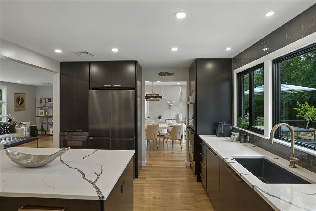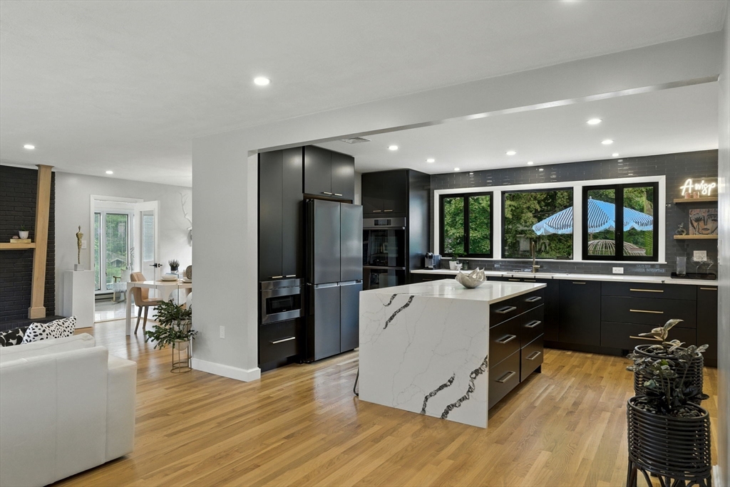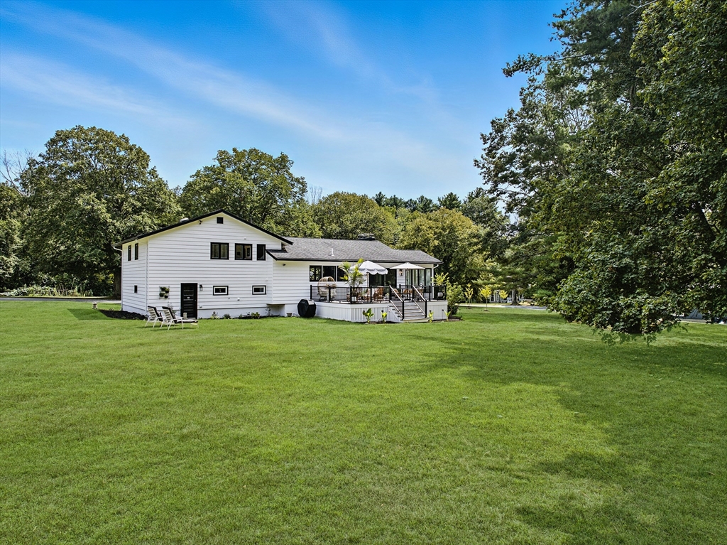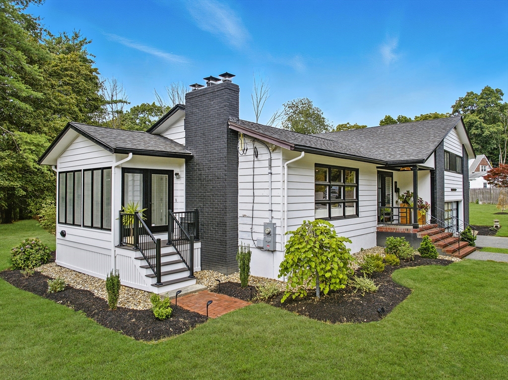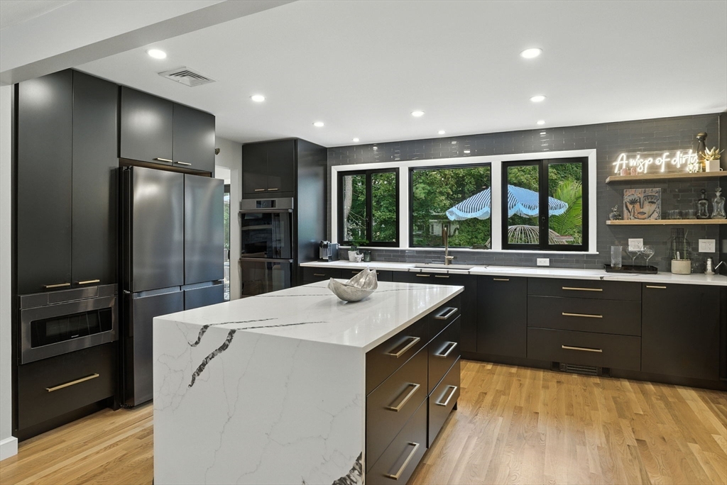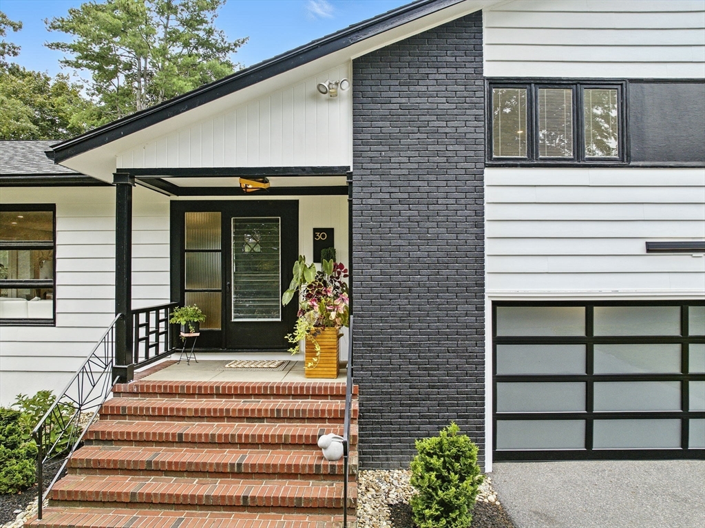 Unicorn: something rare, highly desirable, and nearly impossible to find. 30 Linda Road fit this definition perfectly. From the curb, its bold black-and-white exterior and glass-panel garage door make a striking statement with hints of Art Deco flair. The main level balances open sightlines with defined spaces that make entertaining effortless. The chef’s kitchen dazzles with sleek black cabinetry, a waterfall-edge island, and professional grade appliances, while an oversized slider floods the dining area with light and opens to a 24’ x 14’ composite deck—perfect for gatherings overlooking the expansive, landscaped yard with room for a pool. A wood-burning fireplace brings warmth to the living room, while the sunroom offers a serene retreat. Upstairs, three spacious bedrooms feature hardwood floors and recessed lighting. A semi-finished lower level with wood burning fireplace provides endless flexibility for a media lounge or gym. Rare in design and lifestyle, this home is pure magic.