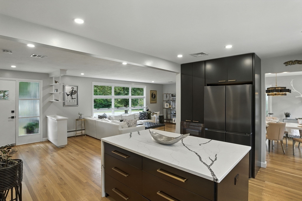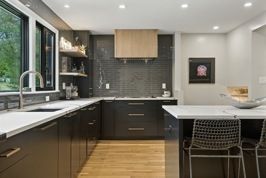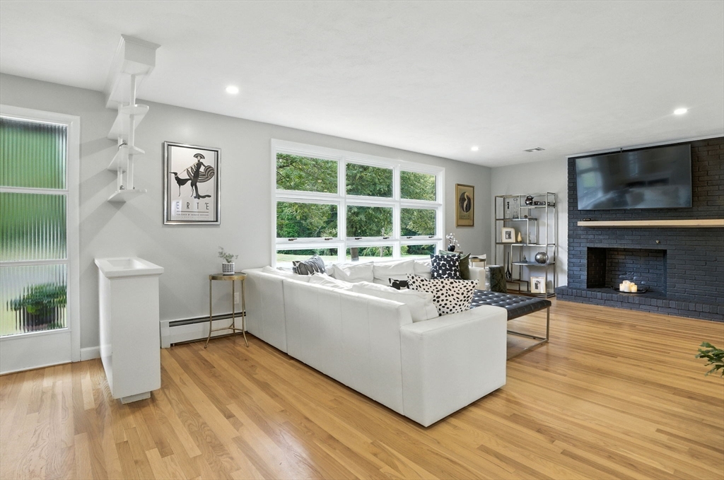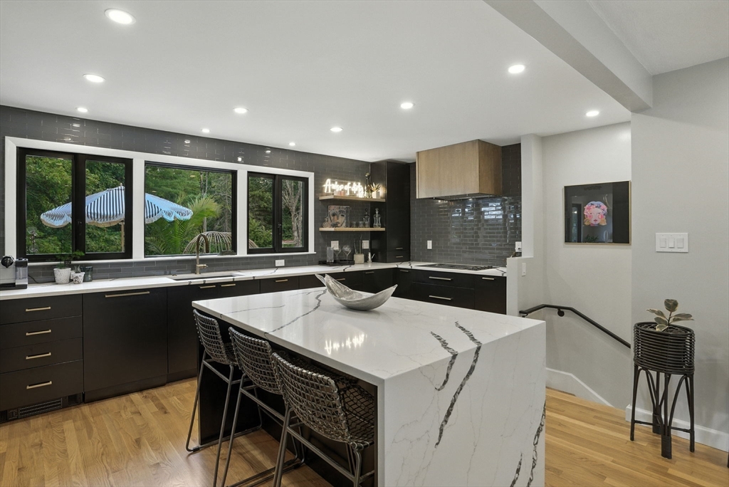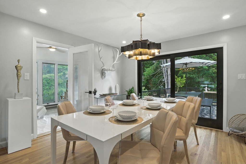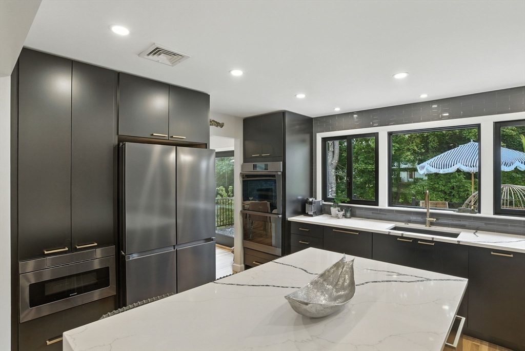 Unicorn: something rare, highly desirable, and nearly impossible to find. 30 Linda Road fit this definition perfectly. From the curb, its bold black-and-white exterior and glass-panel garage door make a striking statement with hints of Art Deco flair. The main level balances open sightlines with defined spaces that make entertaining effortless. The chef’s kitchen dazzles with sleek black cabinetry, a waterfall-edge island, and professional grade appliances, while an oversized slider floods the dining area with light and opens to a 24’ x 14’ composite deck—perfect for gatherings overlooking the expansive, landscaped yard with room for a pool. A wood-burning fireplace brings warmth to the living room, while the sunroom offers a serene retreat. Upstairs, three spacious bedrooms feature hardwood floors and recessed lighting. A semi-finished lower level with wood burning fireplace provides endless flexibility for a media lounge or gym. Rare in design and lifestyle, this home is pure magic.
