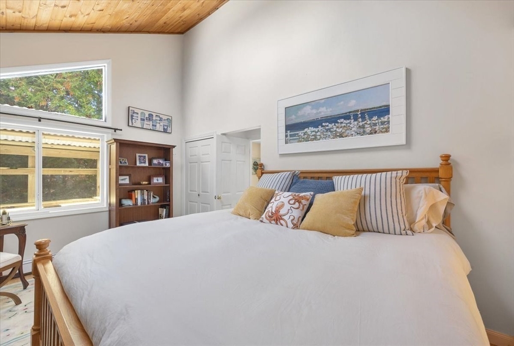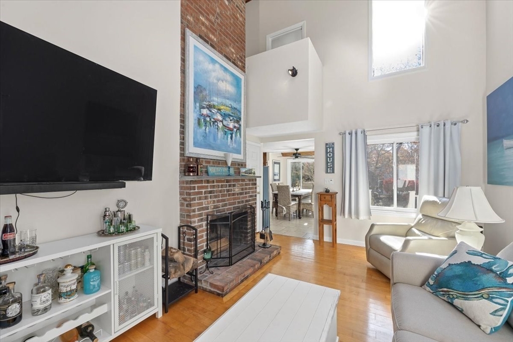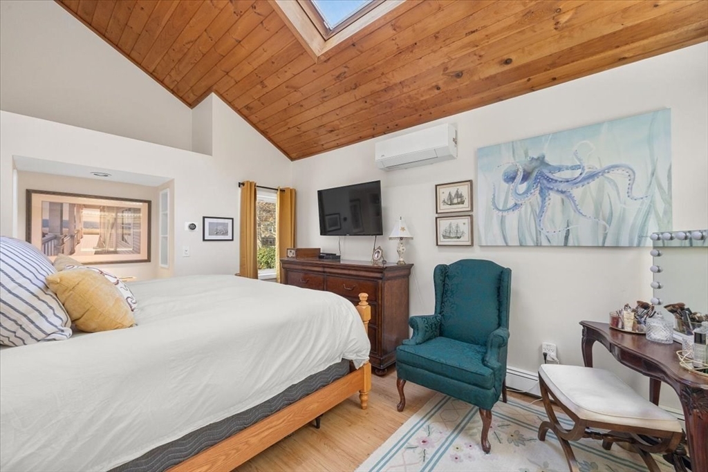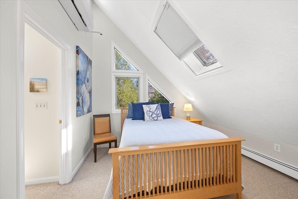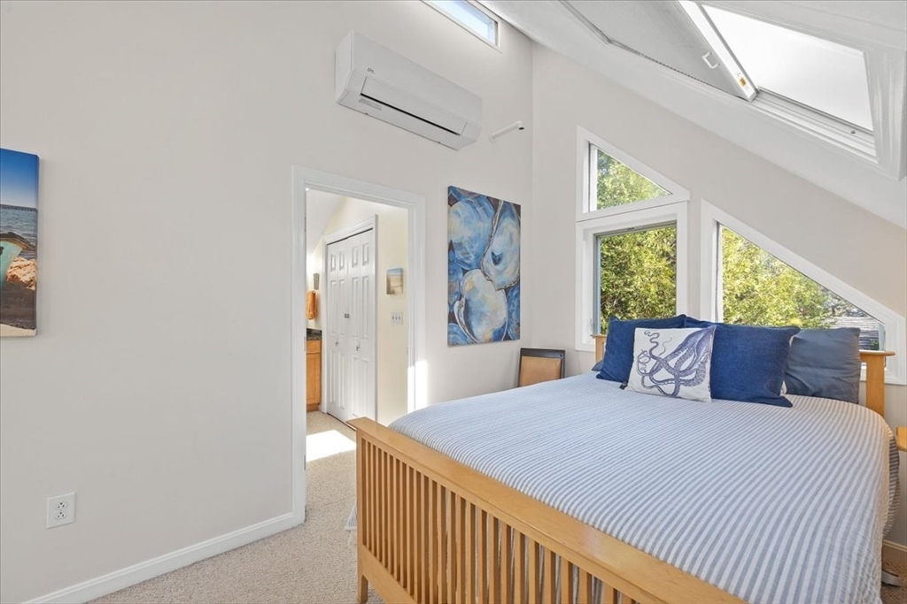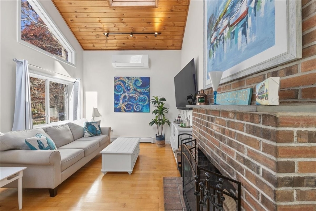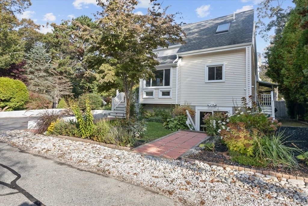 Nothing beats living near the beach! Welcome to Ocean Aire Estates! Feel like you are on vacation year round in this updated contemporary style home that has a cool vibe and is one block from the beach access. The main level is open and bright with cathedral ceilings, skylights and tons of natural light. The living room has a beautiful wood planked ceiling and a floor to ceiling brick fireplace. The kitchen is updated and has a spacious dining area with large sliding windows. A bedroom and full bathroom complete the first floor. The primary bedroom is on the second floor and has it's own bathroom and walk-in closet. The third bedroom is in the finished lower level which has a walk-out through a sliding glass door and added recessed lighting making the space perfect for a family room, media room, game room or office space. Recent updates include flooring, mini-splits for AC, both bathrooms, composite decks, and the house has been vinyl sided. This move-in ready home is a must see!